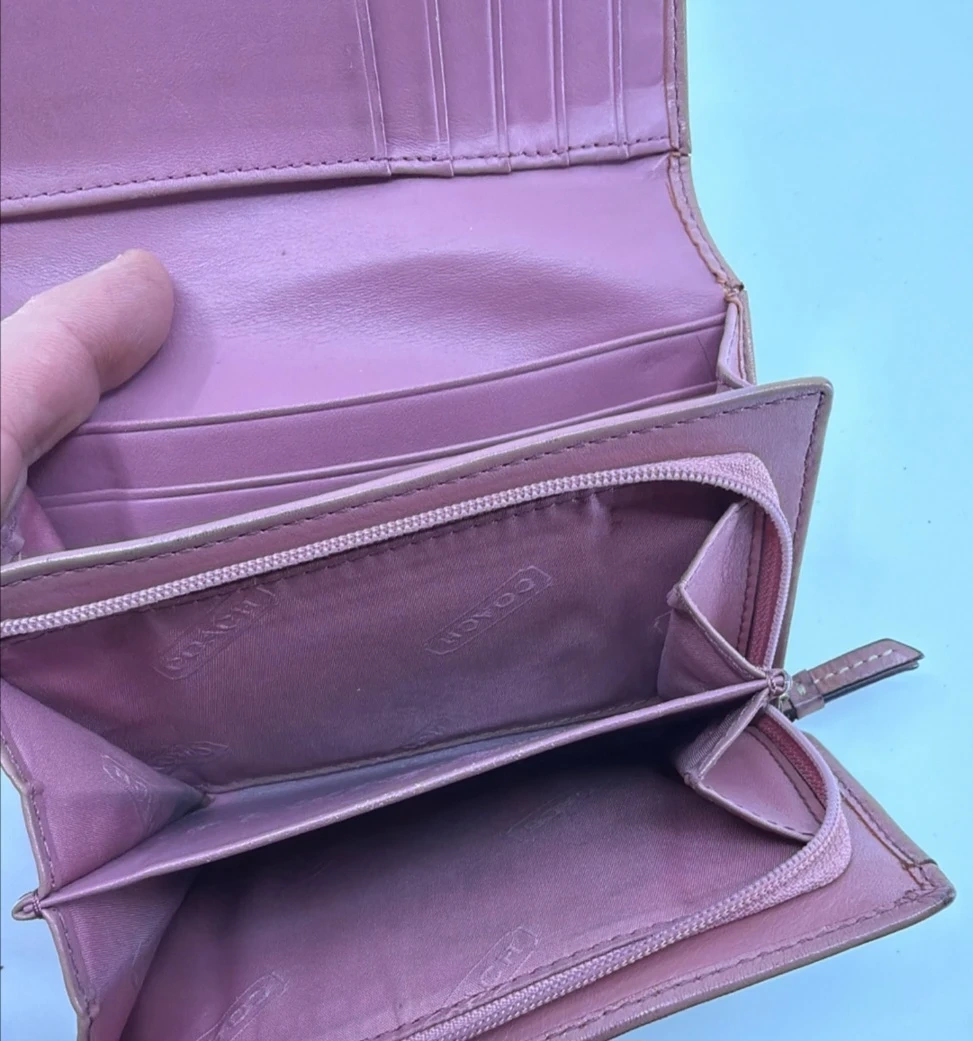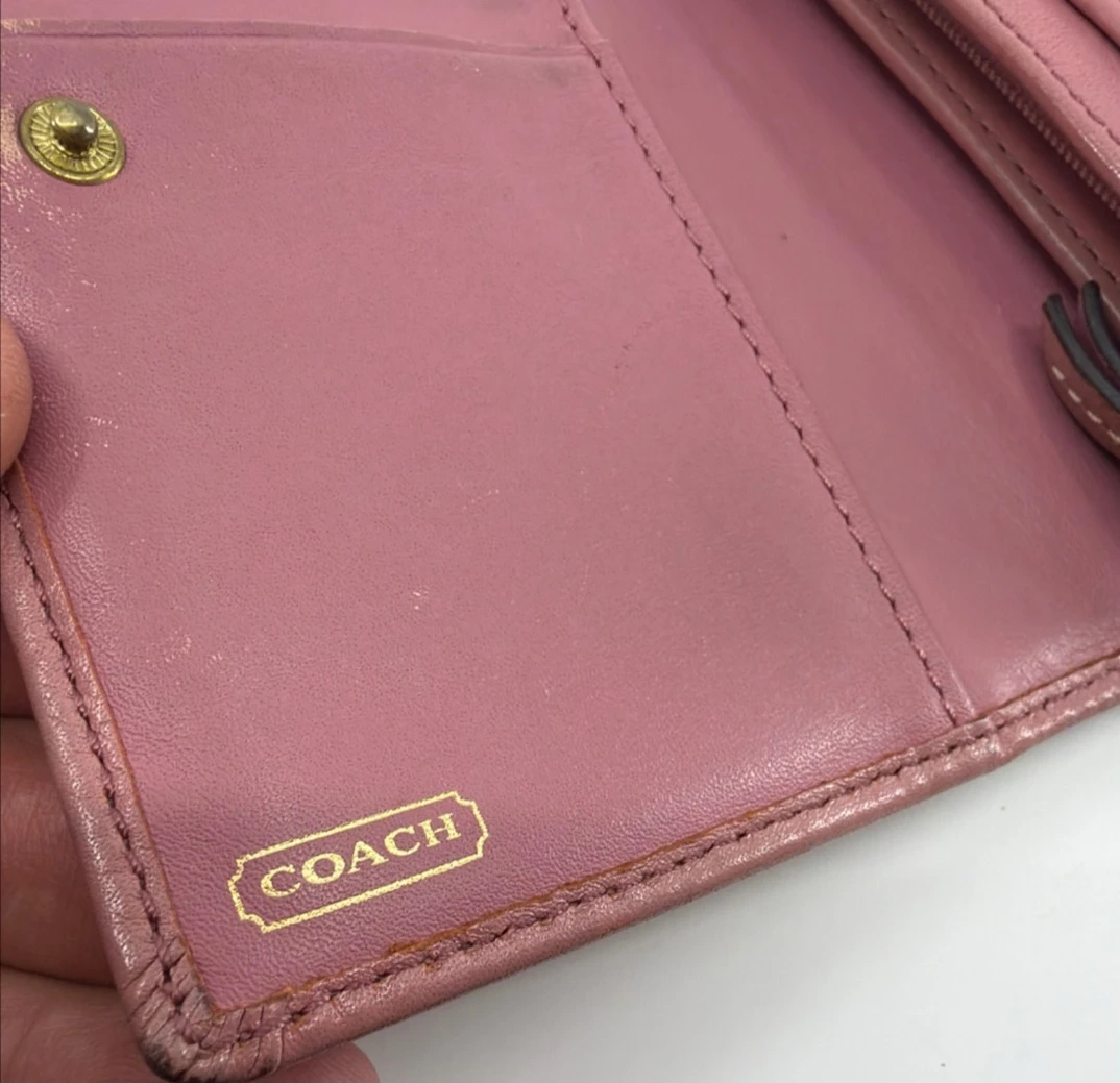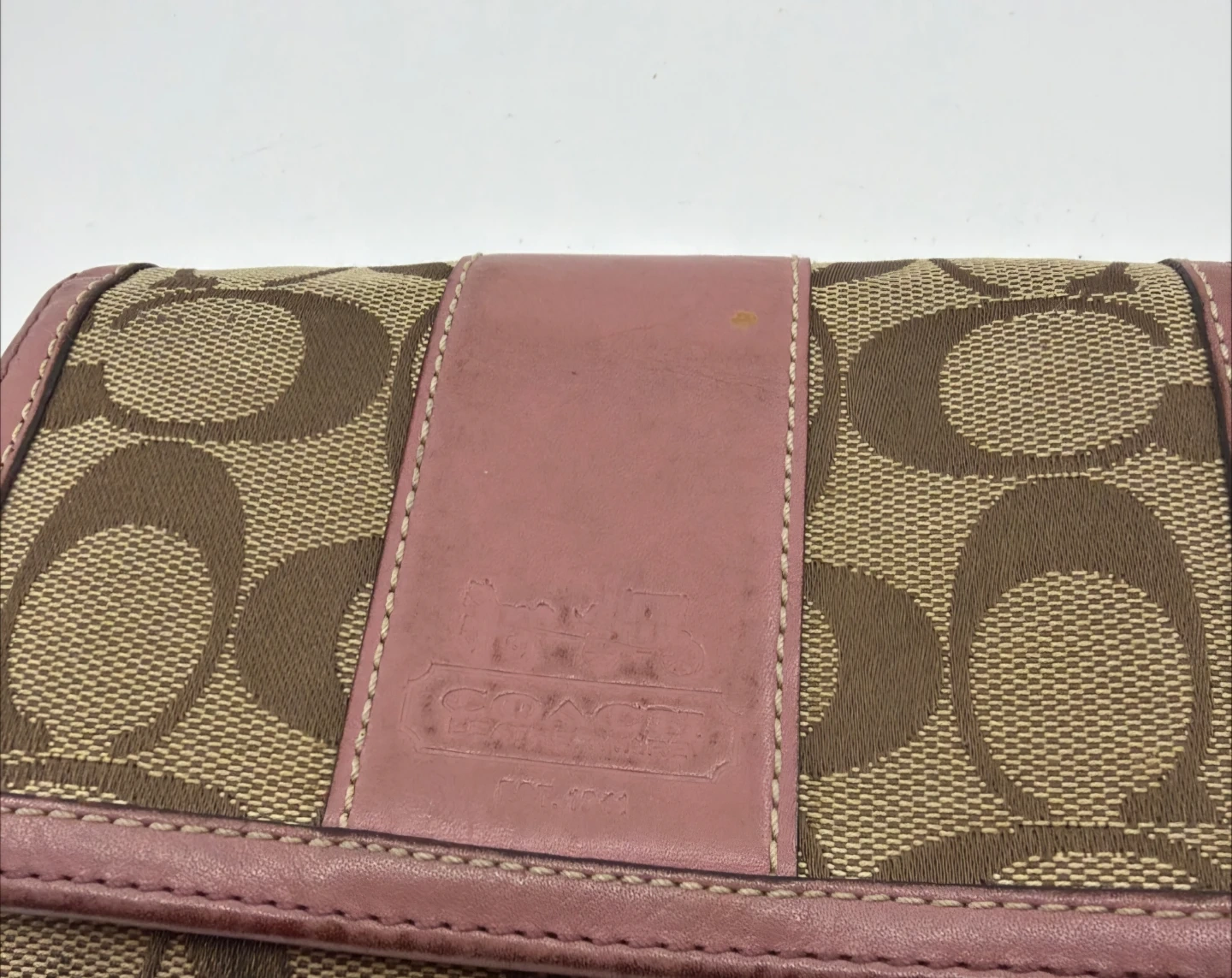 This Coach wallet features the signature C monogram canvas with pink leather accents. It's a trifold design with multiple card slots inside. It has a snap closure to keep your essentials secure.