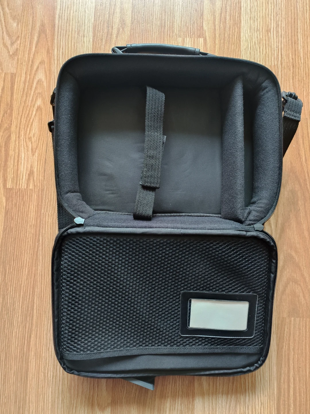This InFocus carrying case is black with a padded interior and adjustable dividers. It features a comfortable top handle and a detachable, adjustable shoulder strap. It's perfect for safely transporting electronics or other small items.
