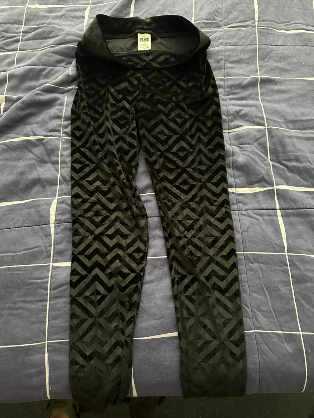 Black velvet leggings. Geometric print. Size small. Soft material. Excellent for fall and winter. I need to clean up my closet.