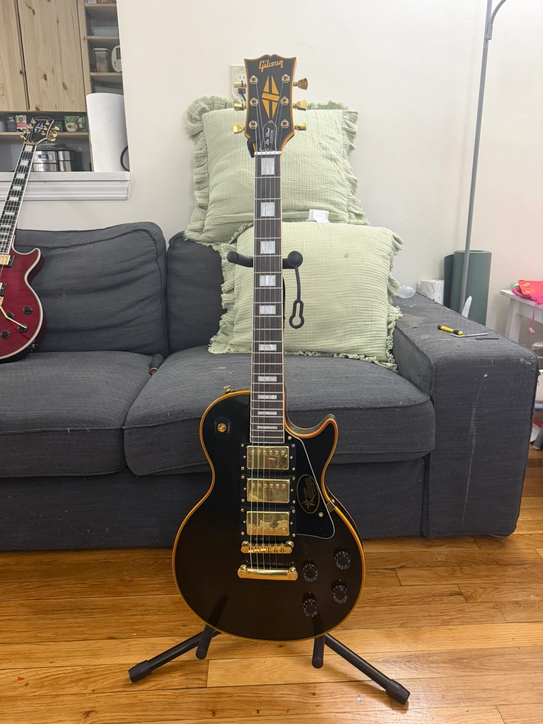 This is a Les Paul Custom electric guitar. It has a black finish with gold hardware. It's a classic choice for guitarists!