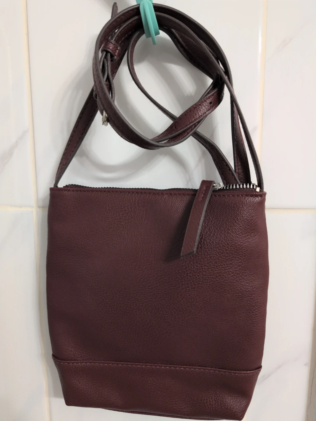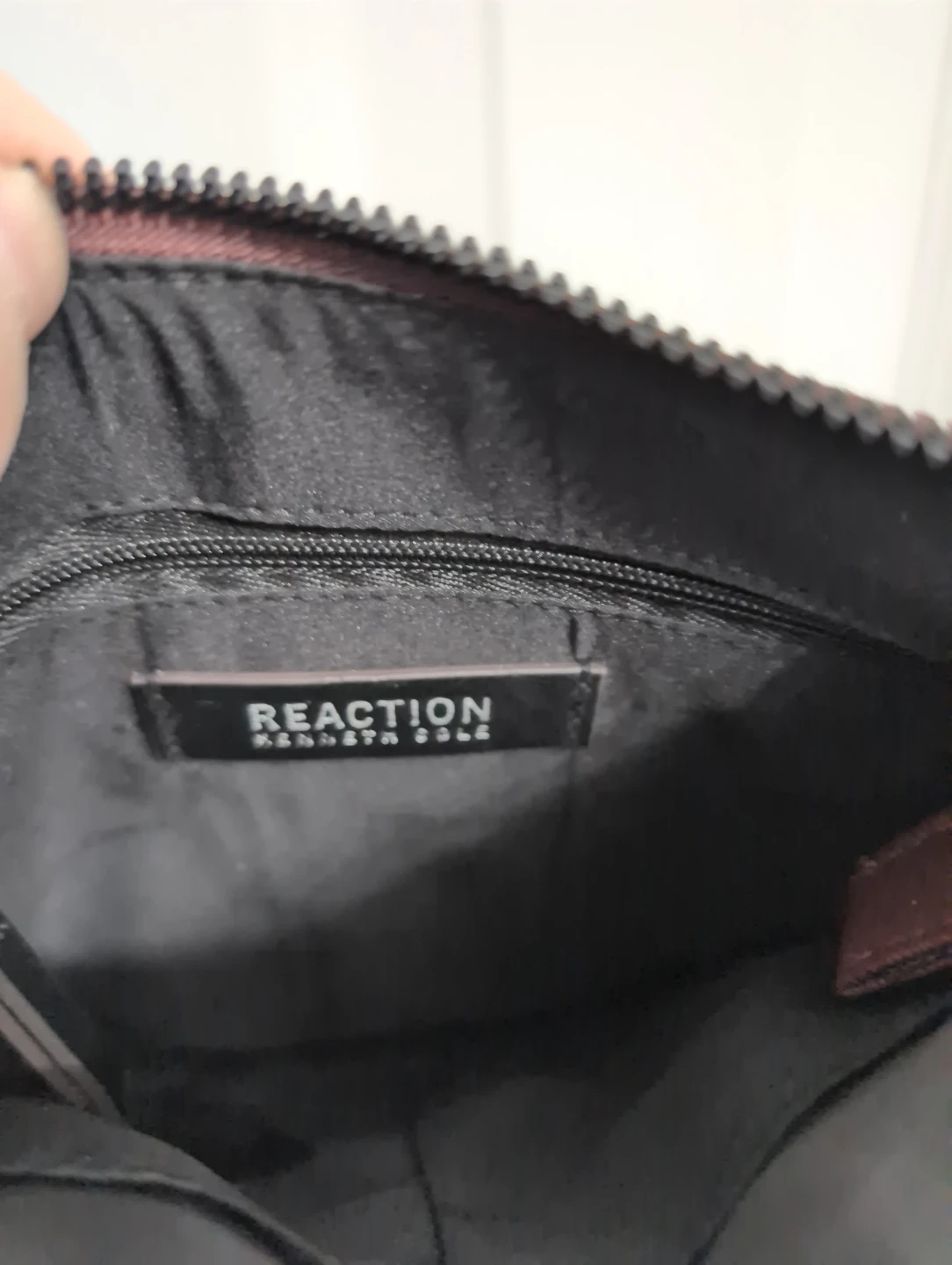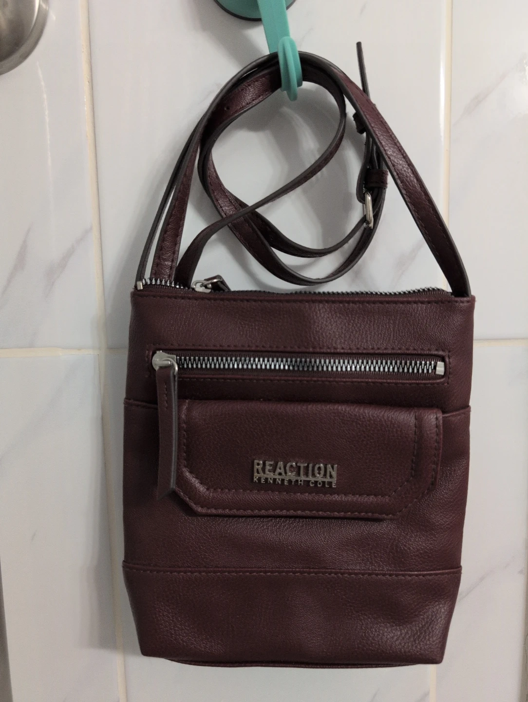 This burgundy crossbody bag is from REACTION KENNETH COLE. It has a front zippered pocket and a main zippered compartment. The strap is adjustable.