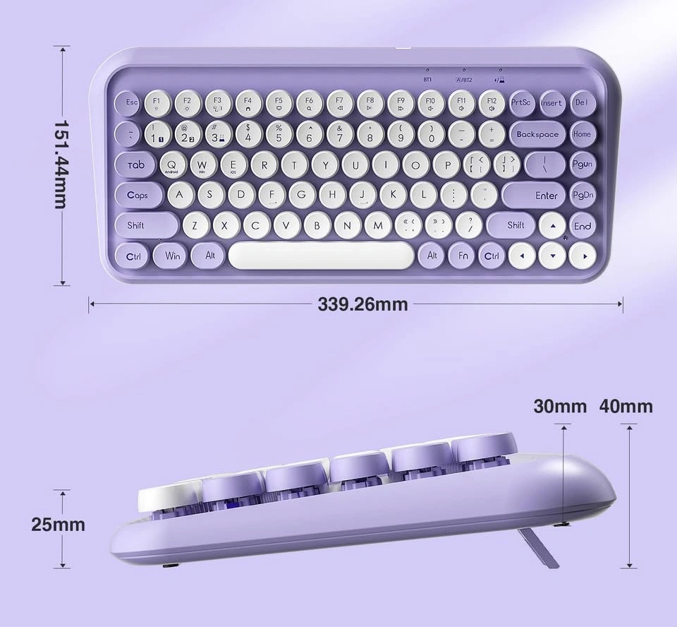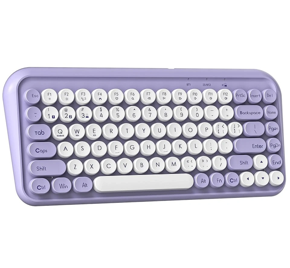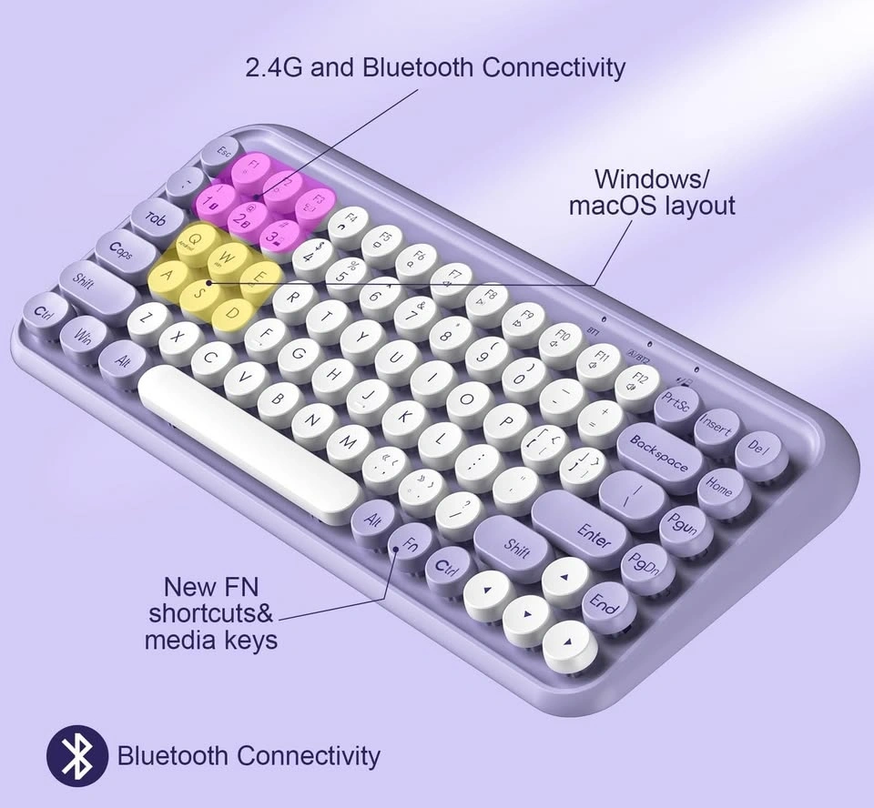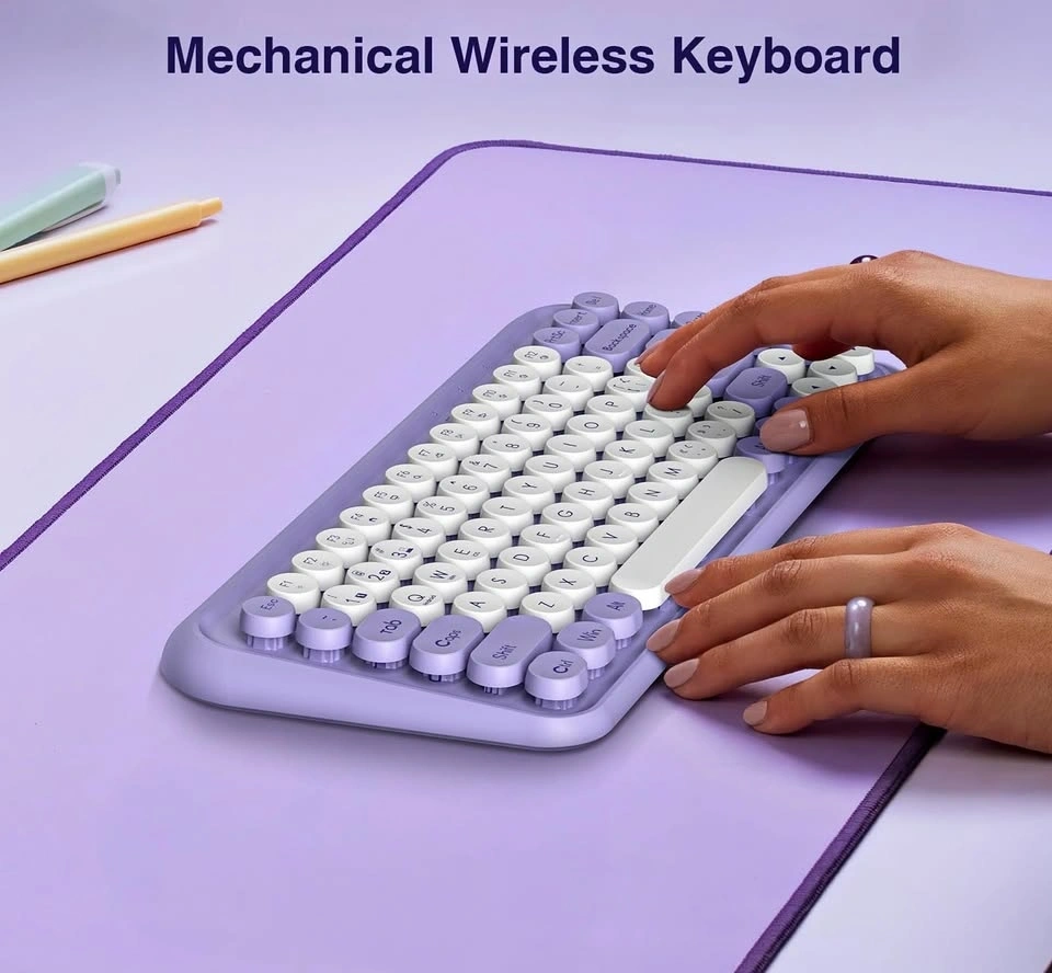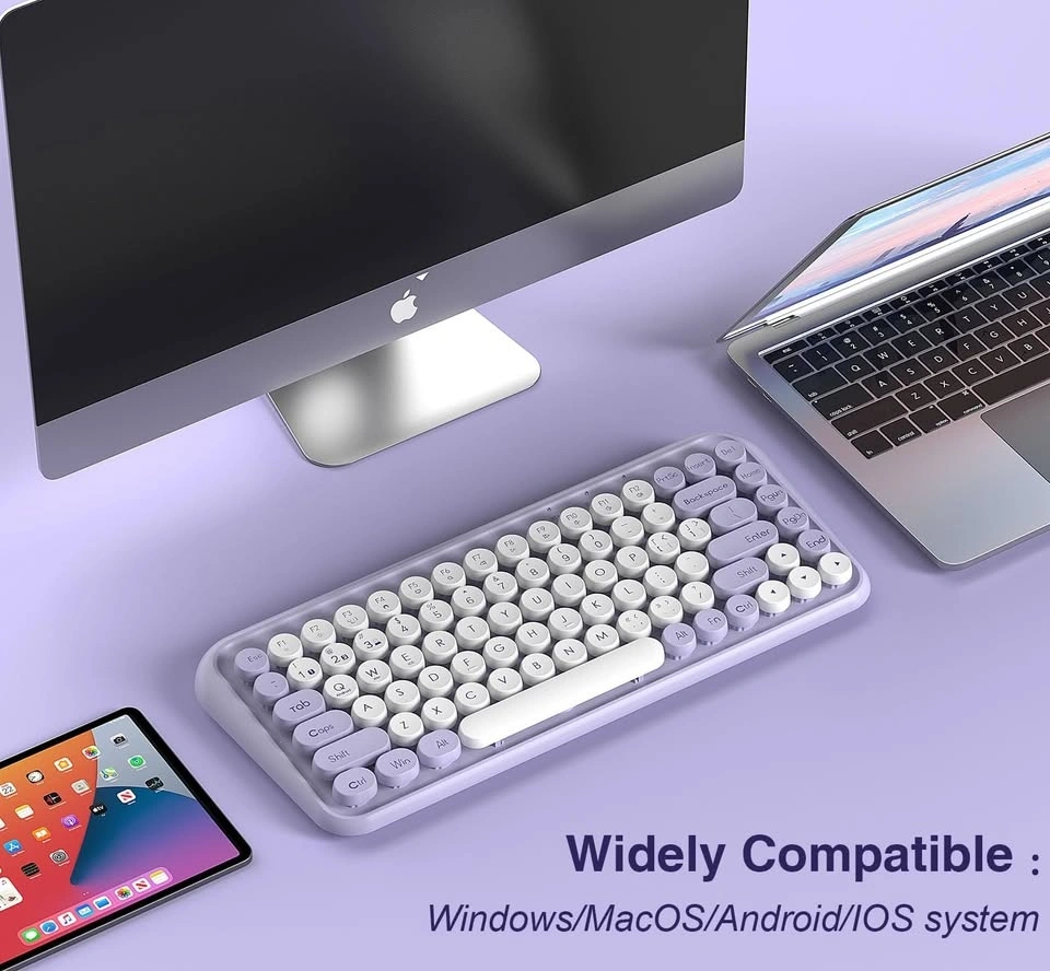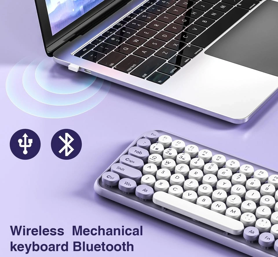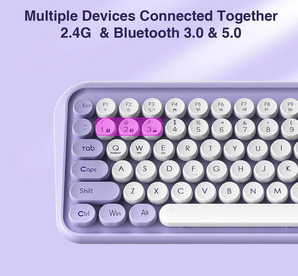 Stylish mechanical wireless keyboard with 2.4G and Bluetooth 3.0 & 5.0 connectivity. Connects to multiple devices and works with Windows, macOS, Android, and iOS systems. Features a cool purple and white design with retro round keycaps, plus new FN shortcuts and media keys.