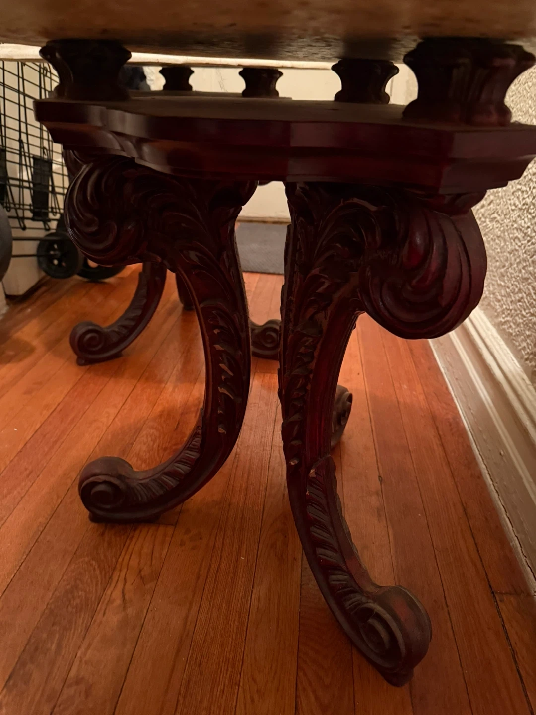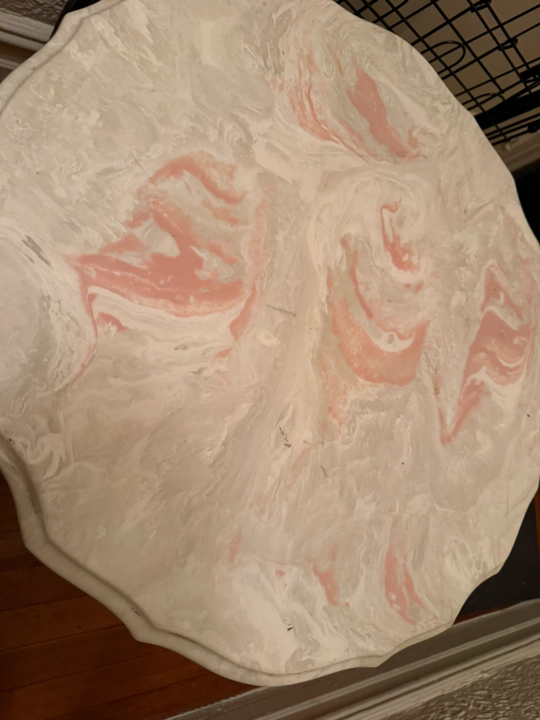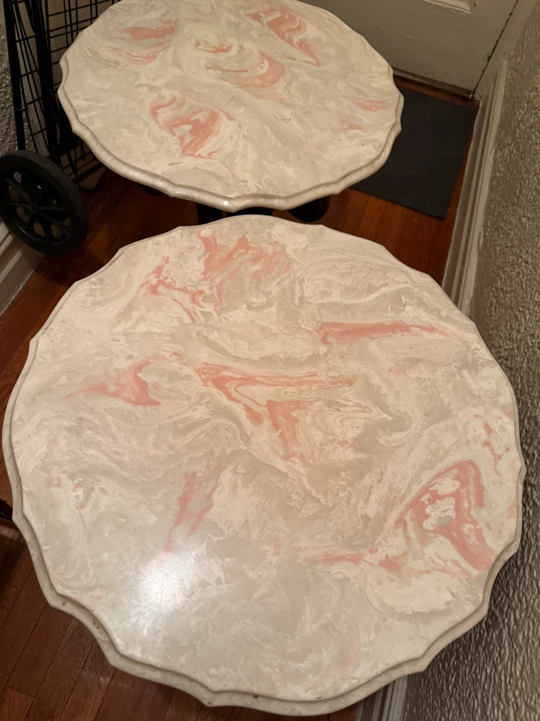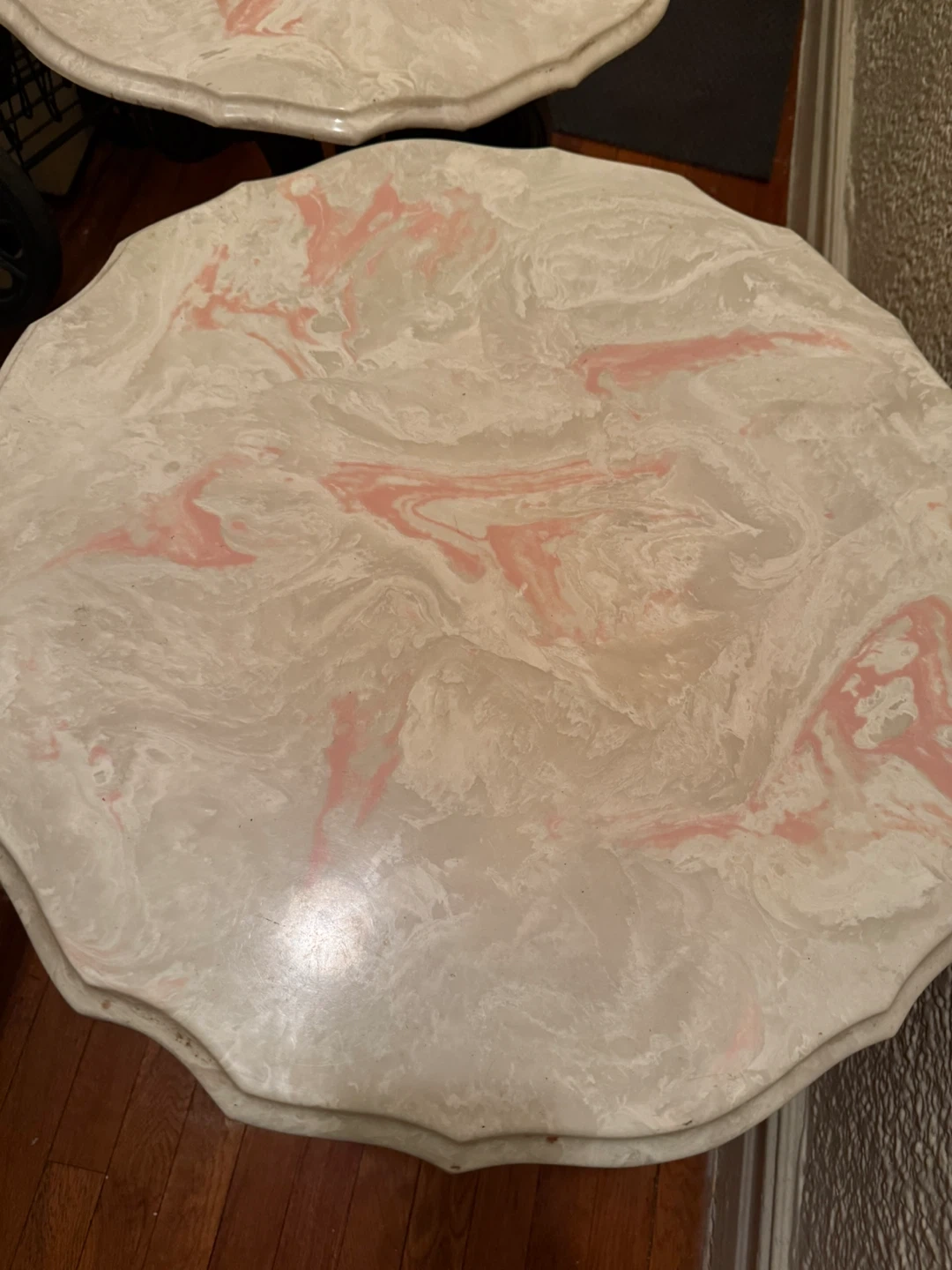 pink and white marble-effect top with a wavy or scalloped edge. This specific aesthetic is often associated with Mid-Century Modern or French Provincial furniture, typically used as an accent or lamp table.