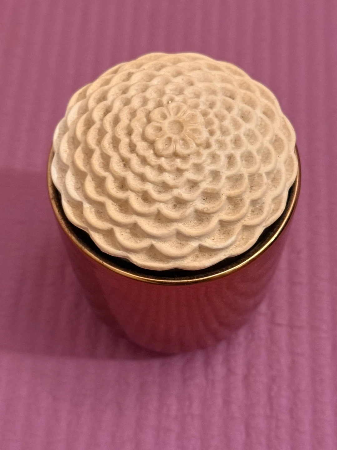This small decorative box features a cream-colored lid with an intricate floral-inspired embossed design. The container itself is a shiny, copper-toned metal. It's perfect for holding small treasures or adding a touch of elegance to a surface. Ideal for use on a vanity or dresser.