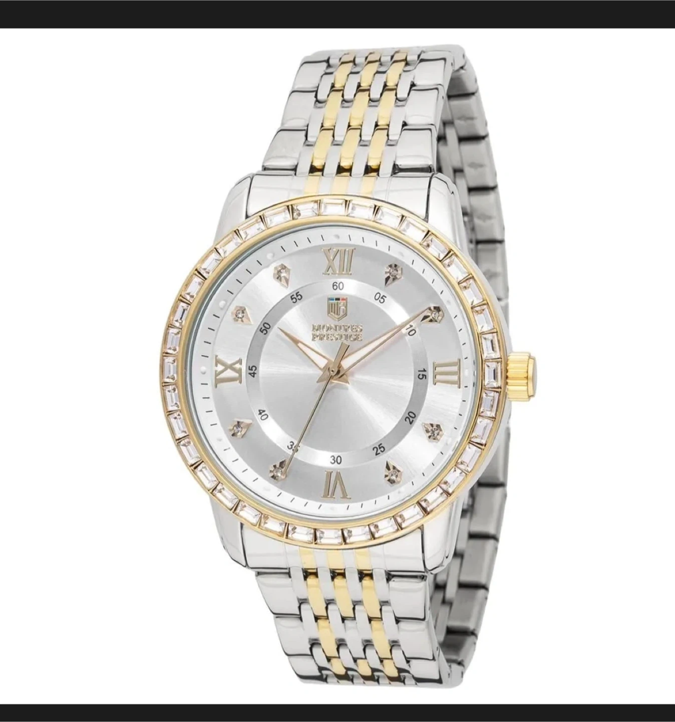 Monites Prestige watch with a silver and gold tone metal band. It features a silver dial with Roman numerals and a crystal-embellished bezel. The watch has a two-tone link bracelet.