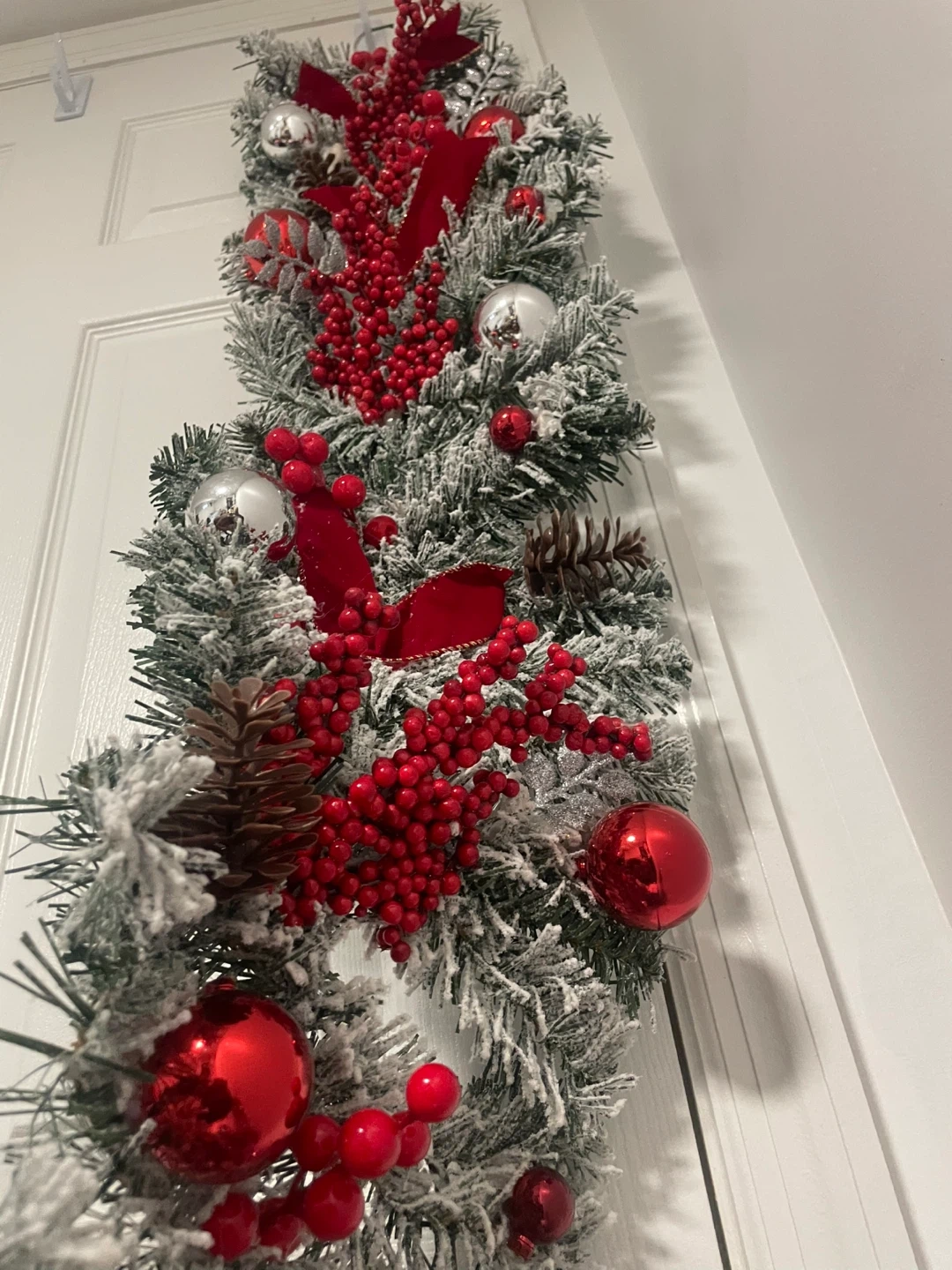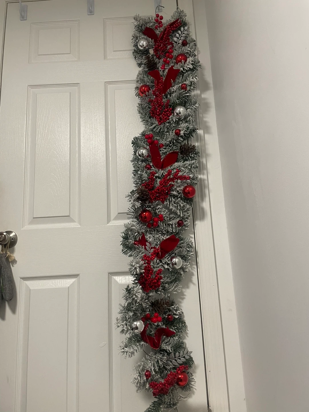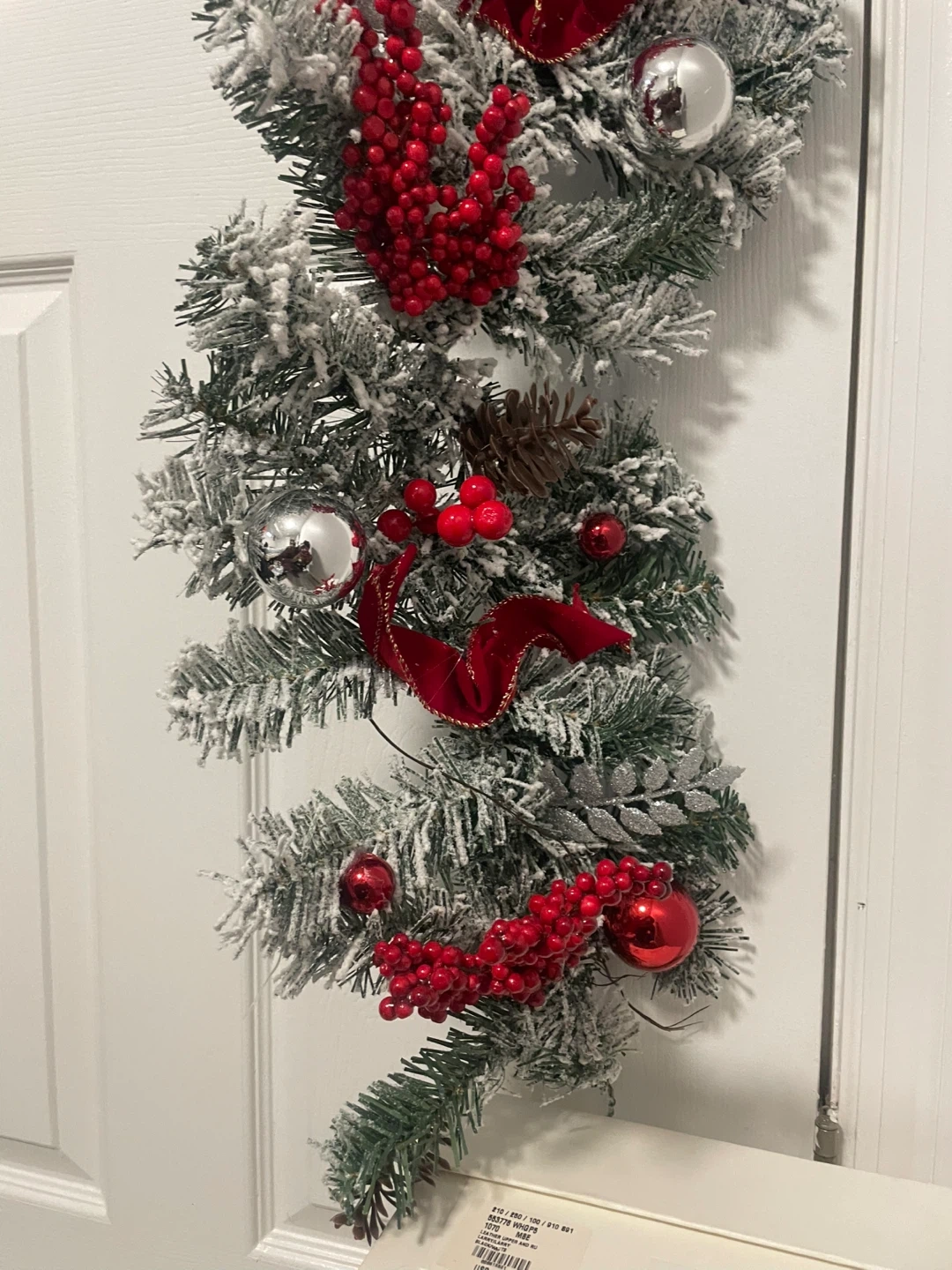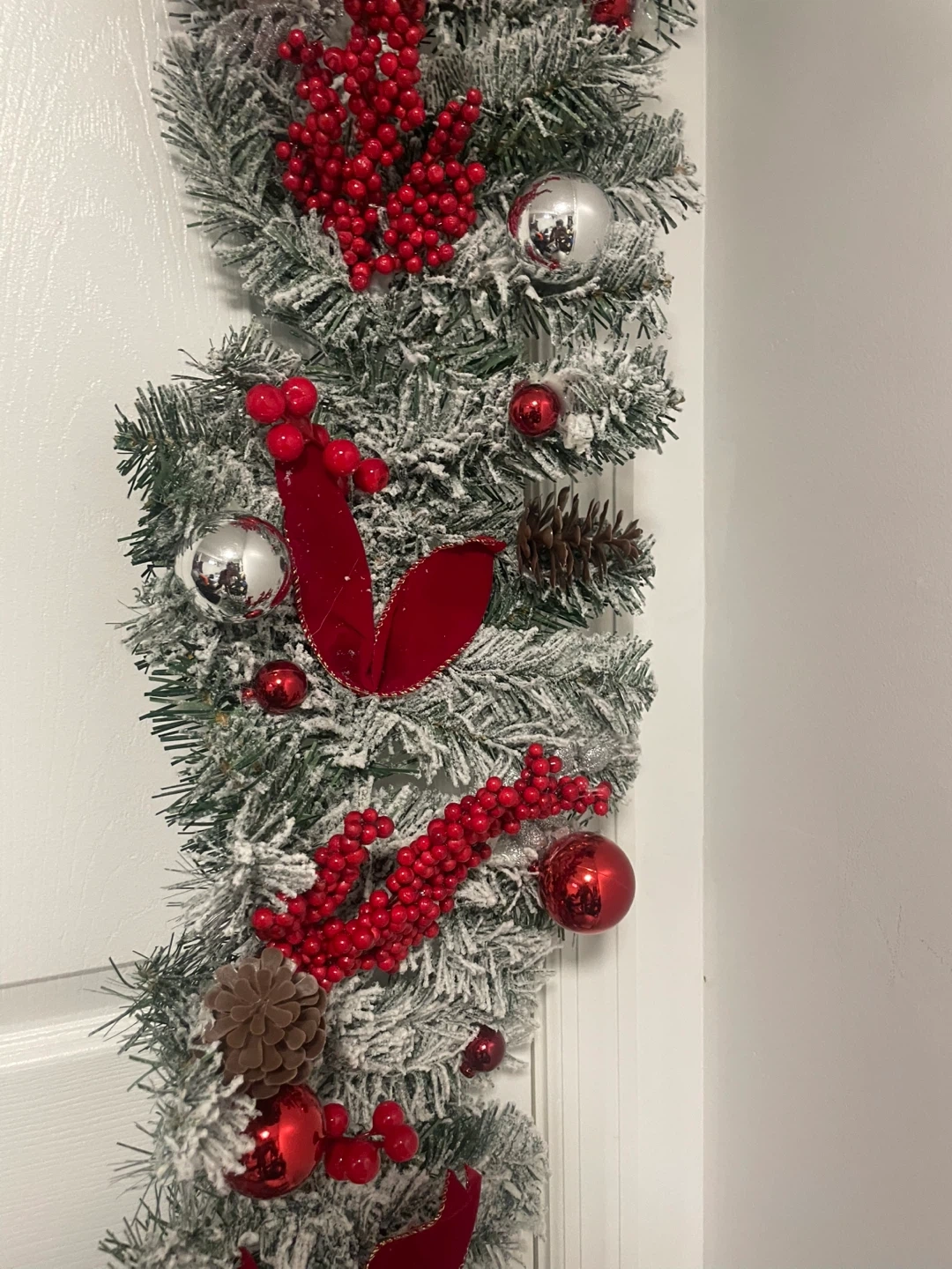 Selling a festive Christmas garland, perfect for adding a touch of holiday cheer to your home! It features a mix of frosted greenery, bright red berries, and shiny silver and red ornaments. It's brand new and ready to hang on your door or mantle this season