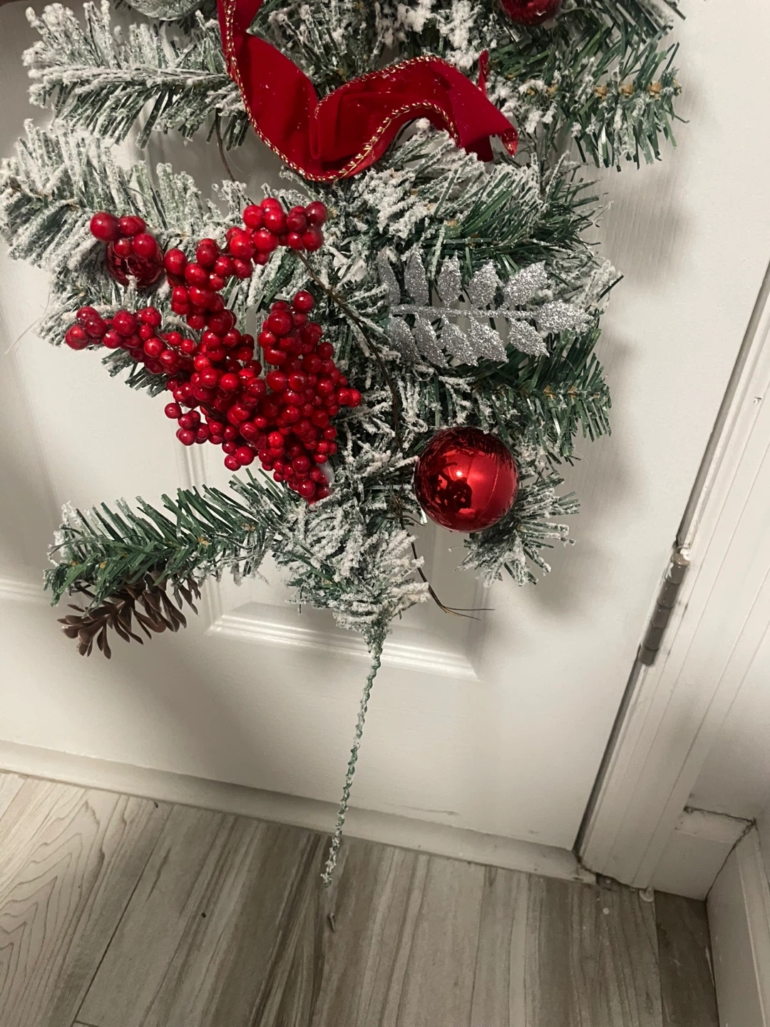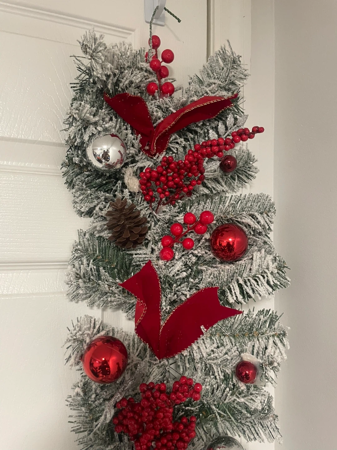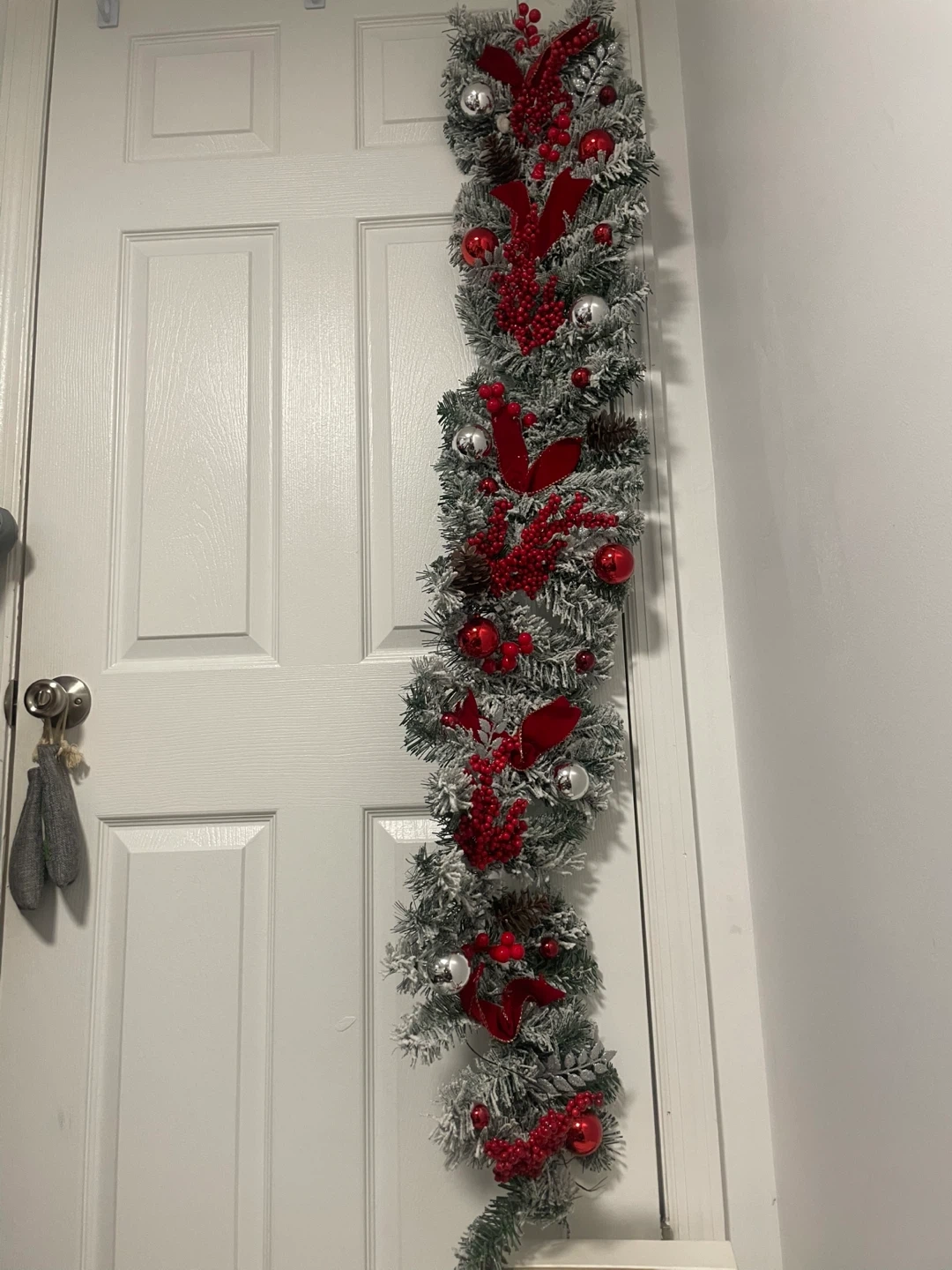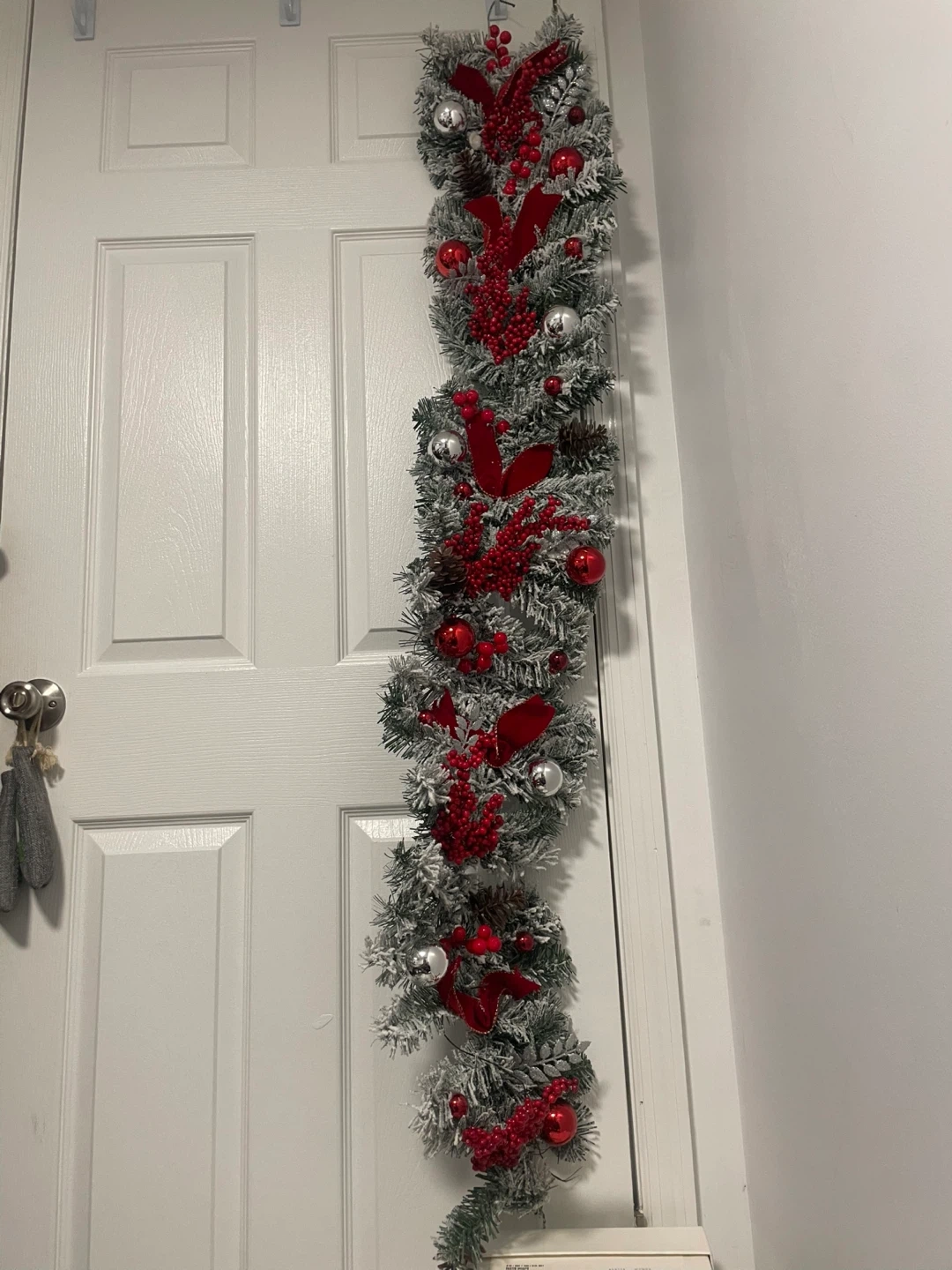 Selling a festive Christmas garland, perfect for adding a touch of holiday cheer to your home! It features a mix of frosted greenery, bright red berries, and shiny silver and red ornaments. It's brand new and ready to hang on your door or mantle this season