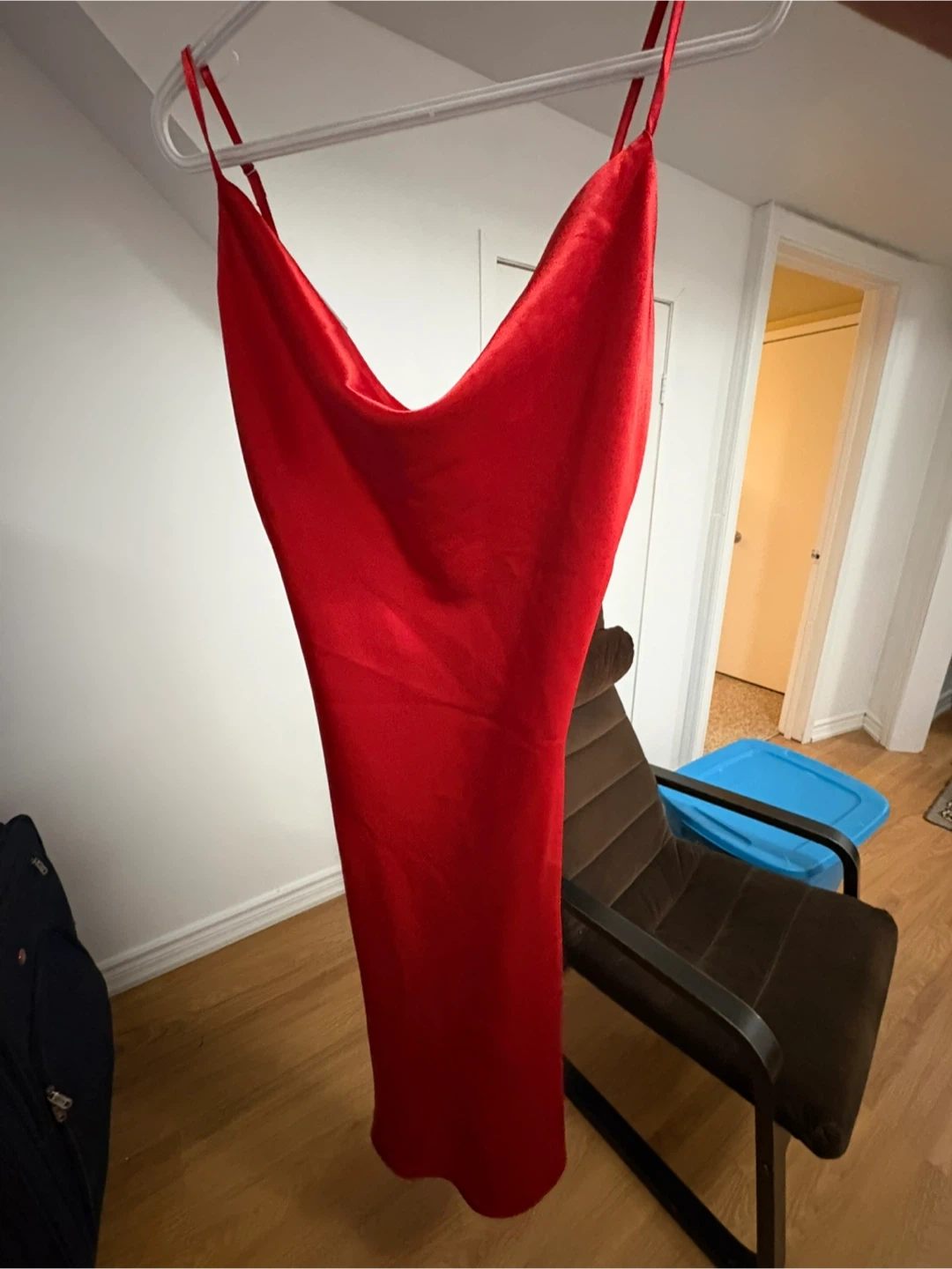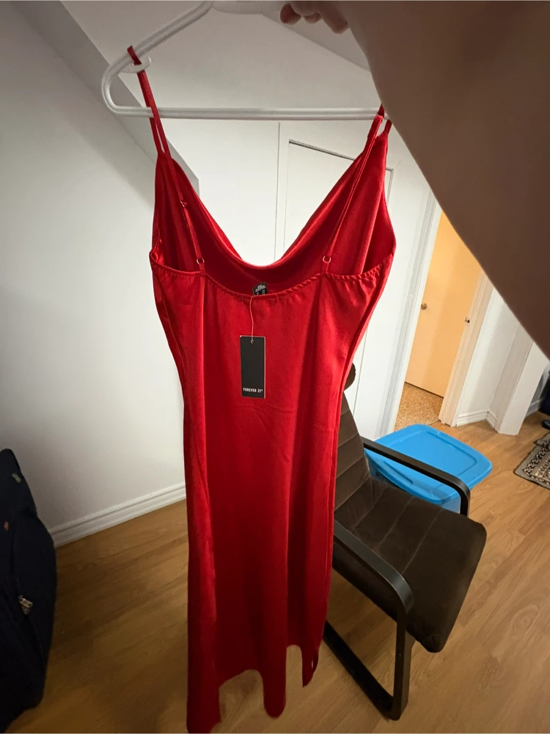 A vibrant red satin slip dress from Forever 21. It features adjustable spaghetti straps and a cowl neckline. This dress is perfect for a night out or a special occasion!