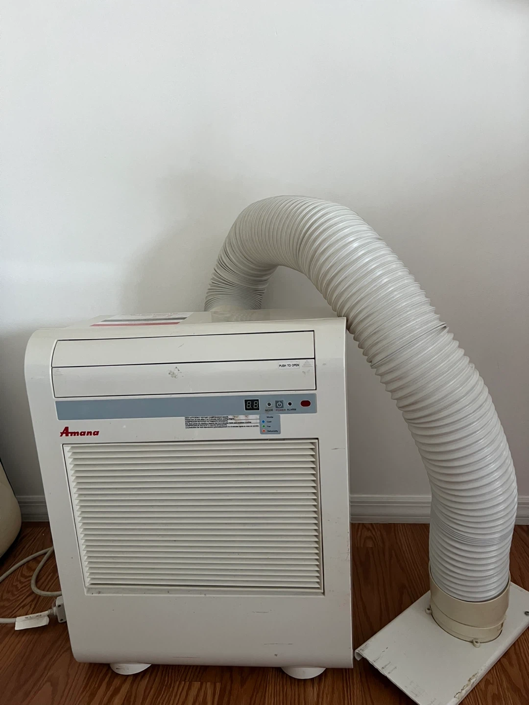 Portable Amana air conditioner. It has three modes: Cool, Fan, and Dehumidify. Includes exhaust hose and window vent kit.