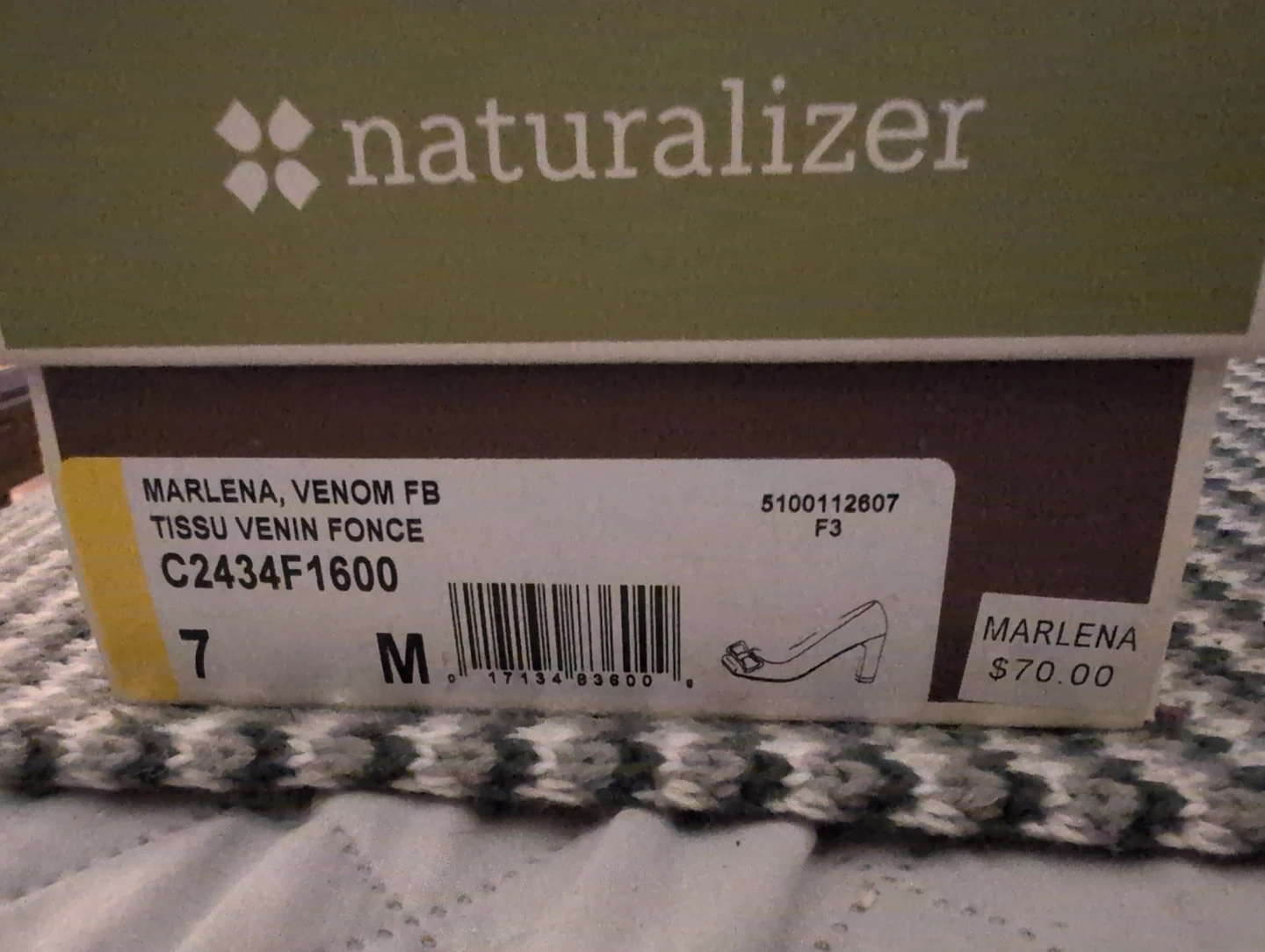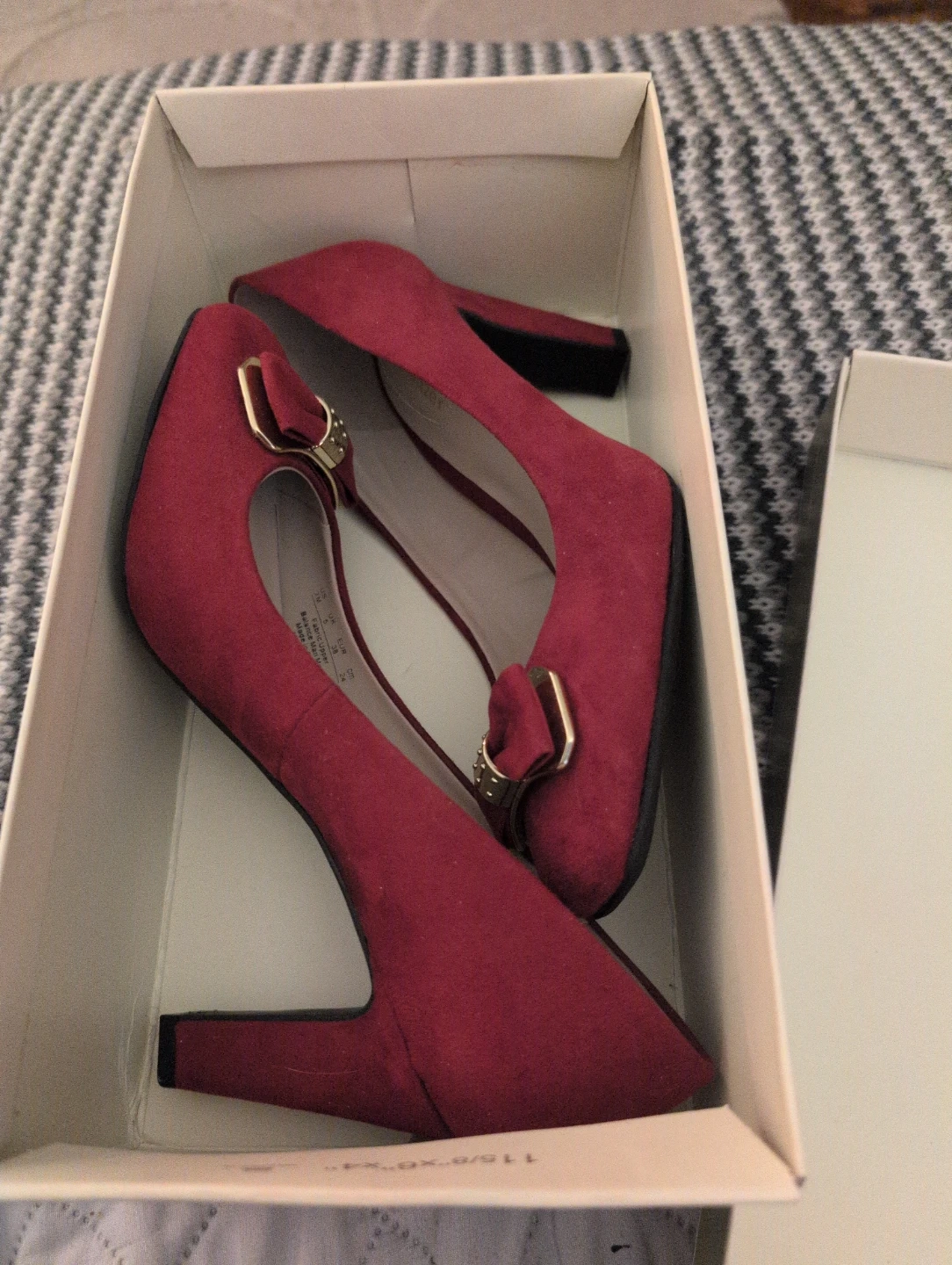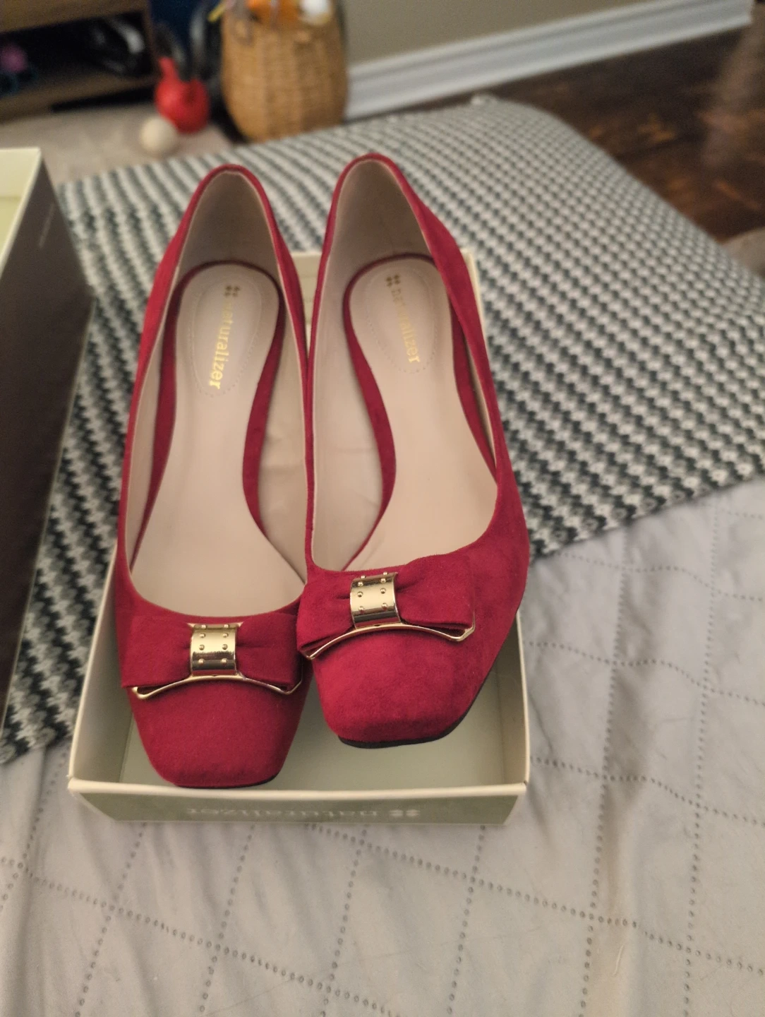 These Naturalizer heels are a vibrant red suede. They feature a decorative gold-tone bow accent on the toe. The shoe's interior lining is also beige. They come in their original box. Size 7. Never been worn.