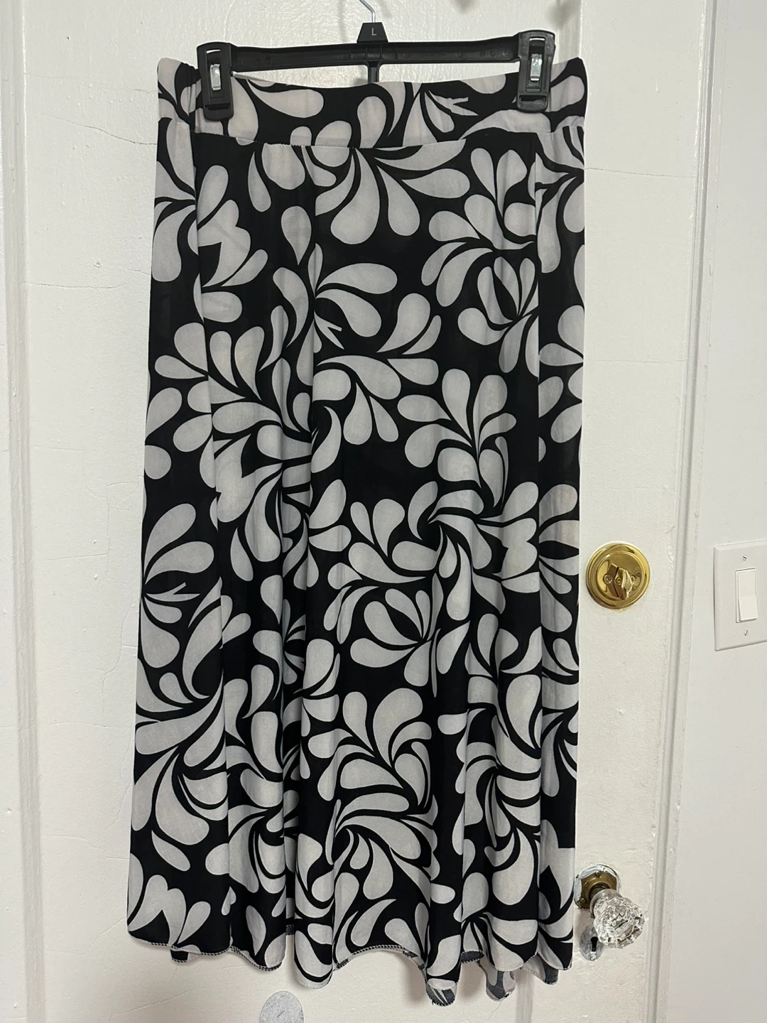 This Victorious secret brand maxi skirt features a vibrant red, black, and white abstract print with pleats throughout. It has a comfortable elastic waistband. Made from lightweight, flowy material. Great for a stylish casual or semi-formal look!