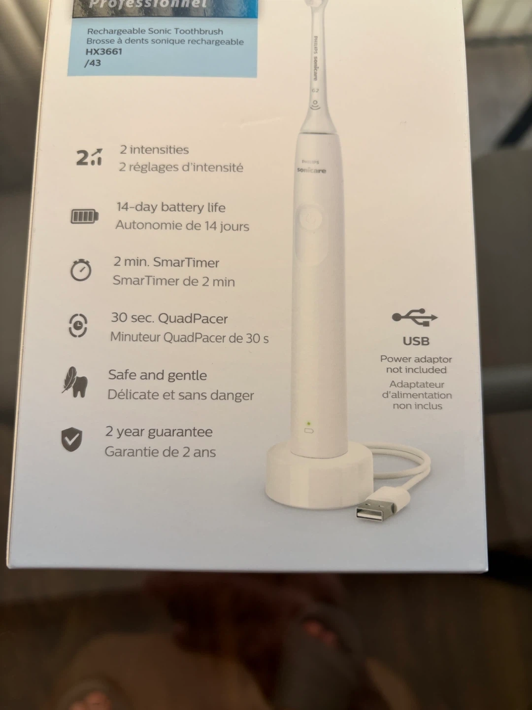 This Philips Sonicare 2300 rechargeable sonic toothbrush offers a gentle yet effective cleaning. It has 2 intensities, 14-day battery life, and comes with a 2-minute SmarTimer and 30-sec QuadPacer. Includes 1 handle, 1 charger, and 1 brush head.