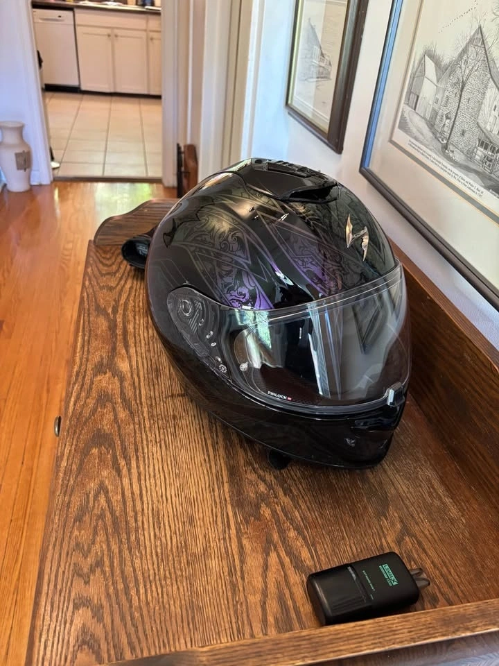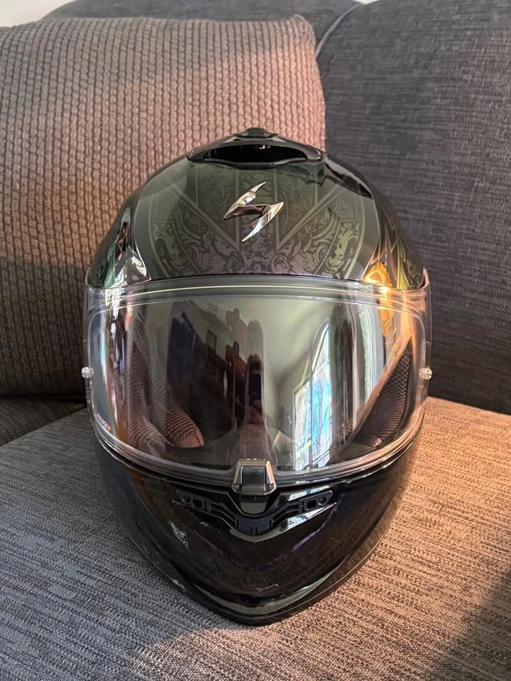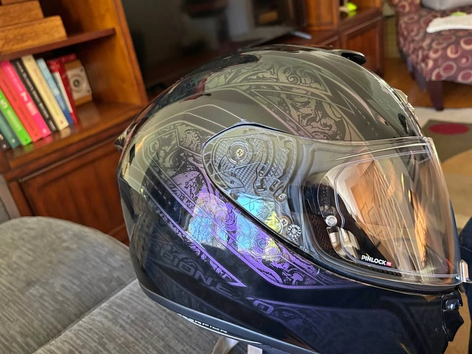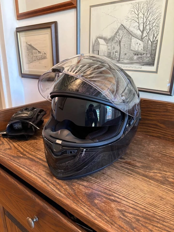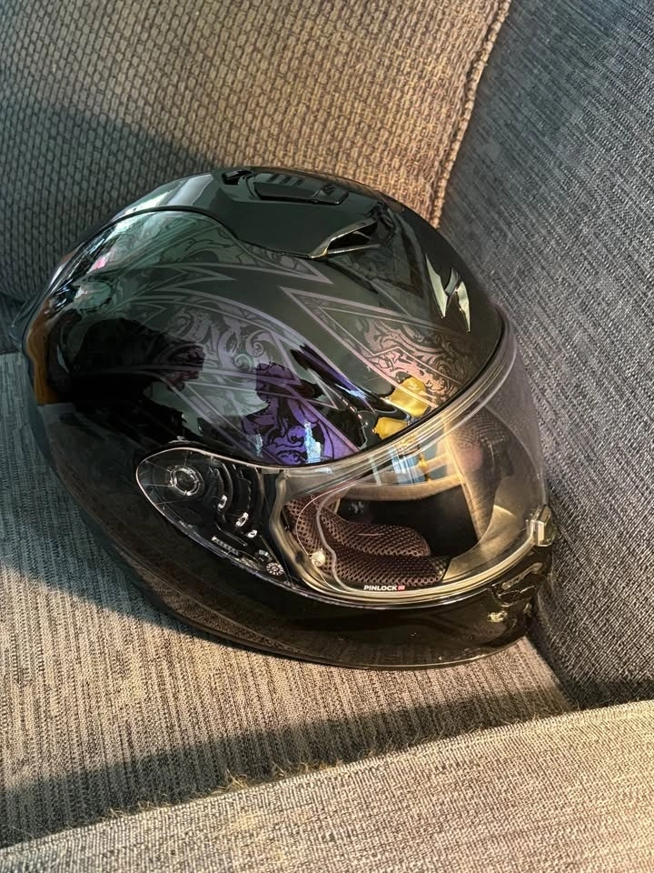 Worn once, one size too large. Features a drop-down visor, chin curtain, and breath deflector. Pinlock is installed. Includes a soft carry bag. Ordered from Europe; cost $700 with tax and shipping. My loss is your gain. Graphic not available in Canada.