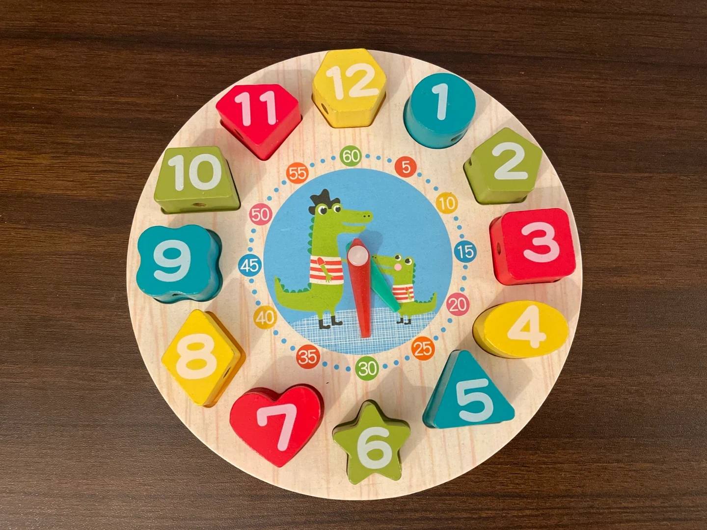 A wooden clock toy with numbers and shapes for sorting. Each number piece also has small holes designed for sewing practice.