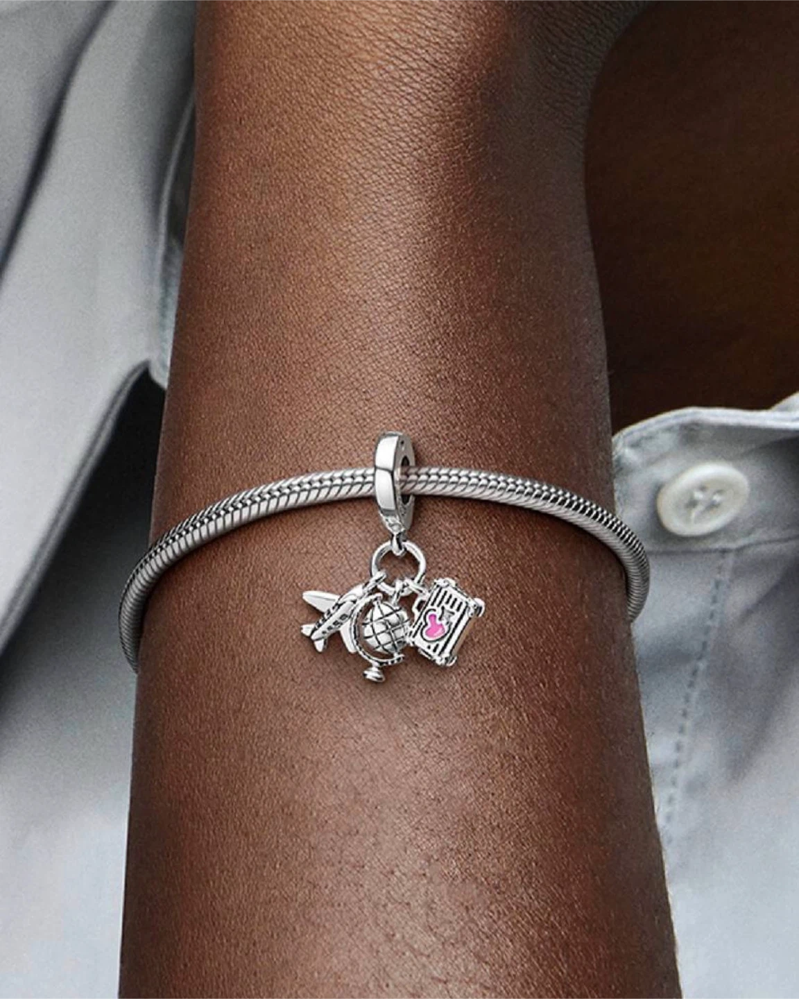 It's time to pack your bags. This 3-in-1 sterling silver charm is every travel lover’s dream. An aeroplane, a world globe and a suitcase – complete with grooved lines and enamel details – together represent a promise to plan future adventures.