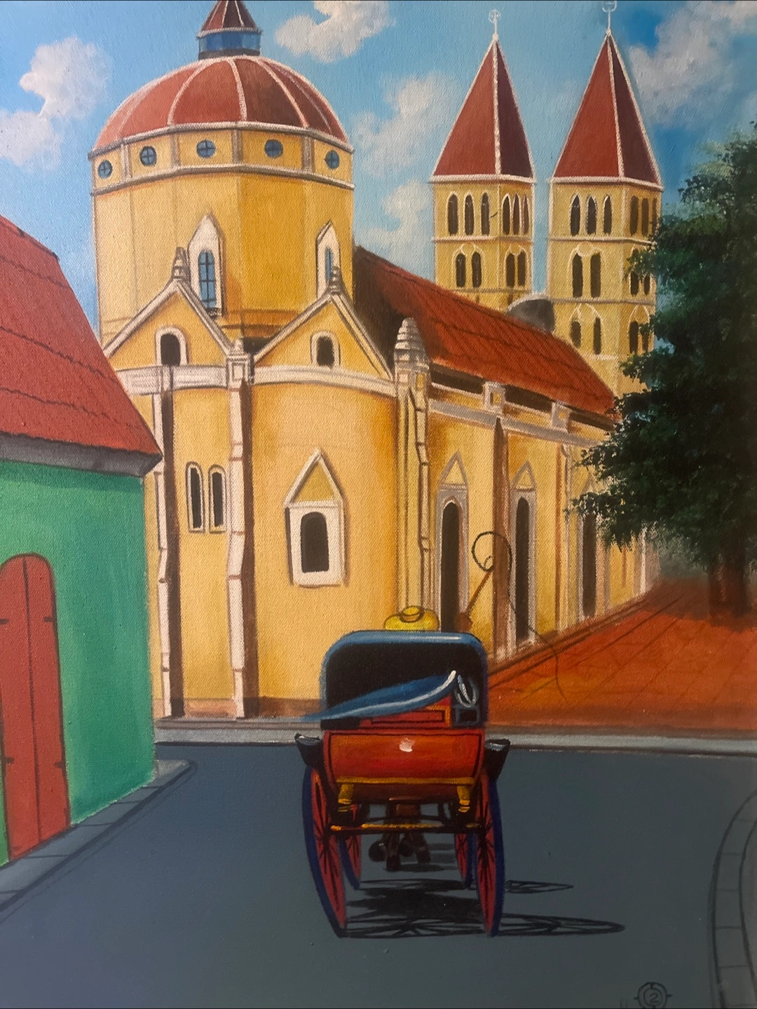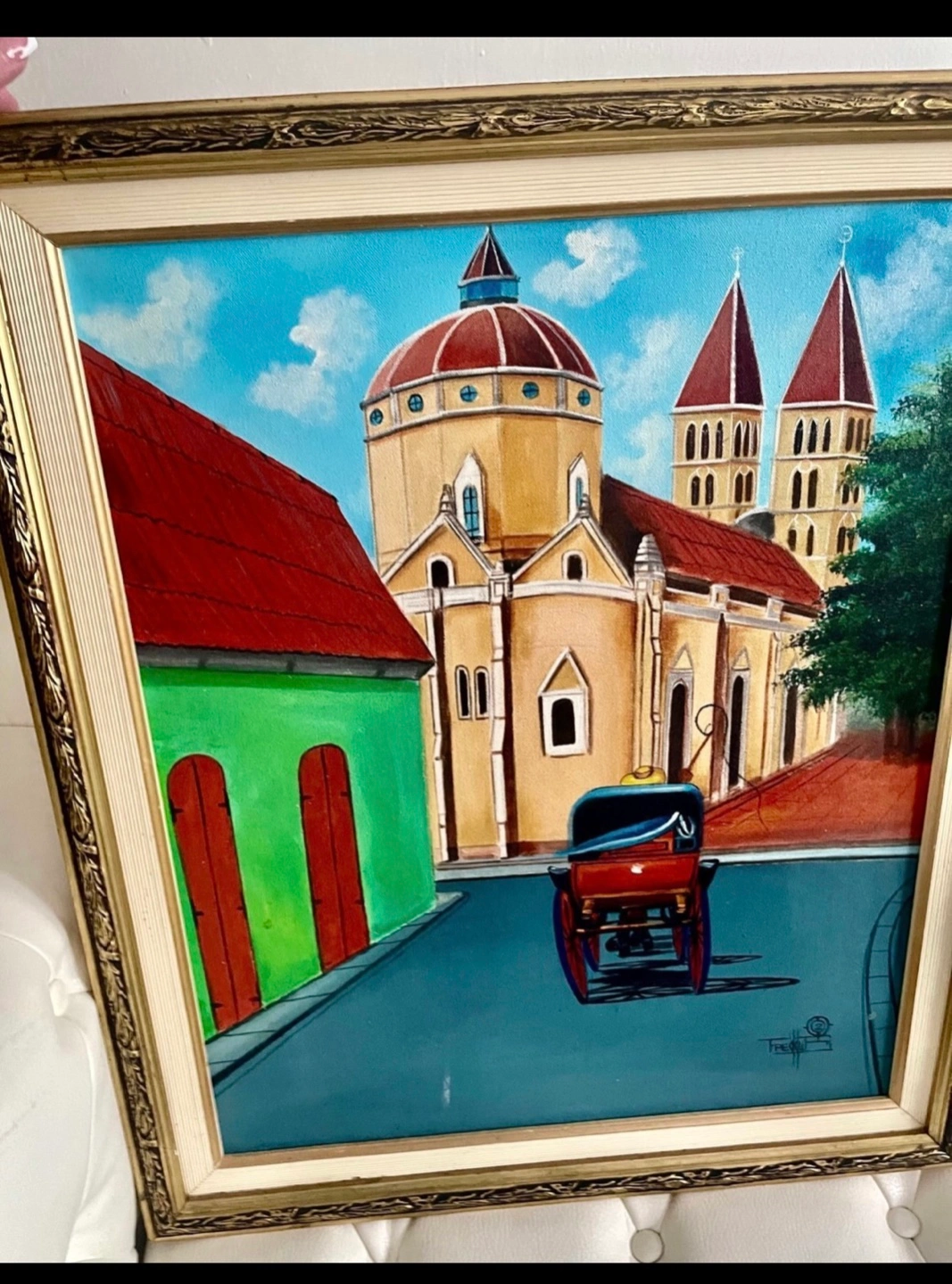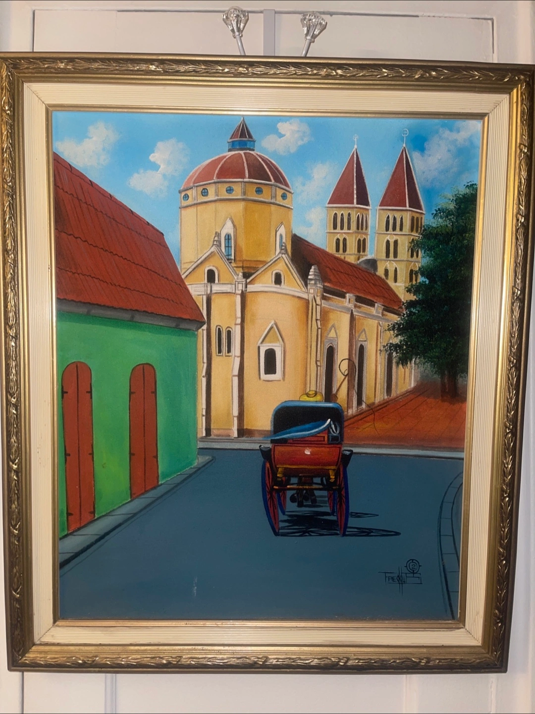 Colorful painting of a church and town. Horse-drawn carriage in the foreground. Ornate gold frame. Signed lower right by artist 2002