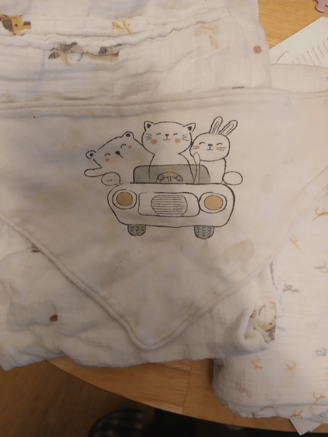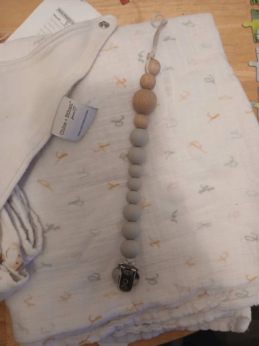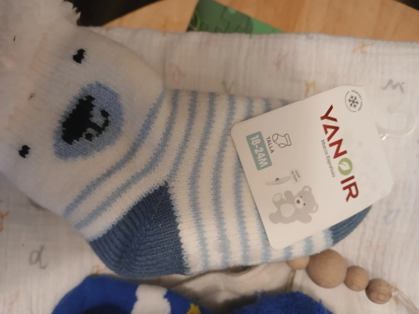 Set includes one pair of Yanoir socks in size 18-24 months and one Chloe & Ethan pacifier clip. Also includes two soft muslin swaddle blankets with adorable prints. Perfect for a baby shower gift!