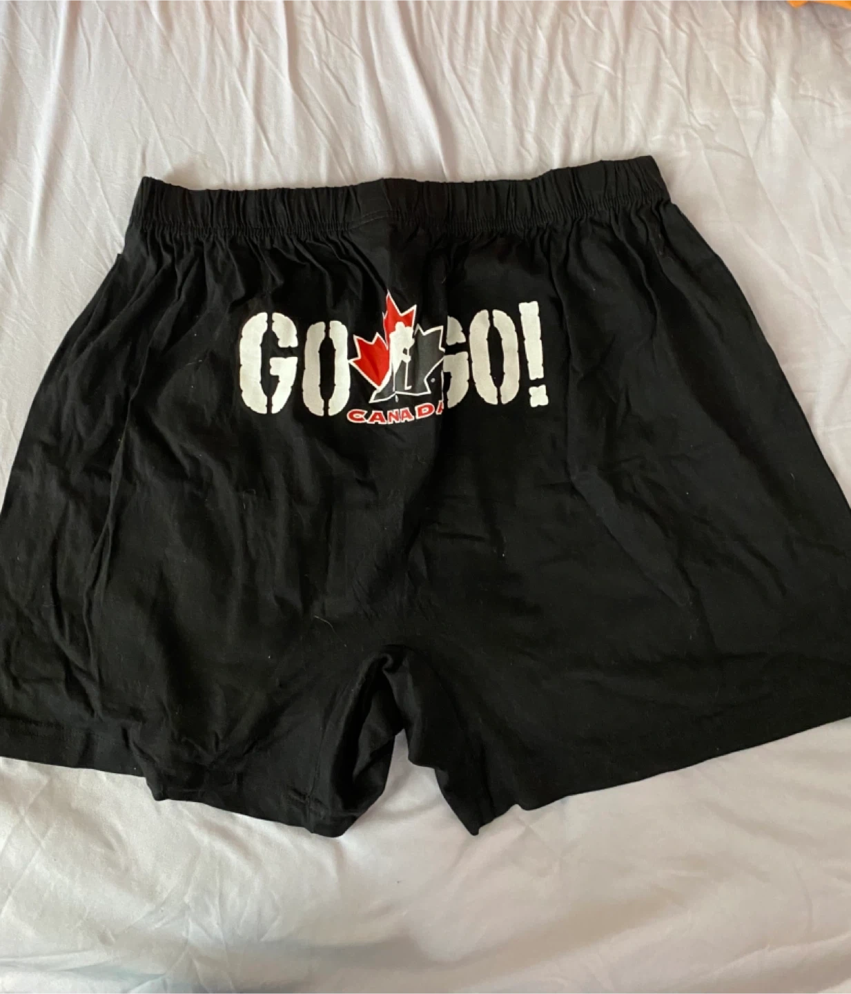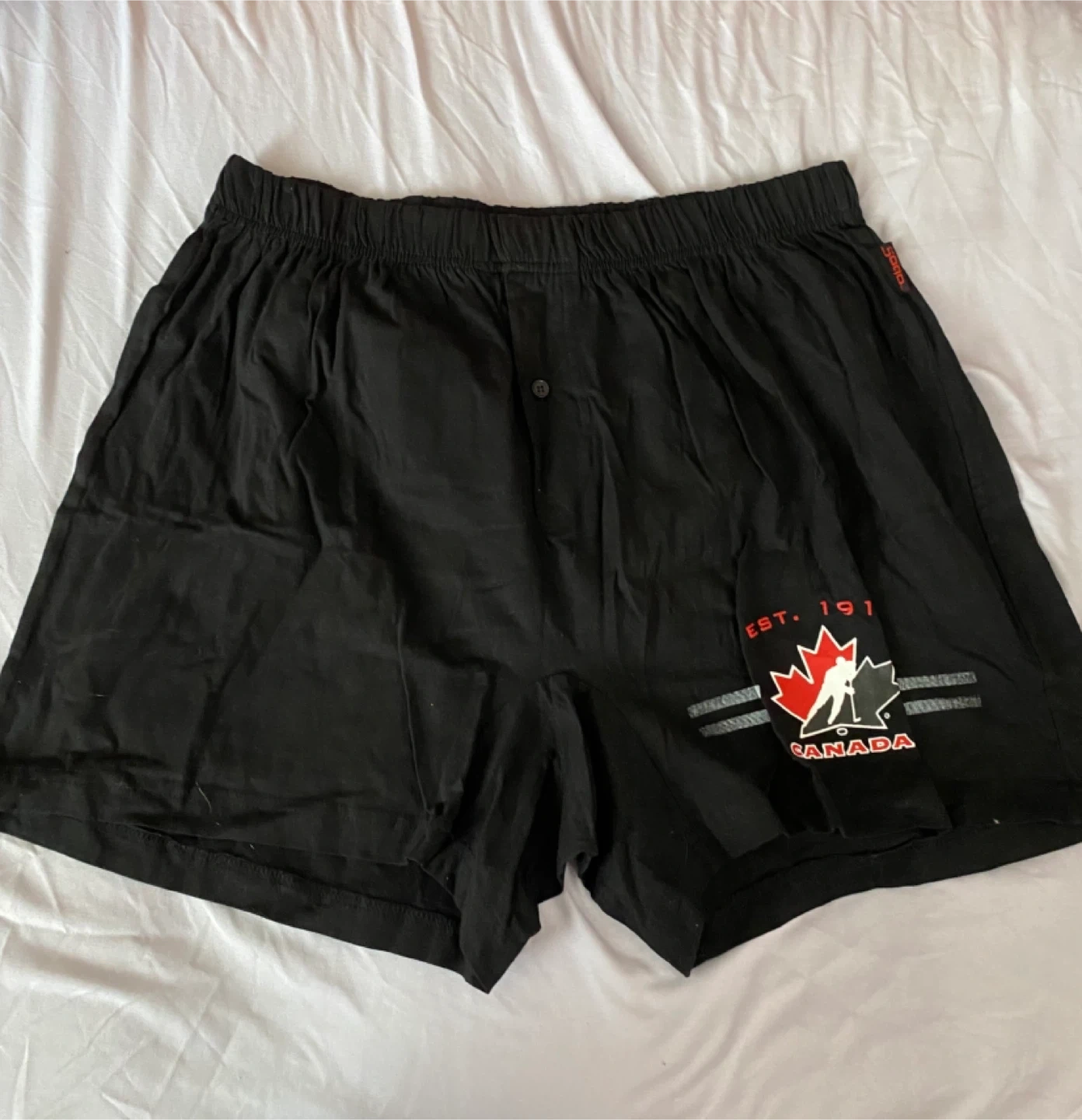 Selling a pair of Canada Sooqo boxer shorts in black! They are size G/L and feature the classic Canada logo with the hockey player and maple leaf. Perfect for showing off your Canadian pride or just lounging around