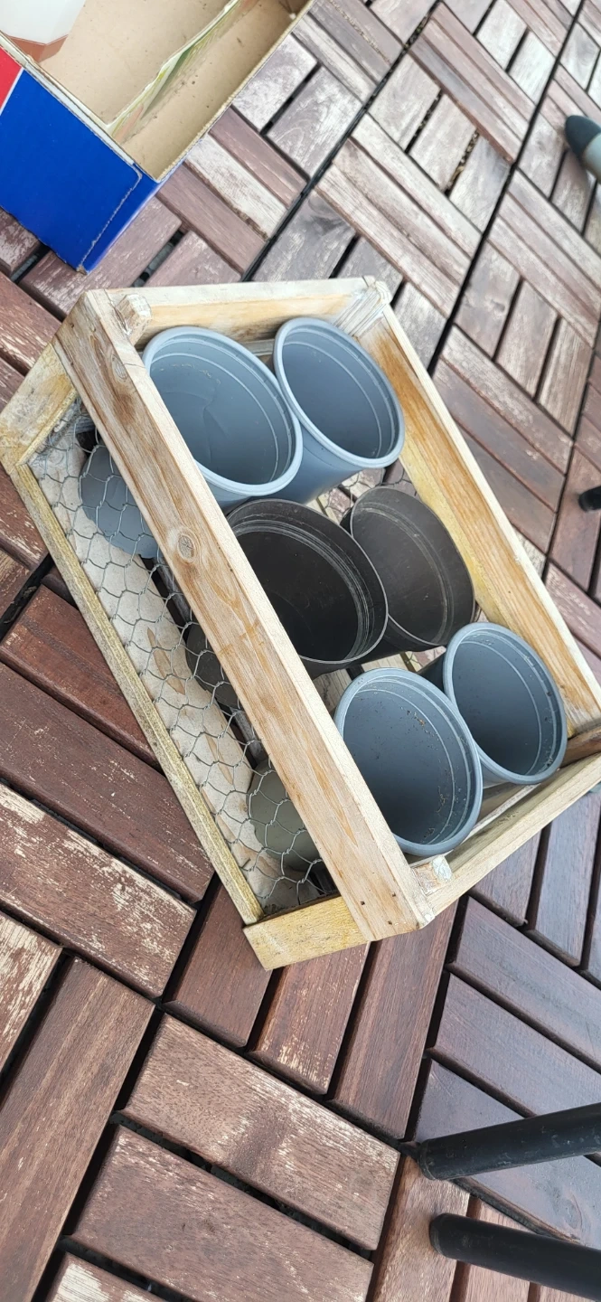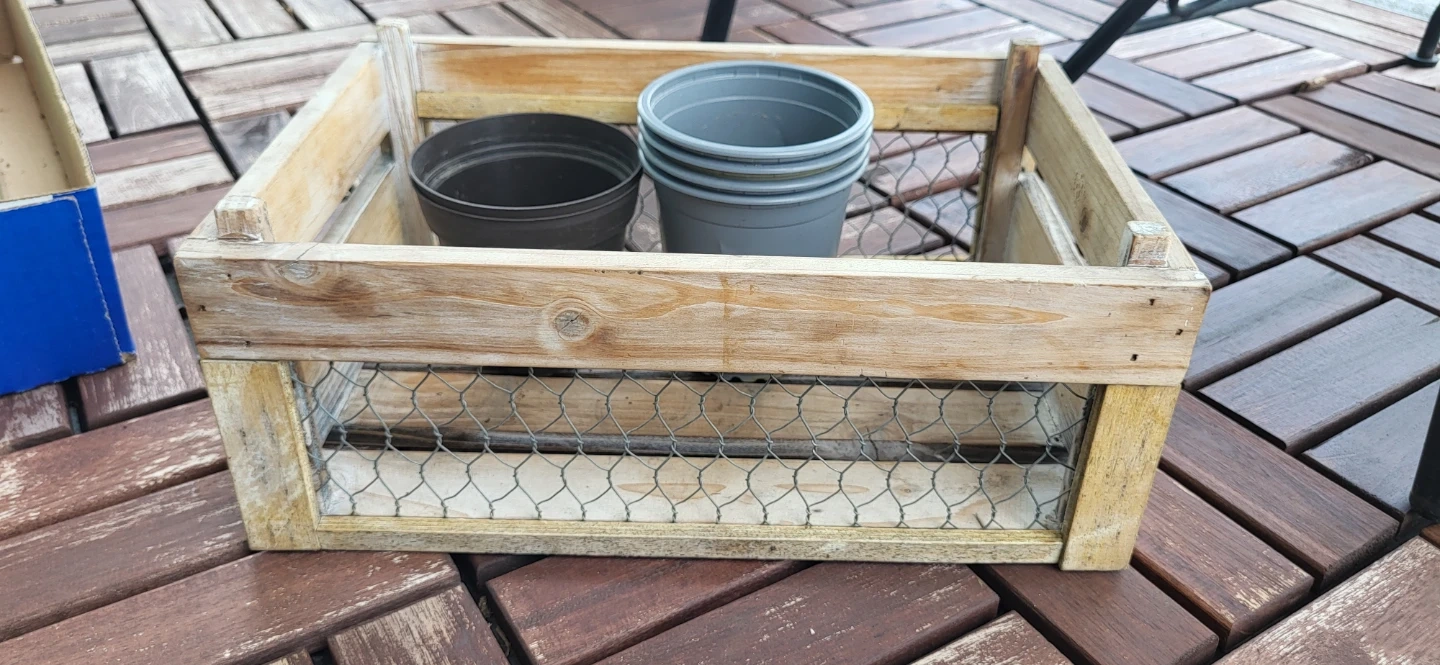 Wooden crate with chicken wire detail and six plastic plant pots... I just finished repotting some plants and this needs a new home. Great for starting seedlings or organizing small plants!