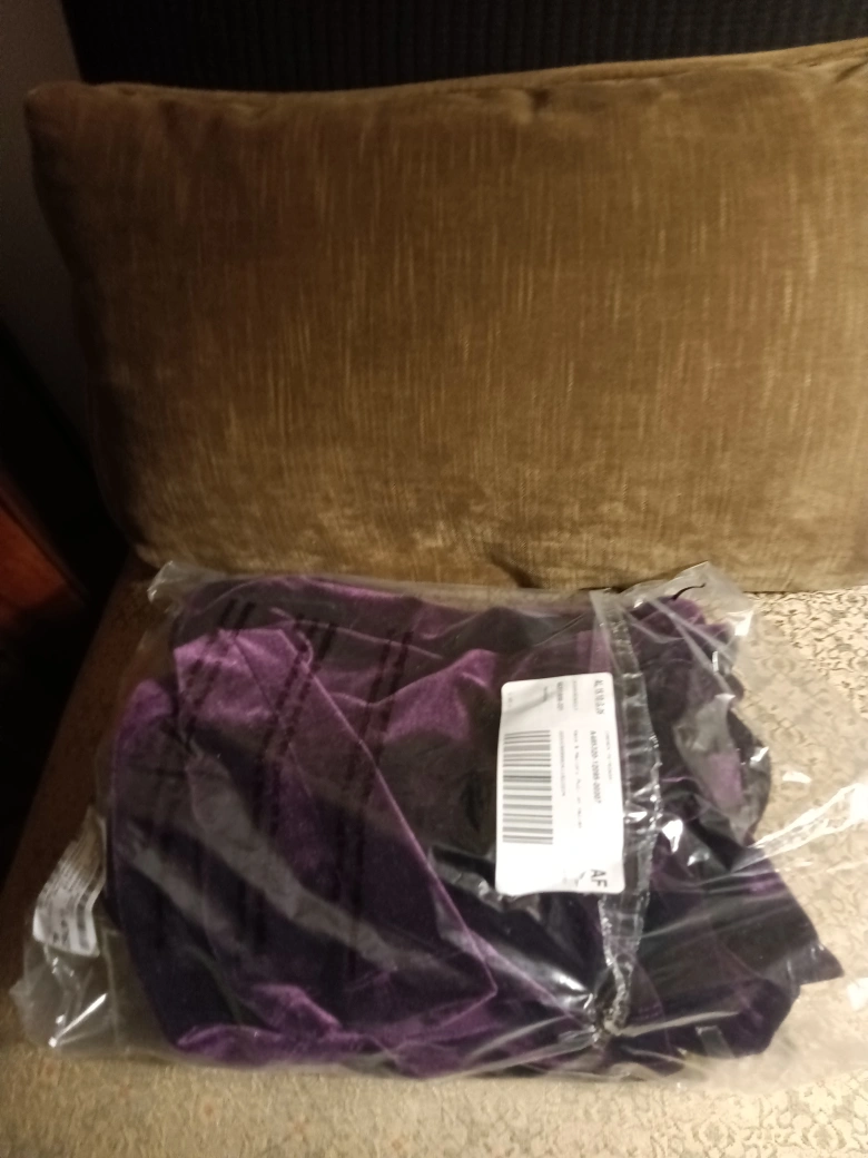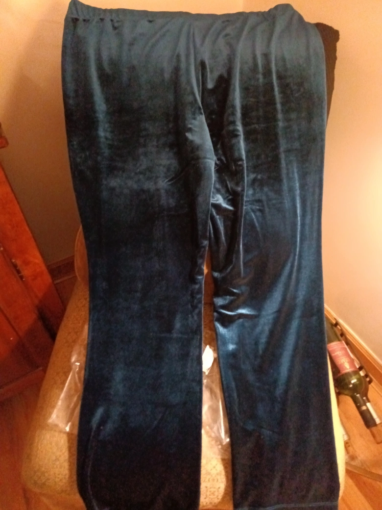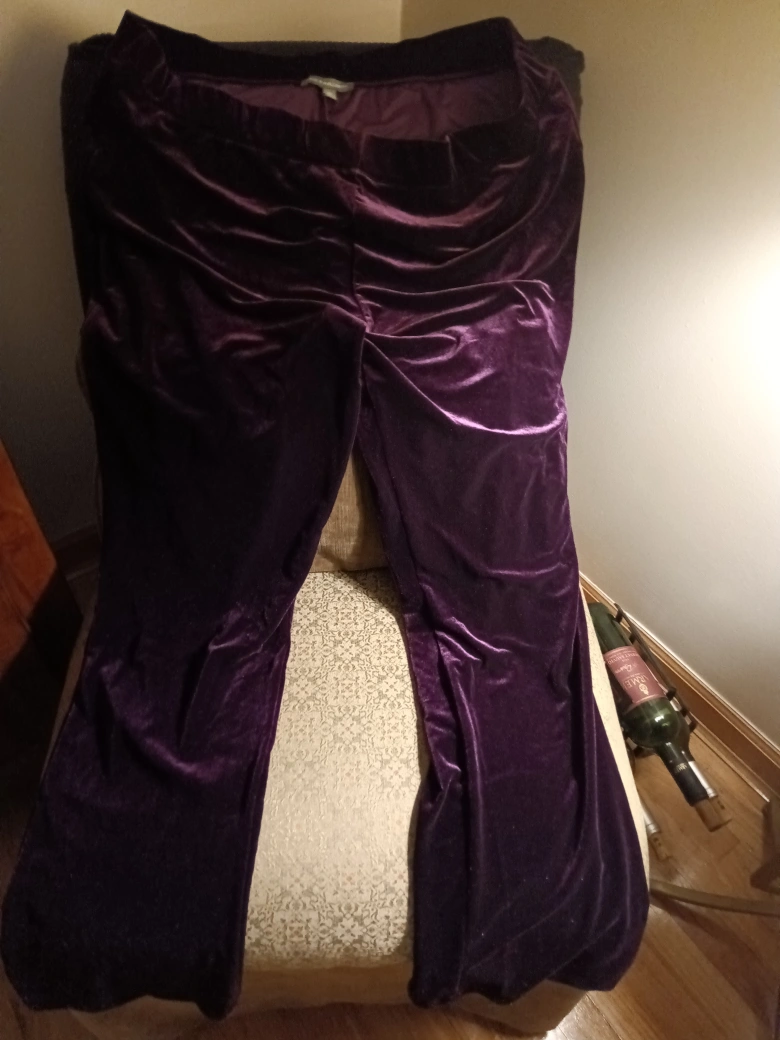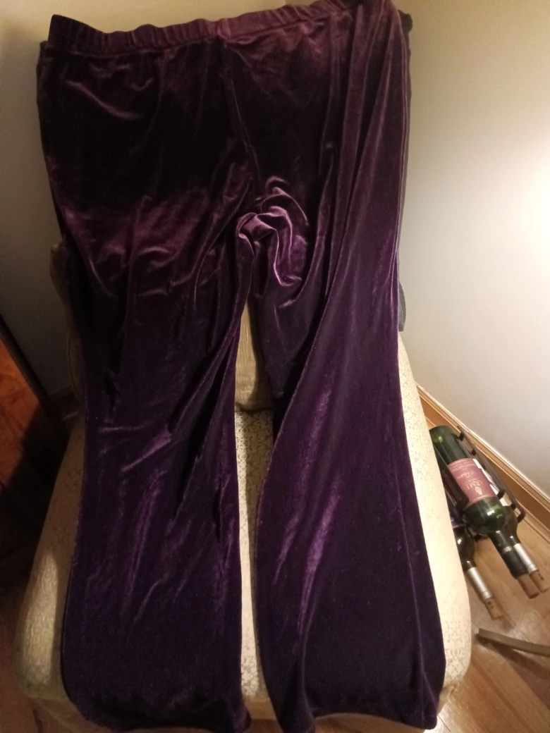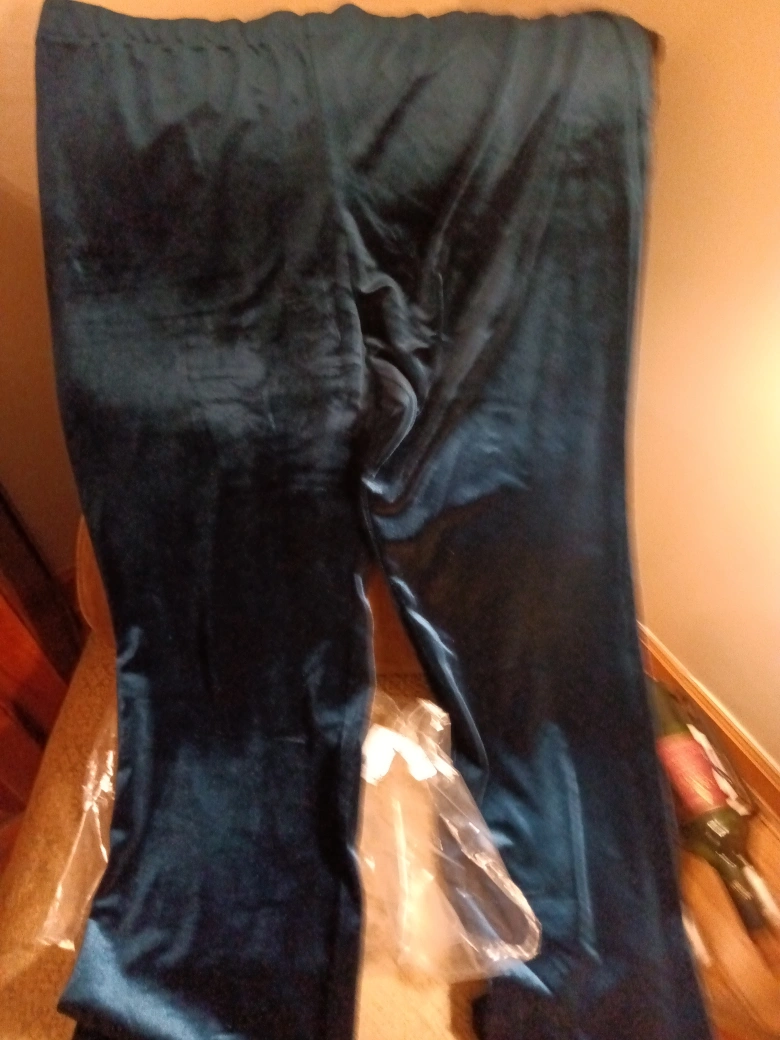 Pants are still in the packaging, never used. I put them away (as I was in the middle of a move) & by time I found them & tried them on, they were too big & couldn't exchange them. I have two pairs, same size, will fit a 2-3XL. They are a deep Purple & Forest Green in colors, pants have elastic waist & stretch. These are great for fall or winter festivities.