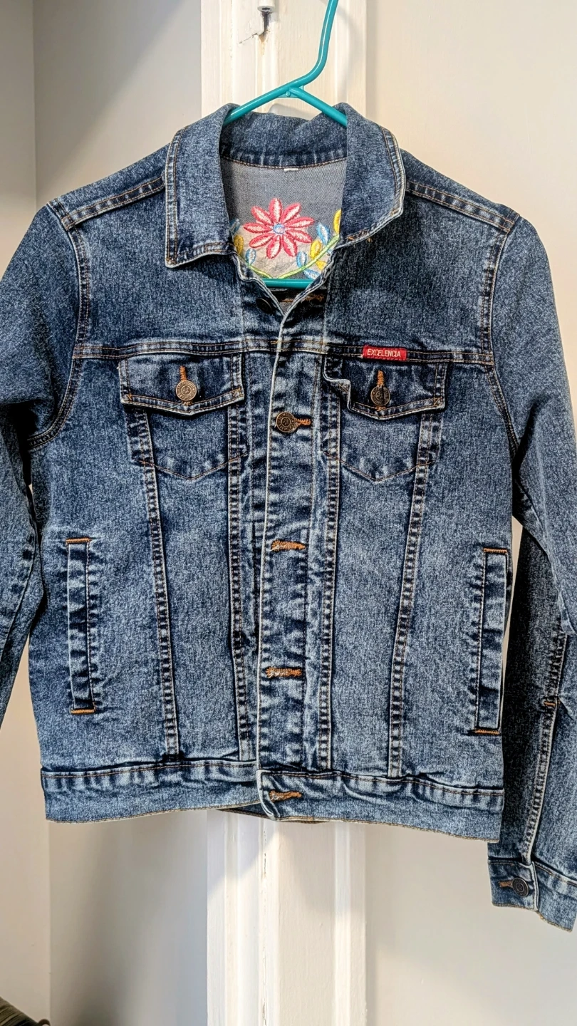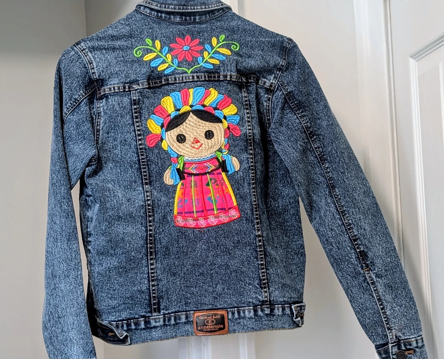 This denim jacket features a vibrant embroidered "Mestiza" doll design on the back, complete with a floral accent on the collar. It's a classic blue denim with a traditional trucker jacket style. This unique piece adds a pop of cultural flair to any outfit!