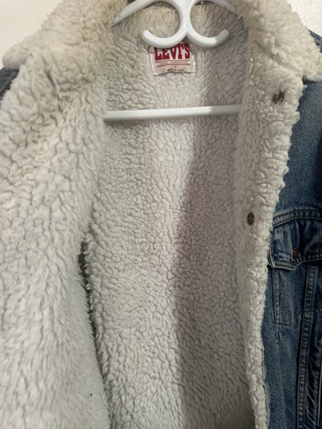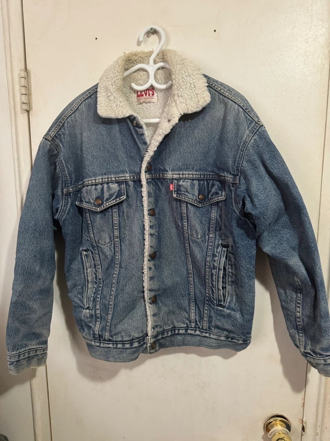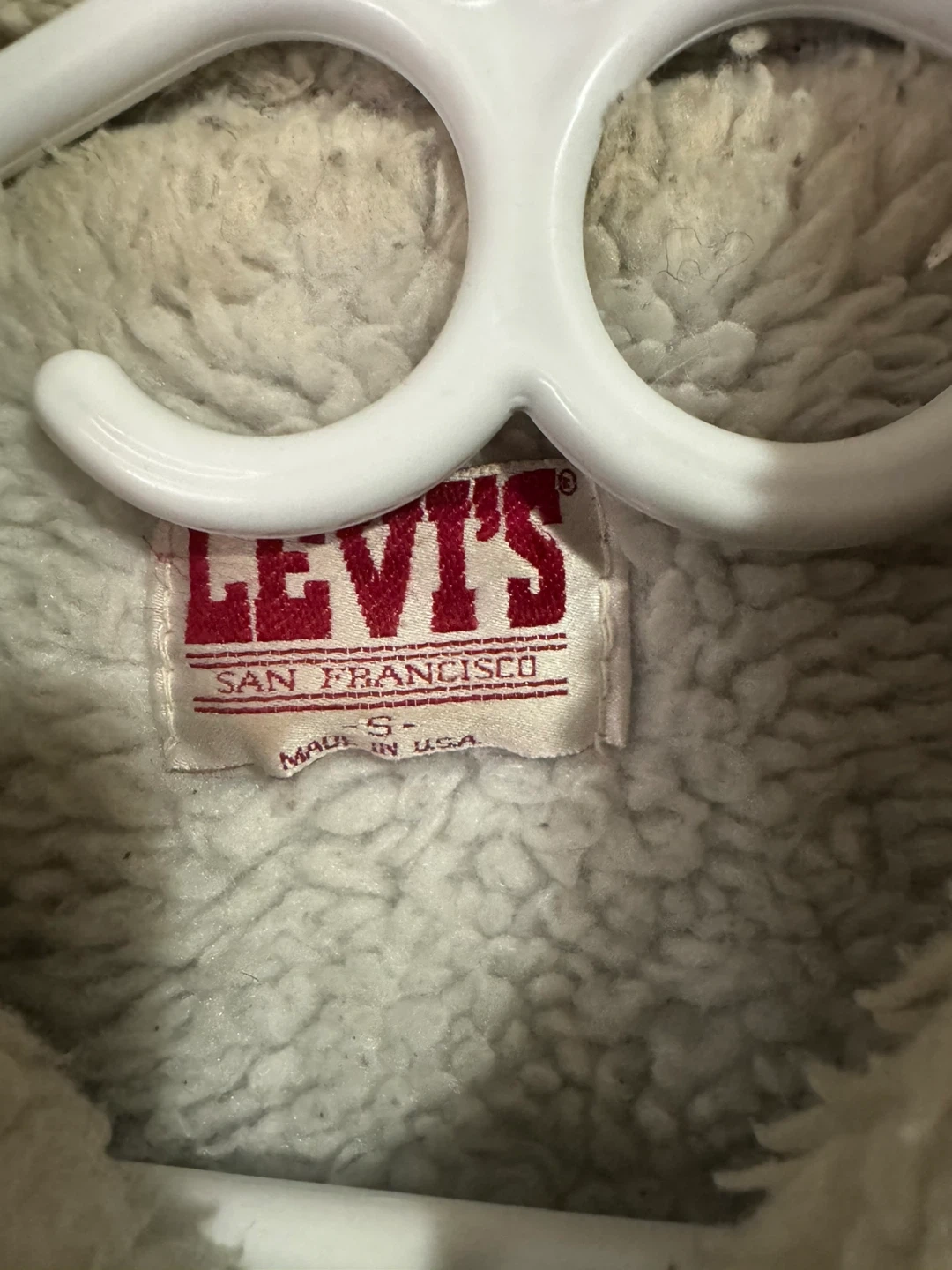 This is a classic Levi's denim jacket with a cozy sherpa lining. It features the iconic Levi's red tab and is made in the USA. Size is small.
