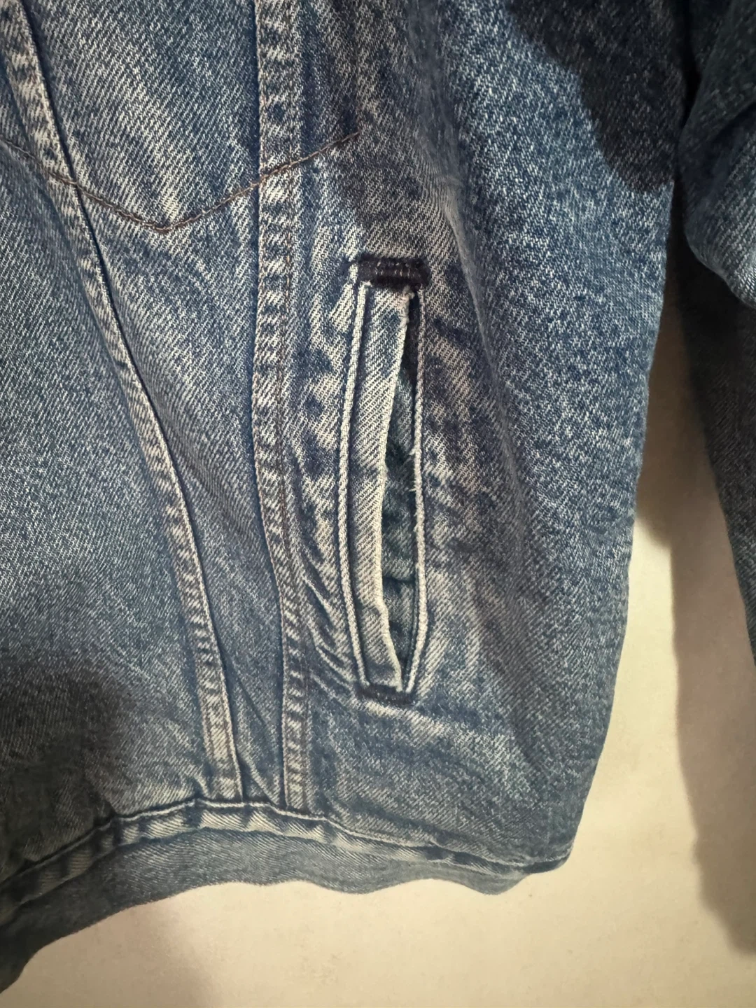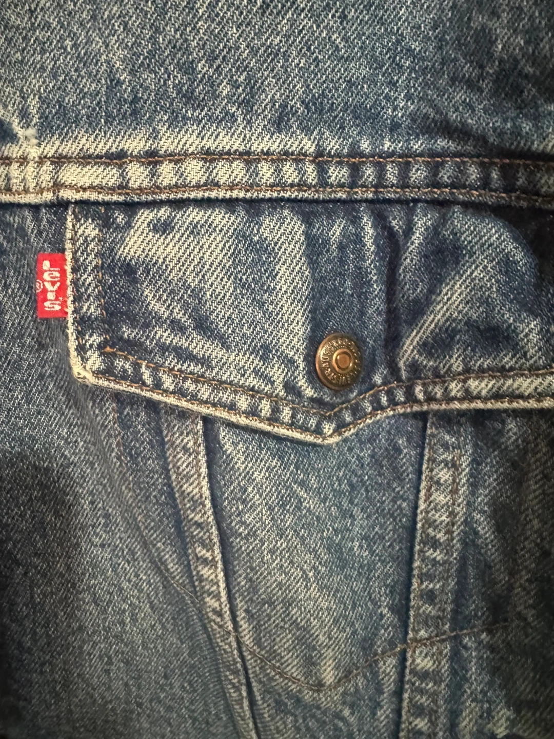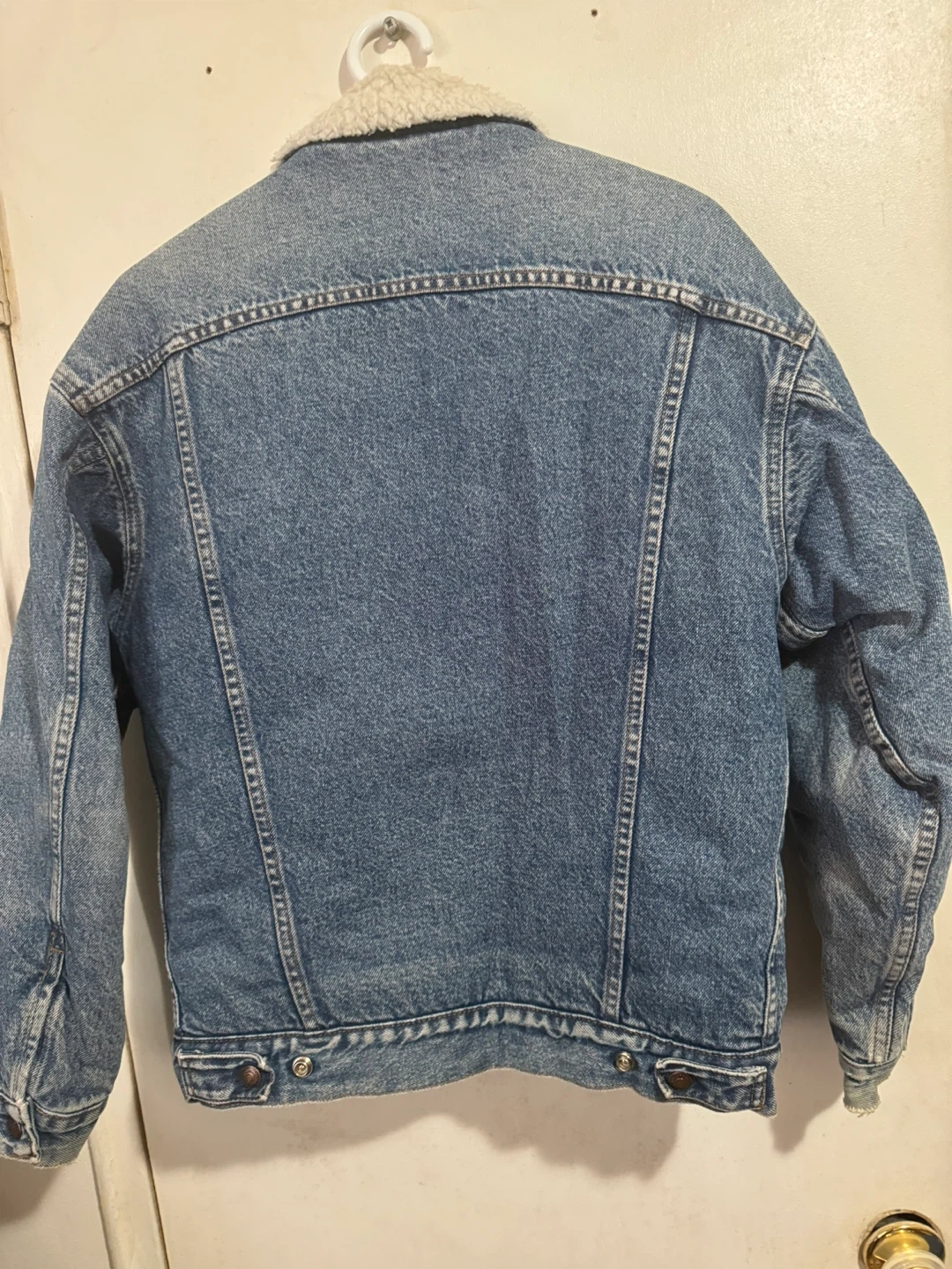 This is a classic Levi's denim jacket with a cozy sherpa lining. It features the iconic Levi's red tab and is made in the USA. Size is small.