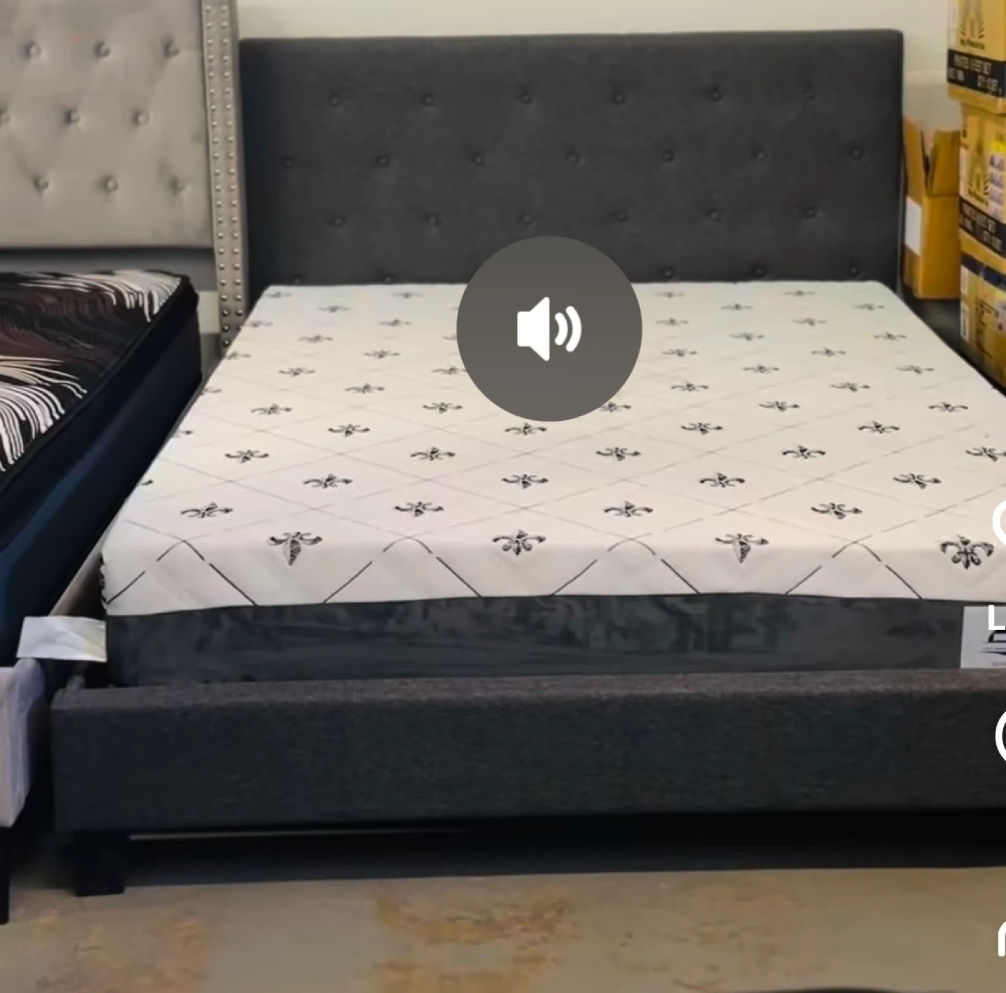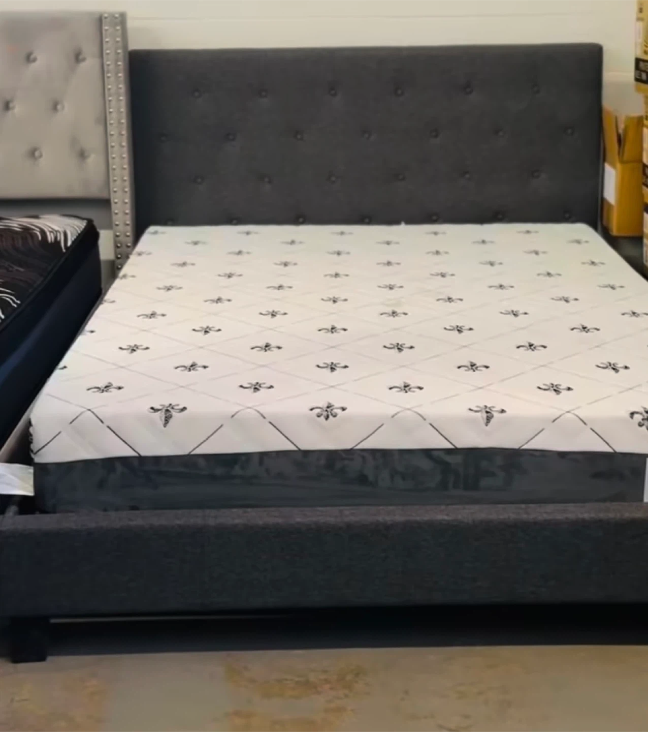 Grey upholstered queen bed frame featuring a stylish tufted headboard. It's a sturdy and modern addition to any bedroom! This frame offers a clean look and ample support for your mattress.