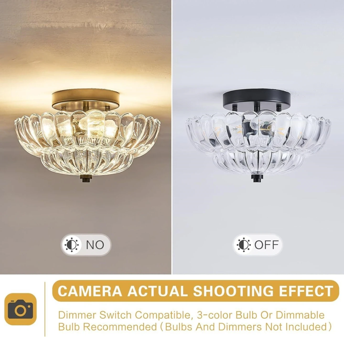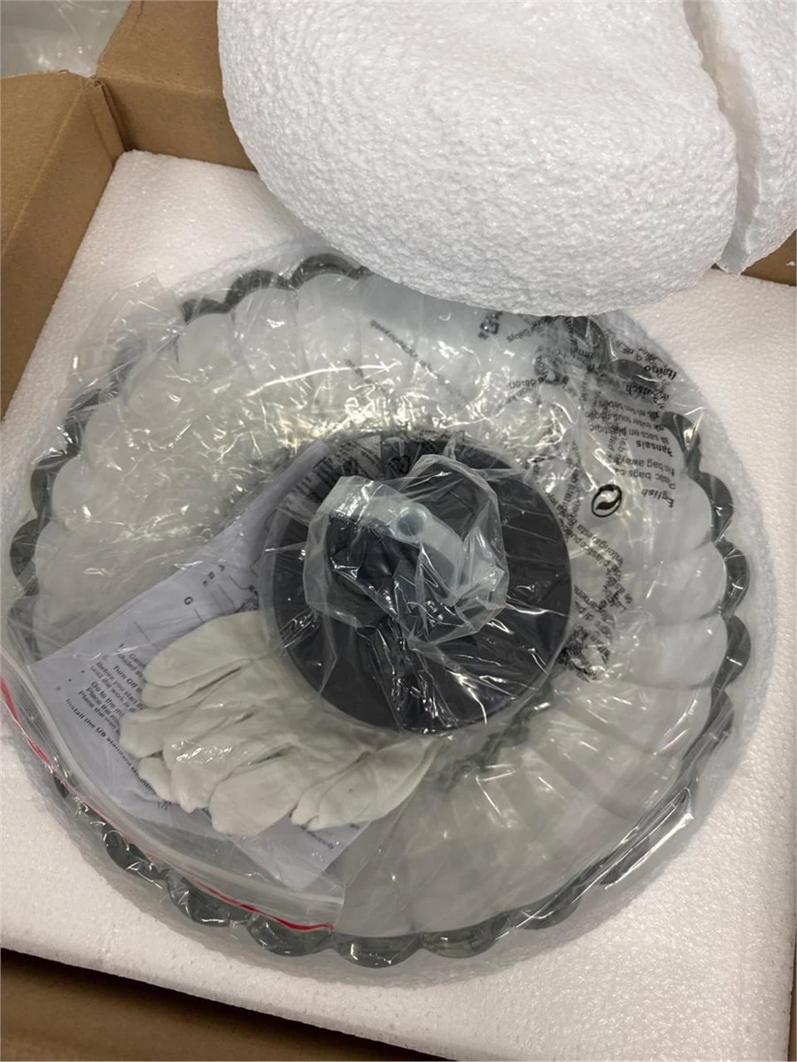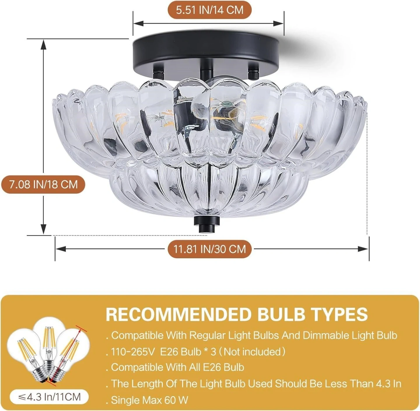This stylish flush mount ceiling light fixture features a clear glass shade with a scalloped edge. It's compatible with dimmer switches and E26 bulbs up to 60W. The fixture has a diameter of 11.81 inches and a height of 7.08 inches.
