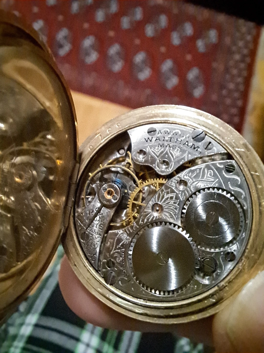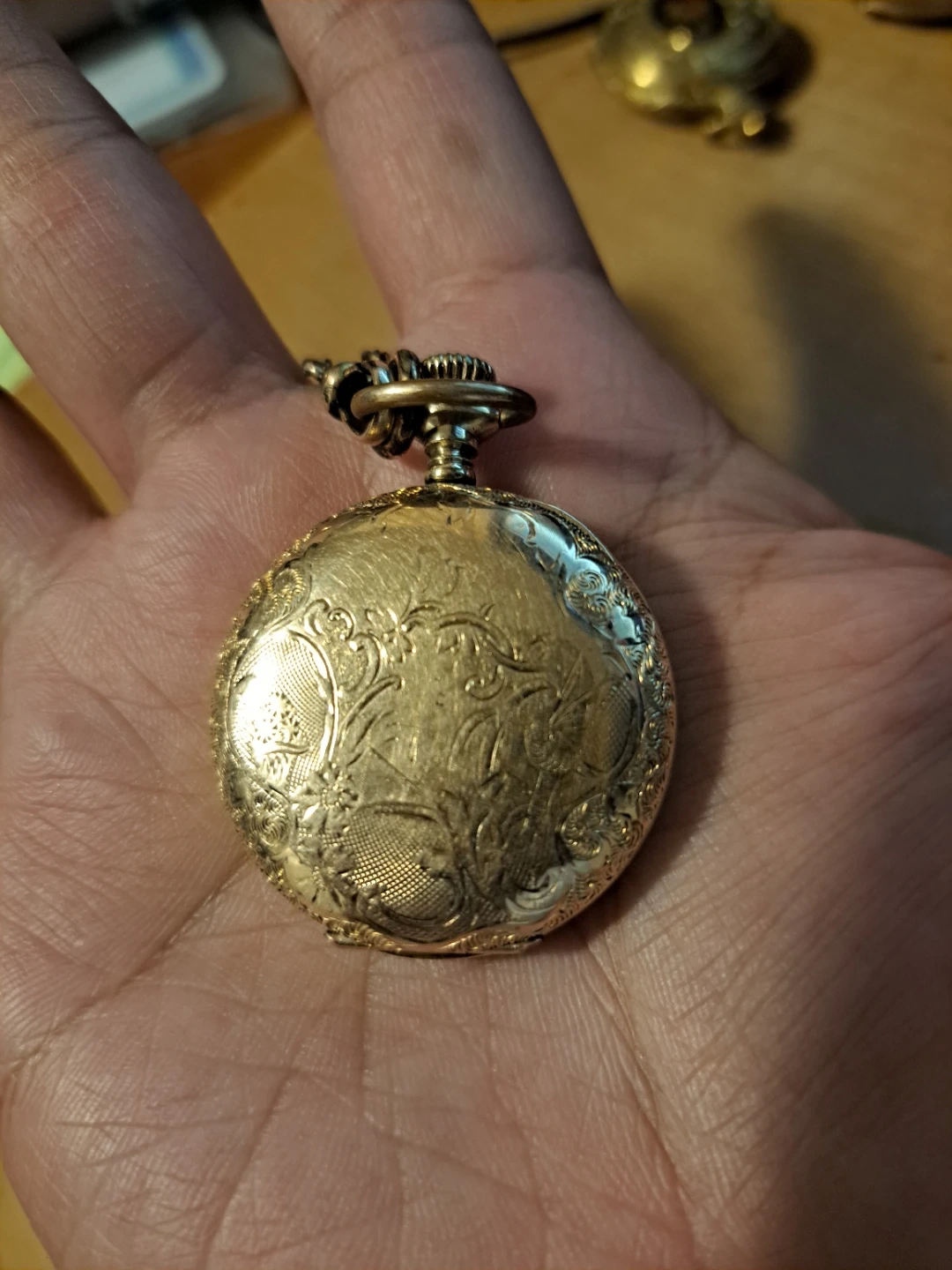 This is a vintage Waltham pocket watch. It's gold filled extra and comes with a decorative chain. The watch case has intricate floral engravings.