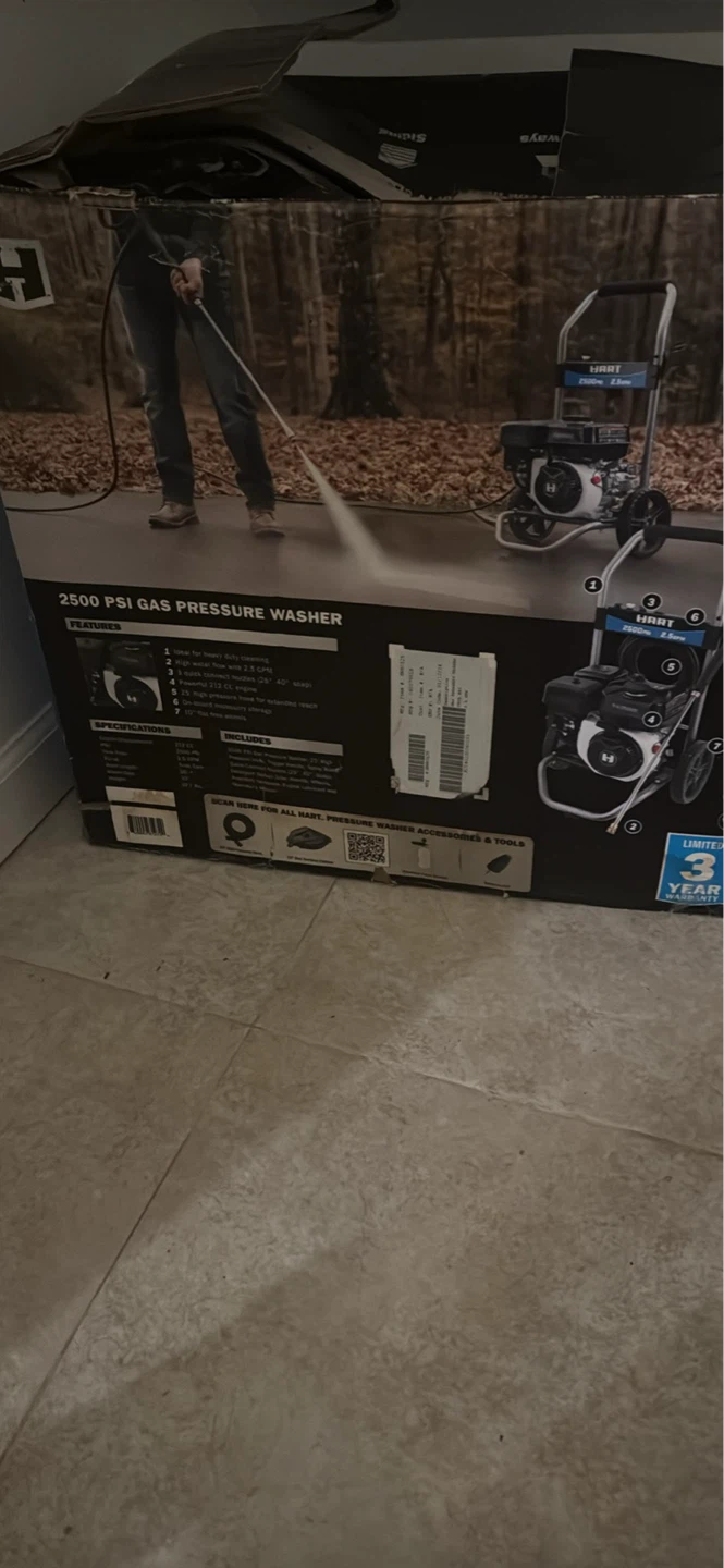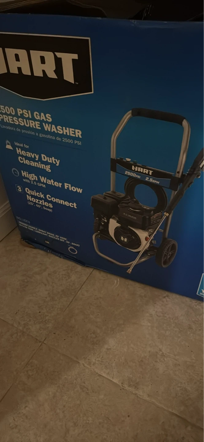 This HART gas pressure washer delivers 2500 PSI for heavy duty cleaning. It features high water flow with 3 quick connect nozzles. Includes wand, spray gun, and hose.
