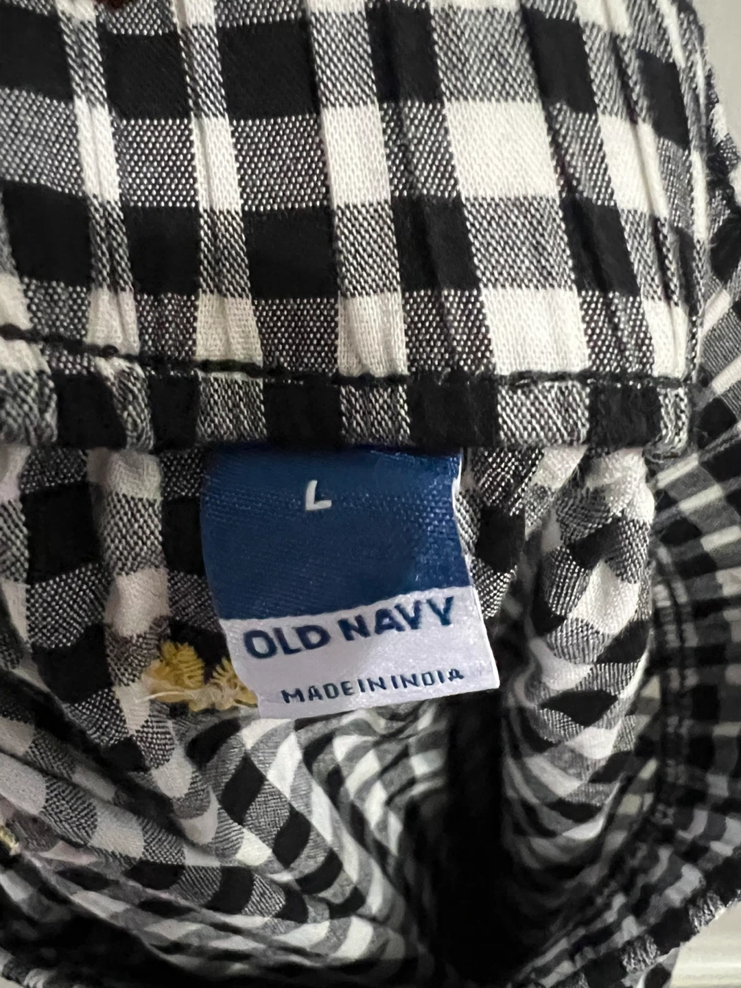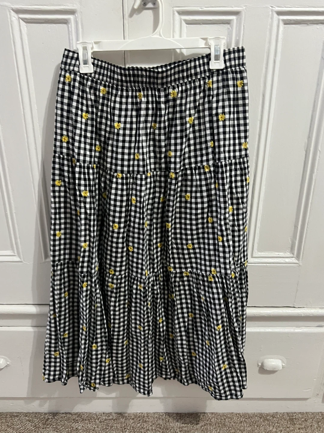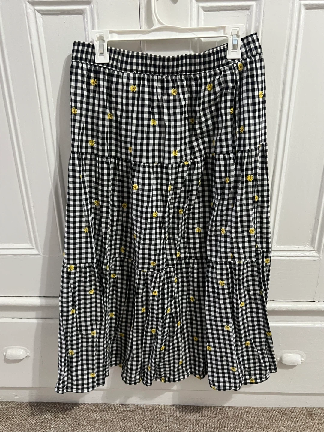This midi skirt features a black and white gingham pattern with cute yellow flower embroidery. It's a tiered design for a flowy look. Made of lightweight fabric, has pockets, and a stretchy elastic waistband. Size large