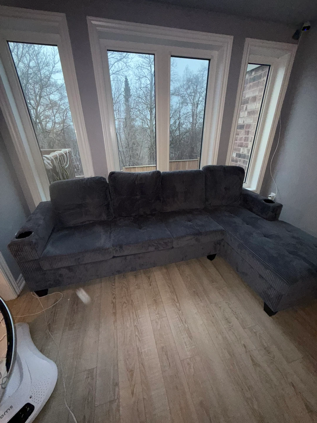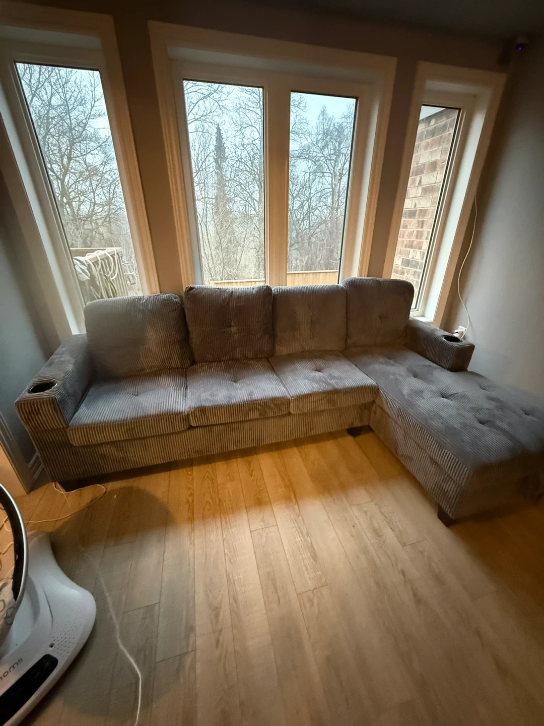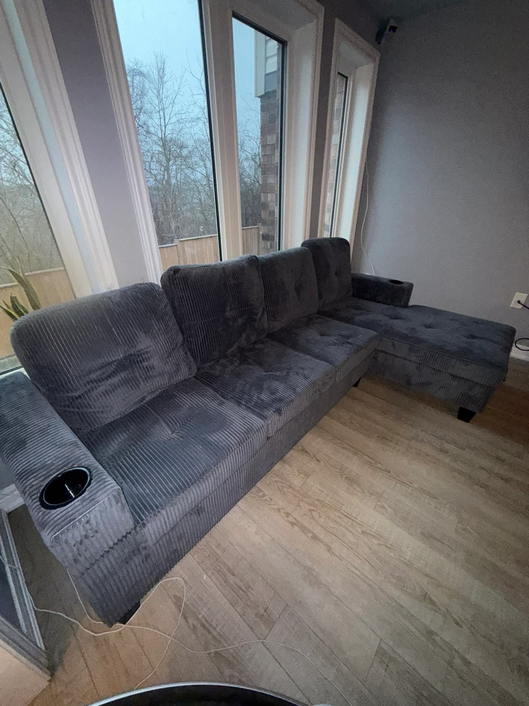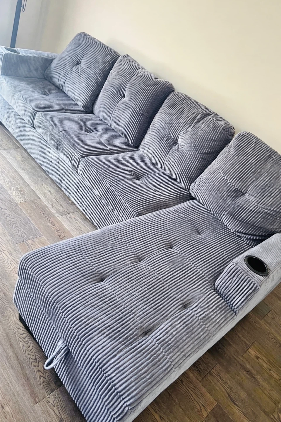 Comfortable grey corduroy sectional sofa with built-in cupholders on each armrest. It's a spacious couch that offers plenty of seating. The corduroy fabric adds a cozy texture to the room.