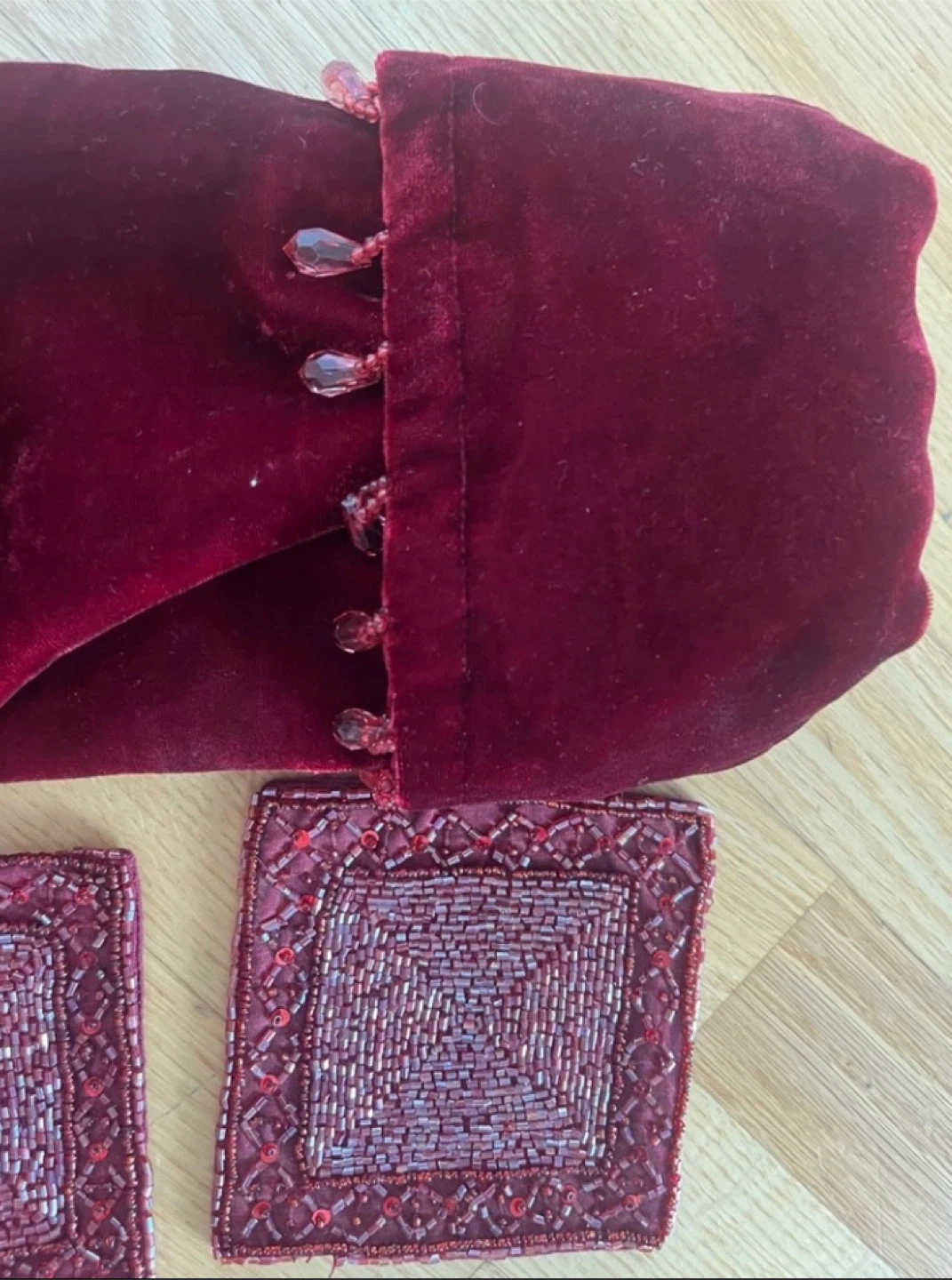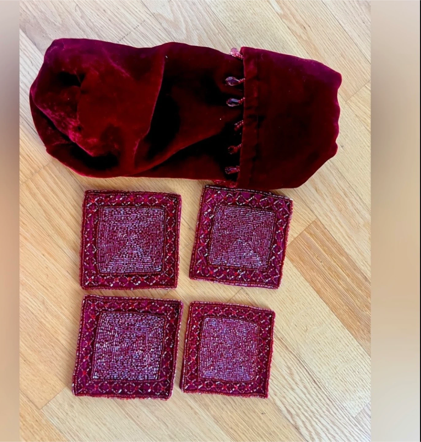 Selling a set of 4 Pottery Barn velvet coasters. They come with a matching velvet pouch for storage. The coasters are a beautiful deep red color and feature intricate beadwork. Perfect for adding a touch of elegance to your home!