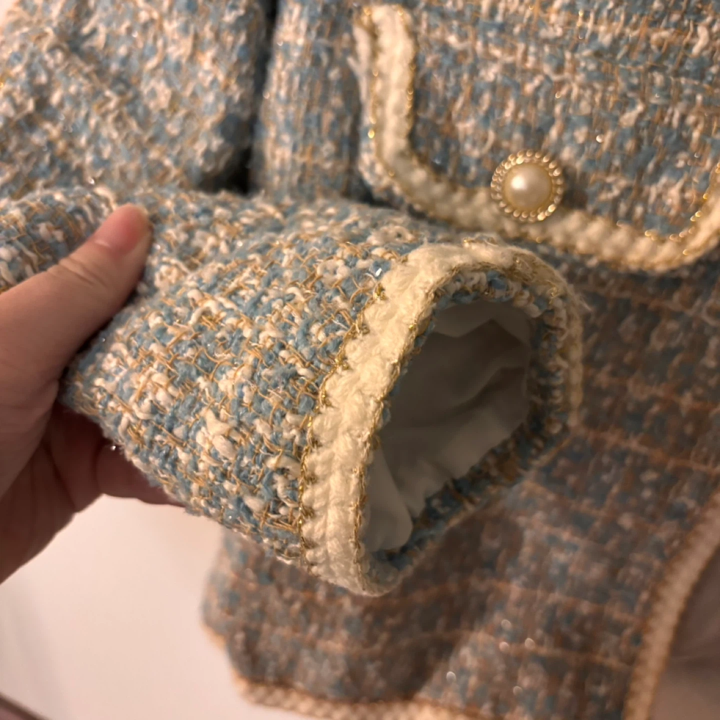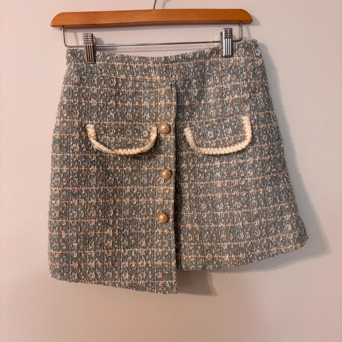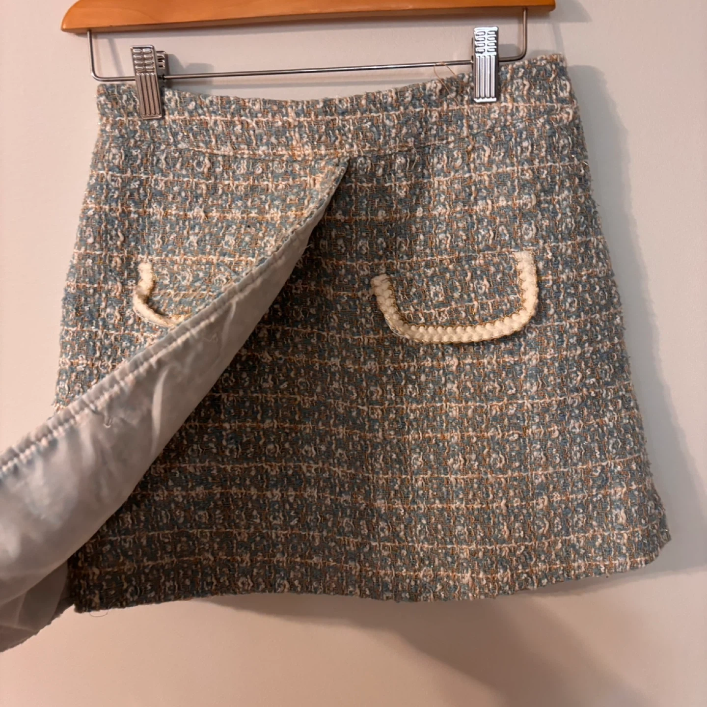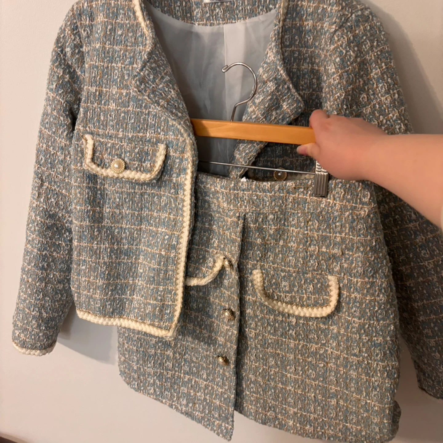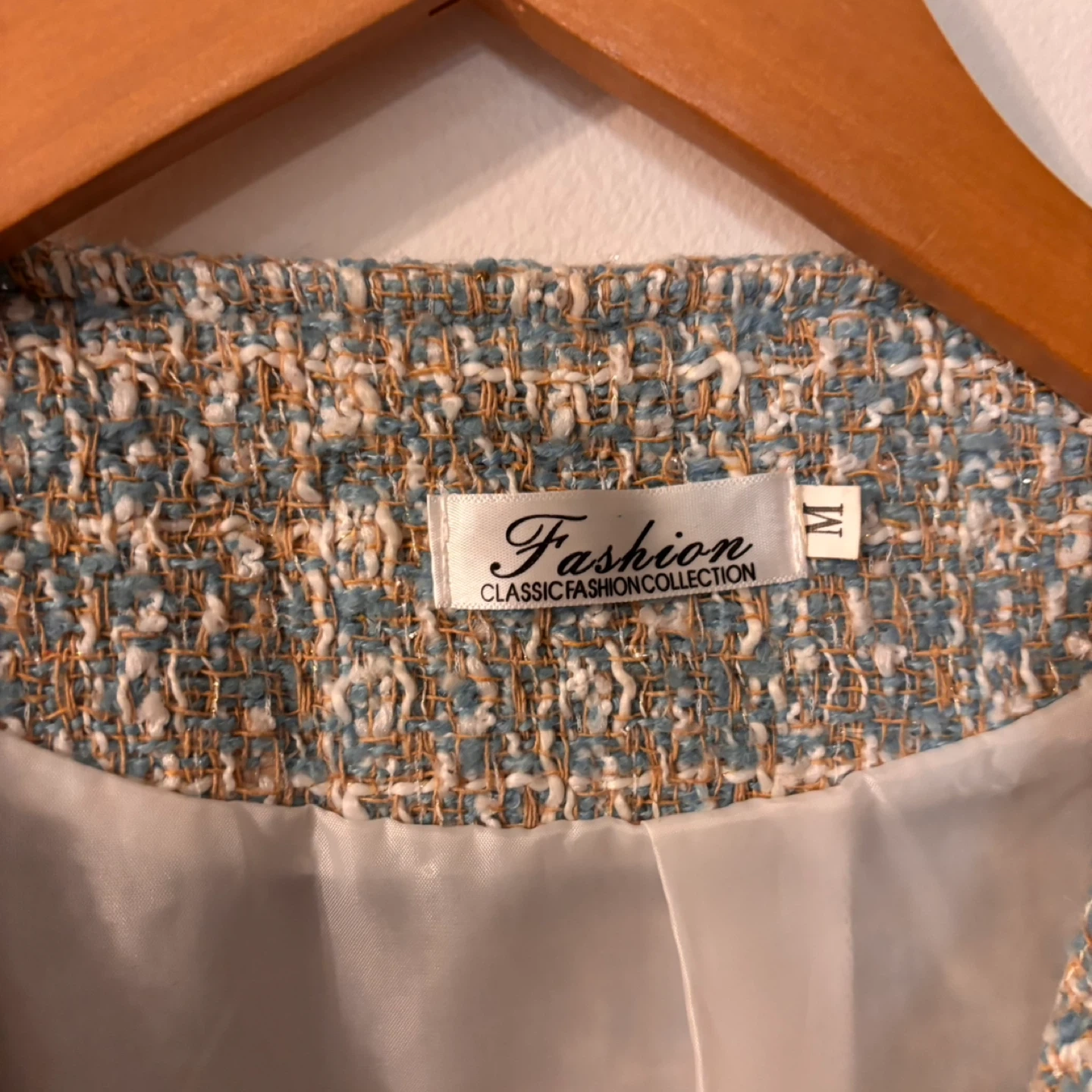 Two-piece set featuring a tweed jacket and matching skirt. Both pieces have decorative pearl buttons and cream trim. Great for a stylish look!