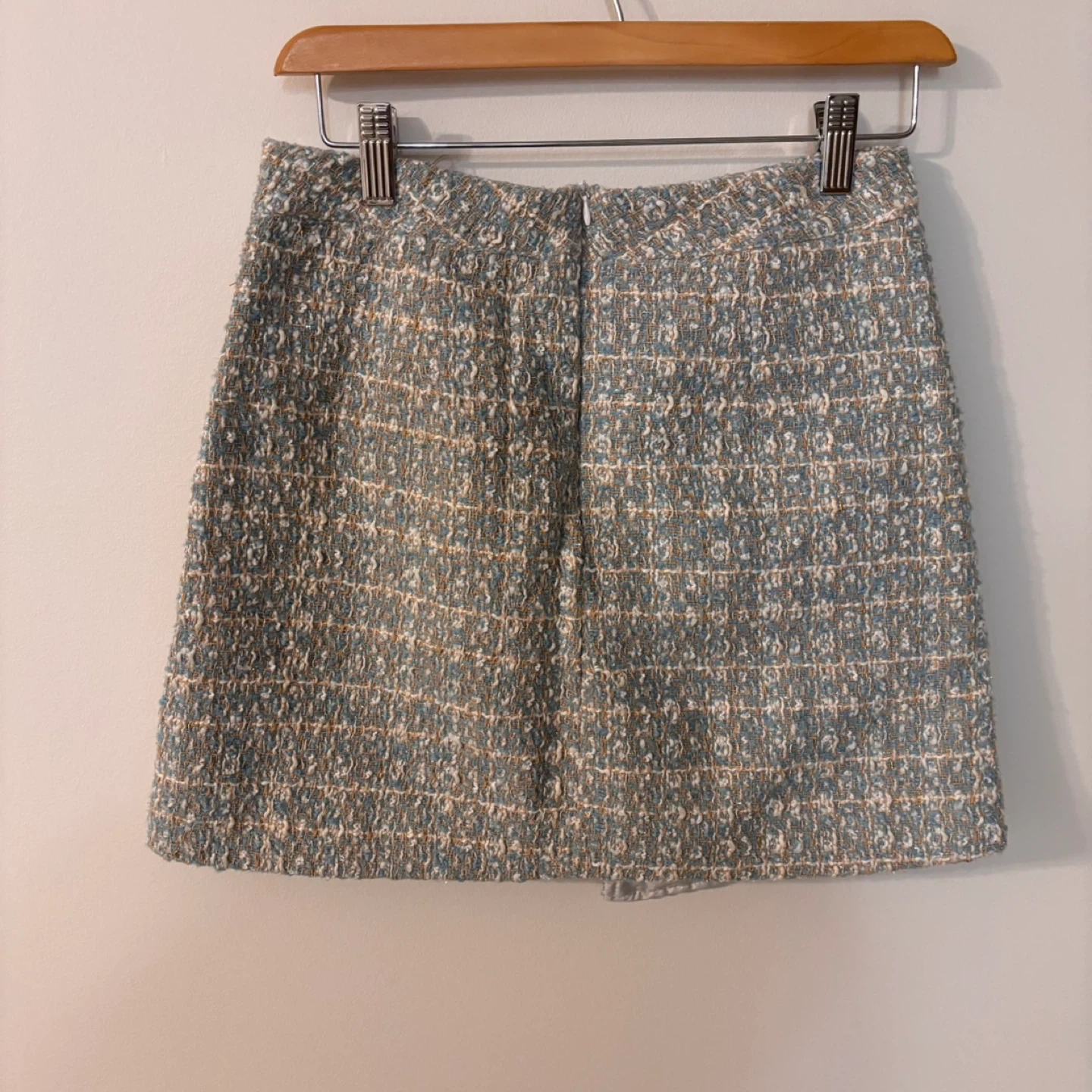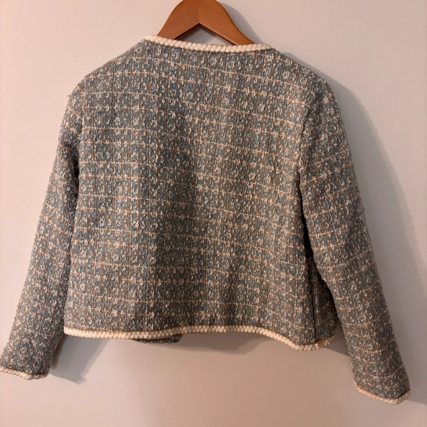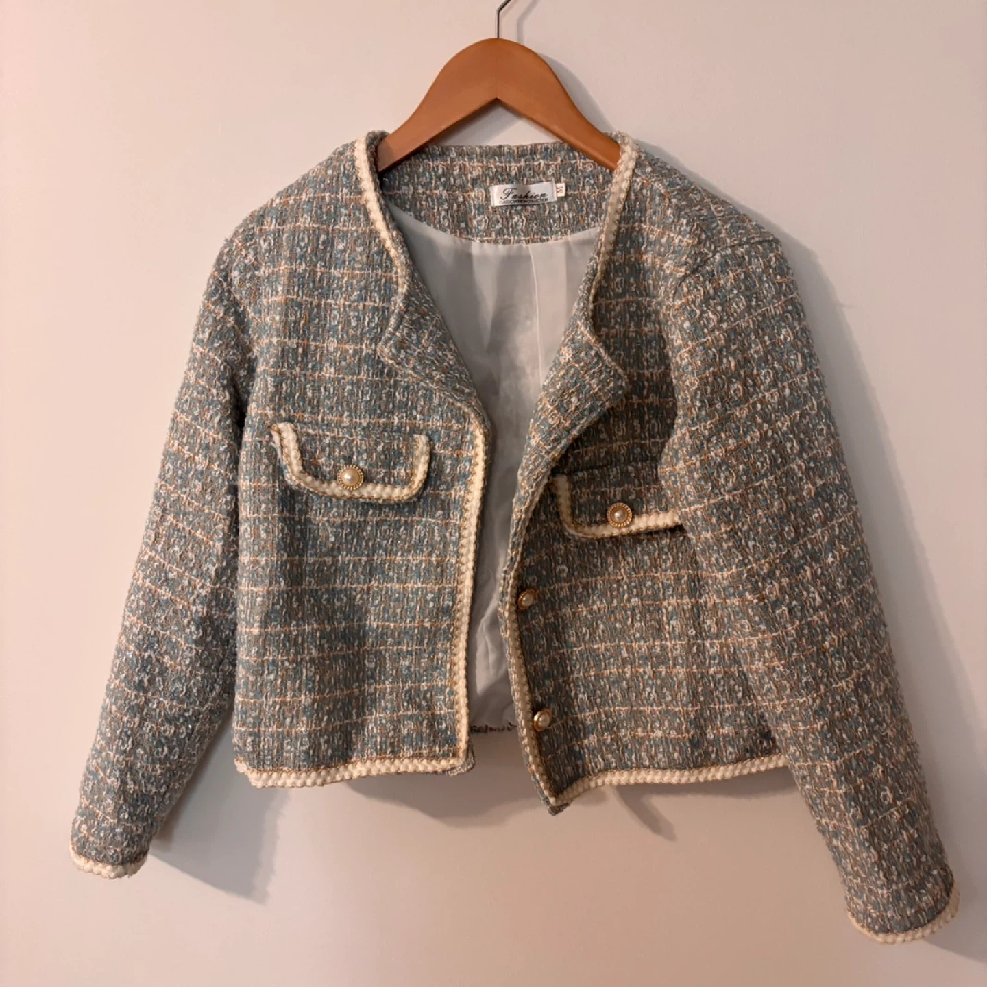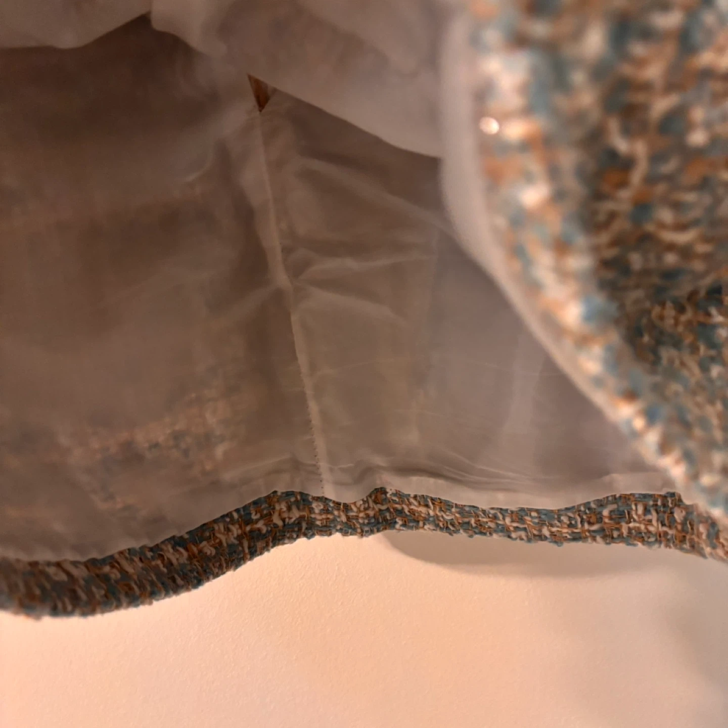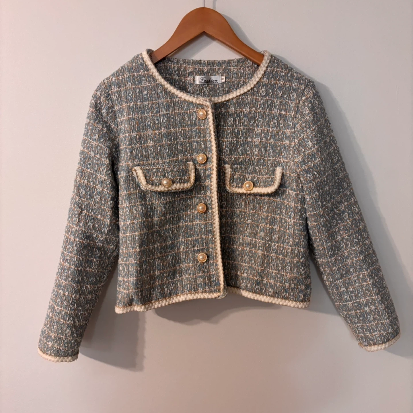 Two-piece set featuring a tweed jacket and matching skirt. Both pieces have decorative pearl buttons and cream trim. Great for a stylish look!