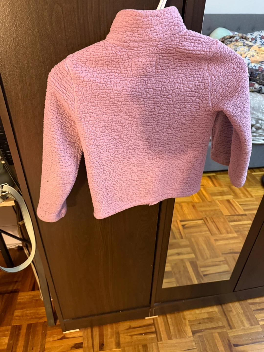 A cute pink zip-up fleece jacket for girls. It's soft and cozy, perfect for cooler weather. The jacket has two front pockets and a stand-up collar. XS size