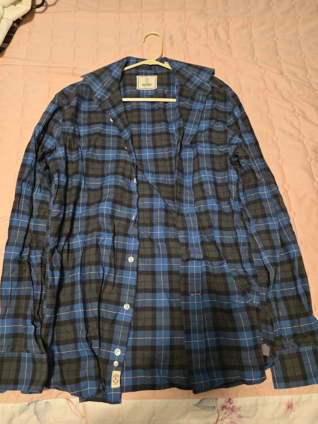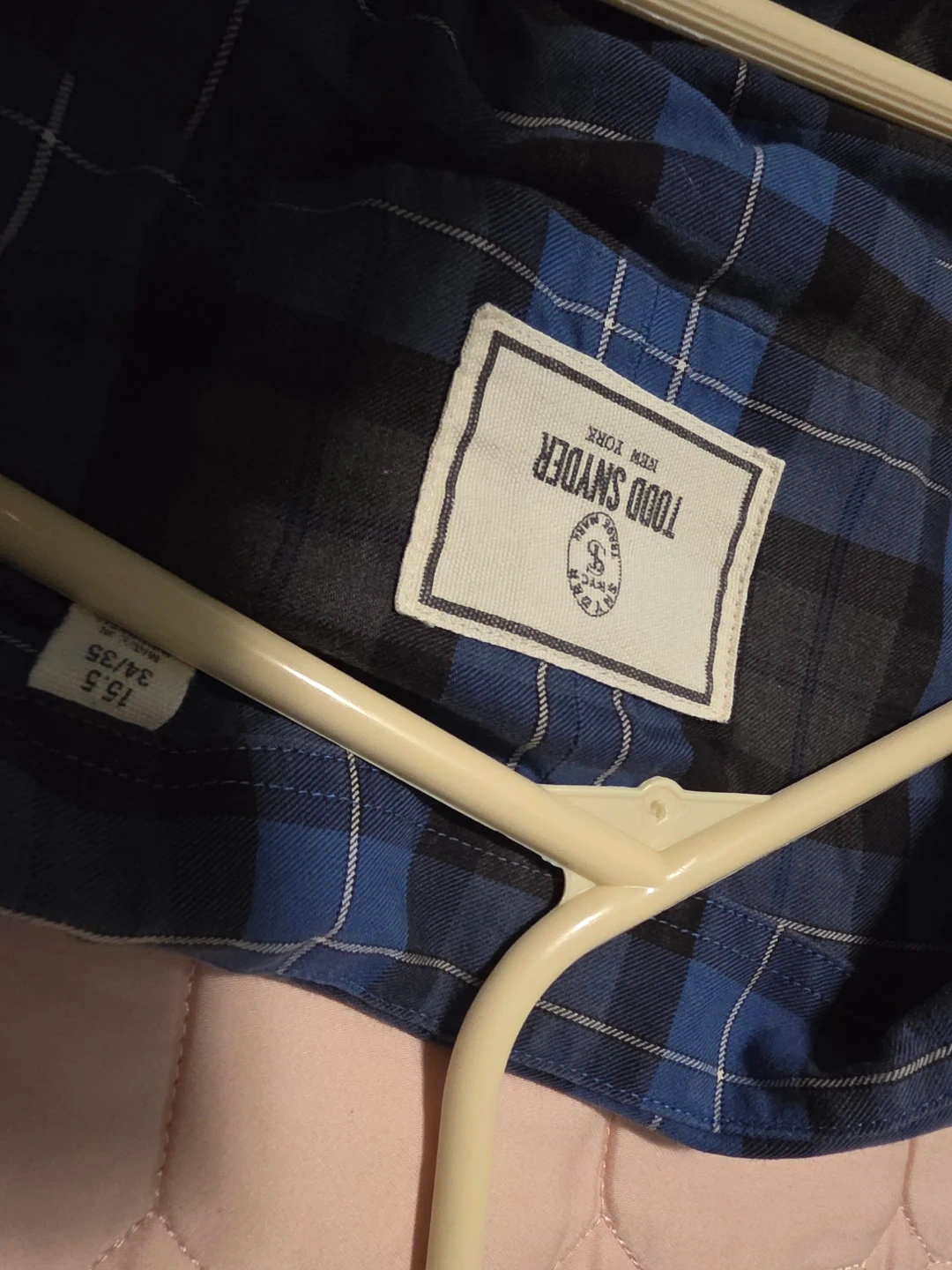 Todd Snyder button-down shirt in a blue and gray plaid pattern. It's a size 15.5, 34/35. Cotton fabric construction. This shirt is perfect for casual wear.