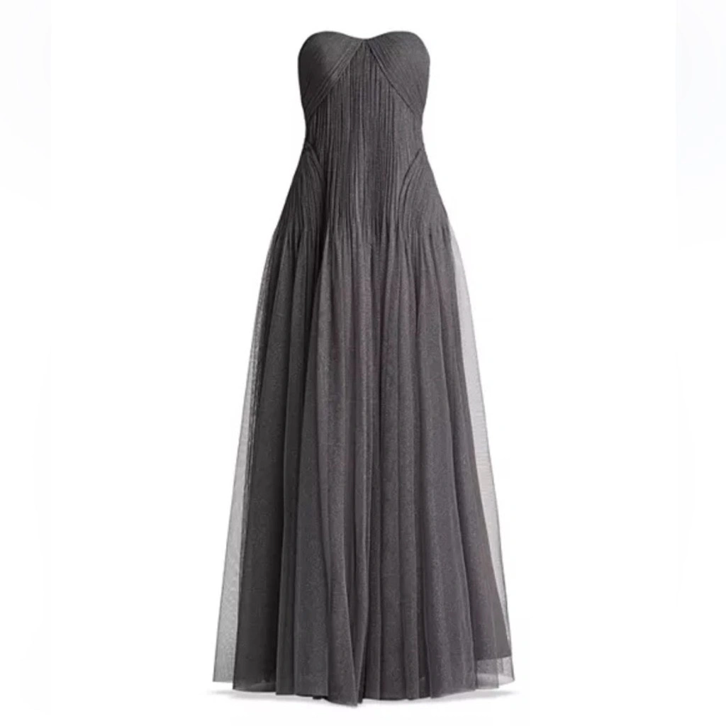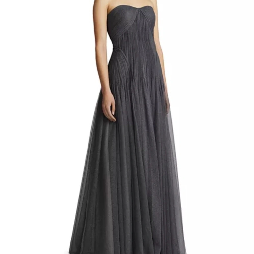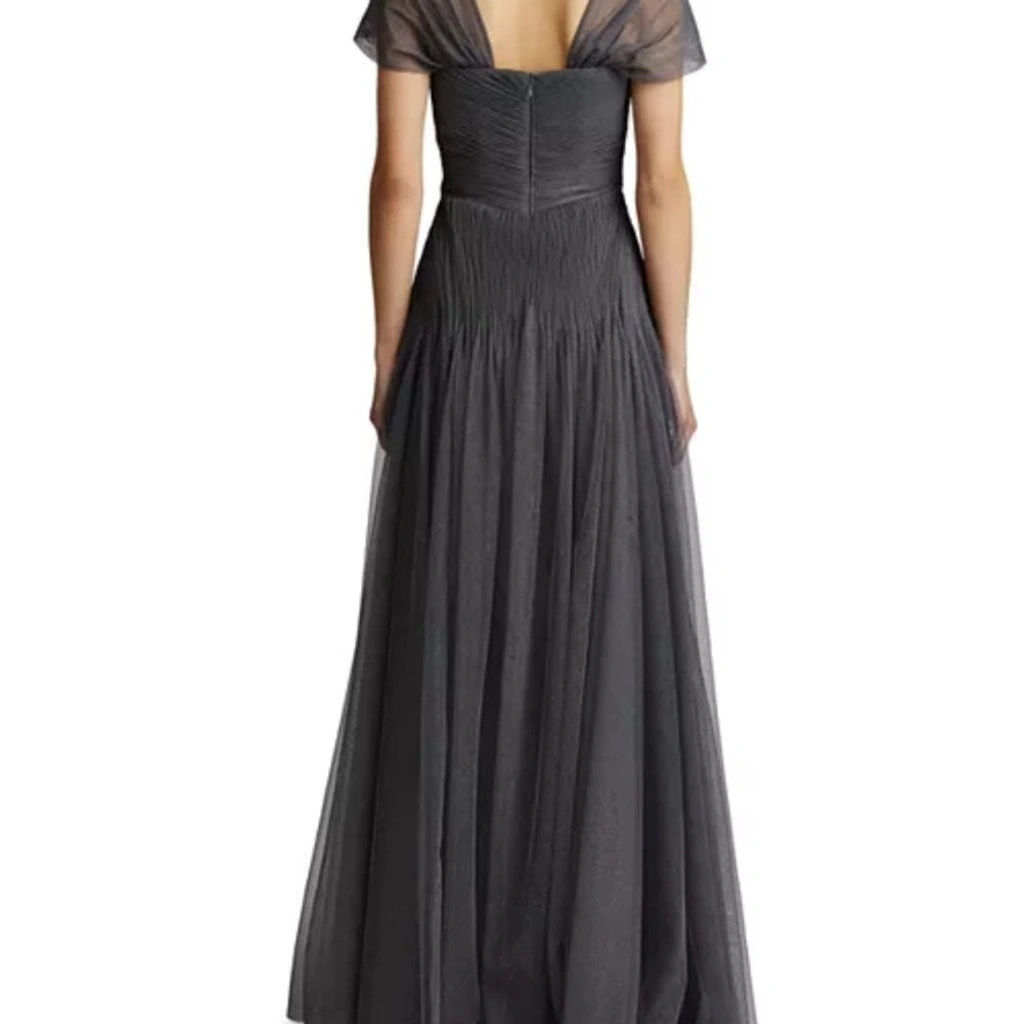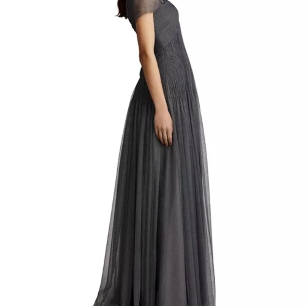 This is a beautiful Zac Posen gown in silver, size 4. It features a cap sleeve and a lovely tulle fabric. The style is A-line and the dress length is long. It's new with tags.