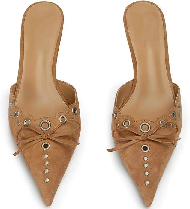 Womens Kitten Heels, Bow Studded Heeled Mules Pointed Toe Low Heel Sandals Slip on Kitten Heel Pumps