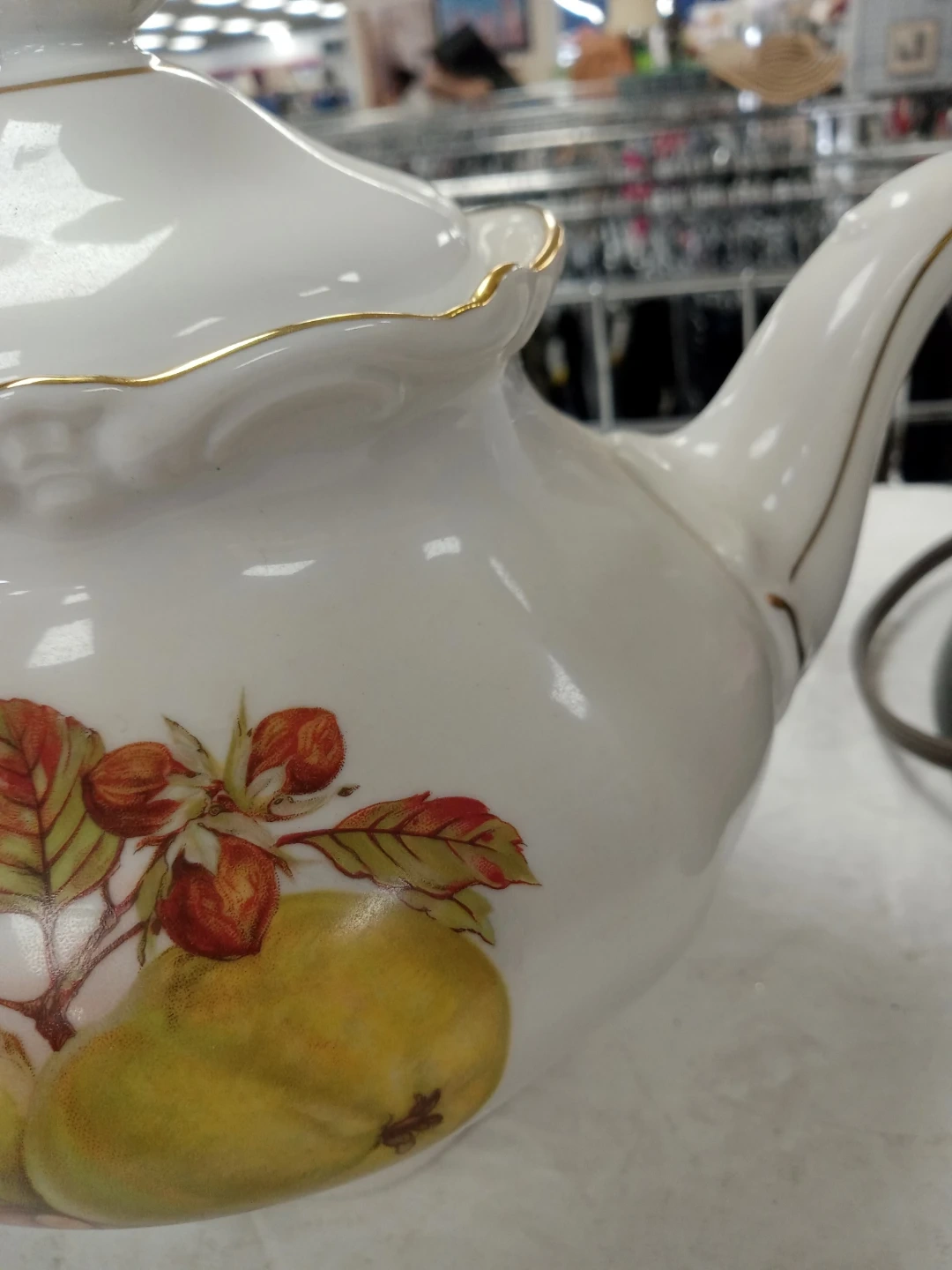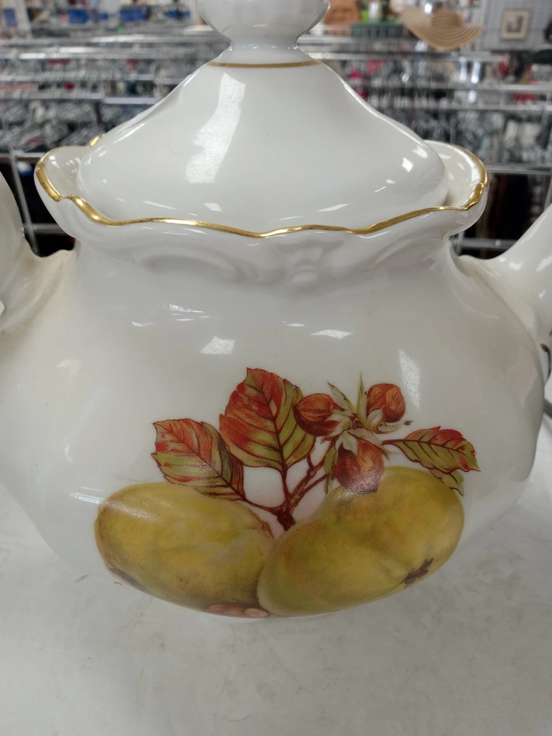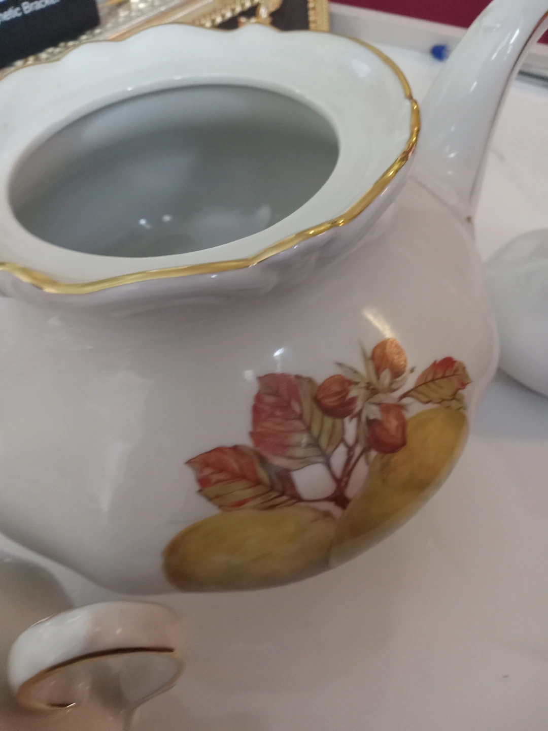 White porcelain teapot with gold trim and a fruit and leaf design. Made in Western Germany by Winterling.