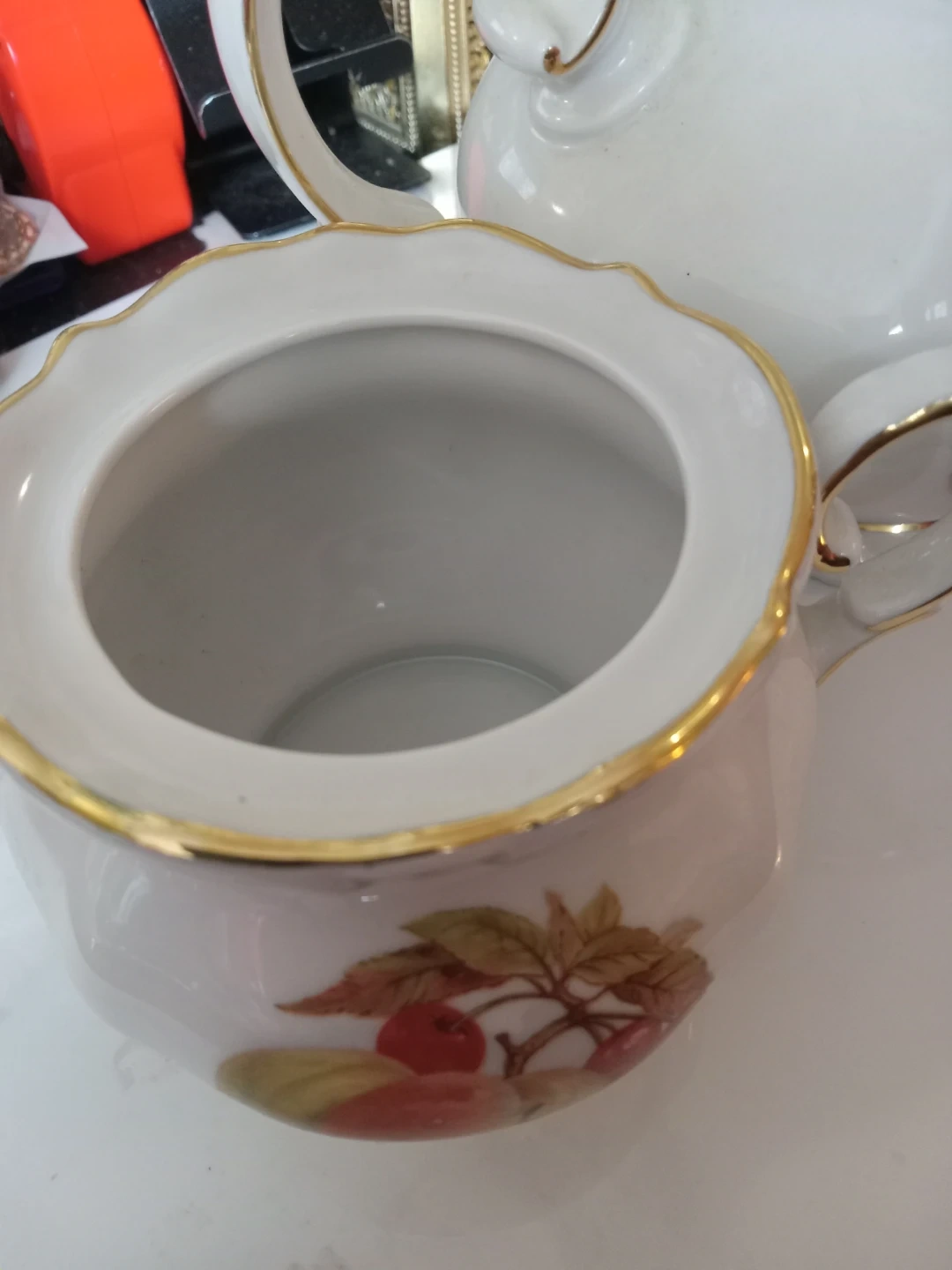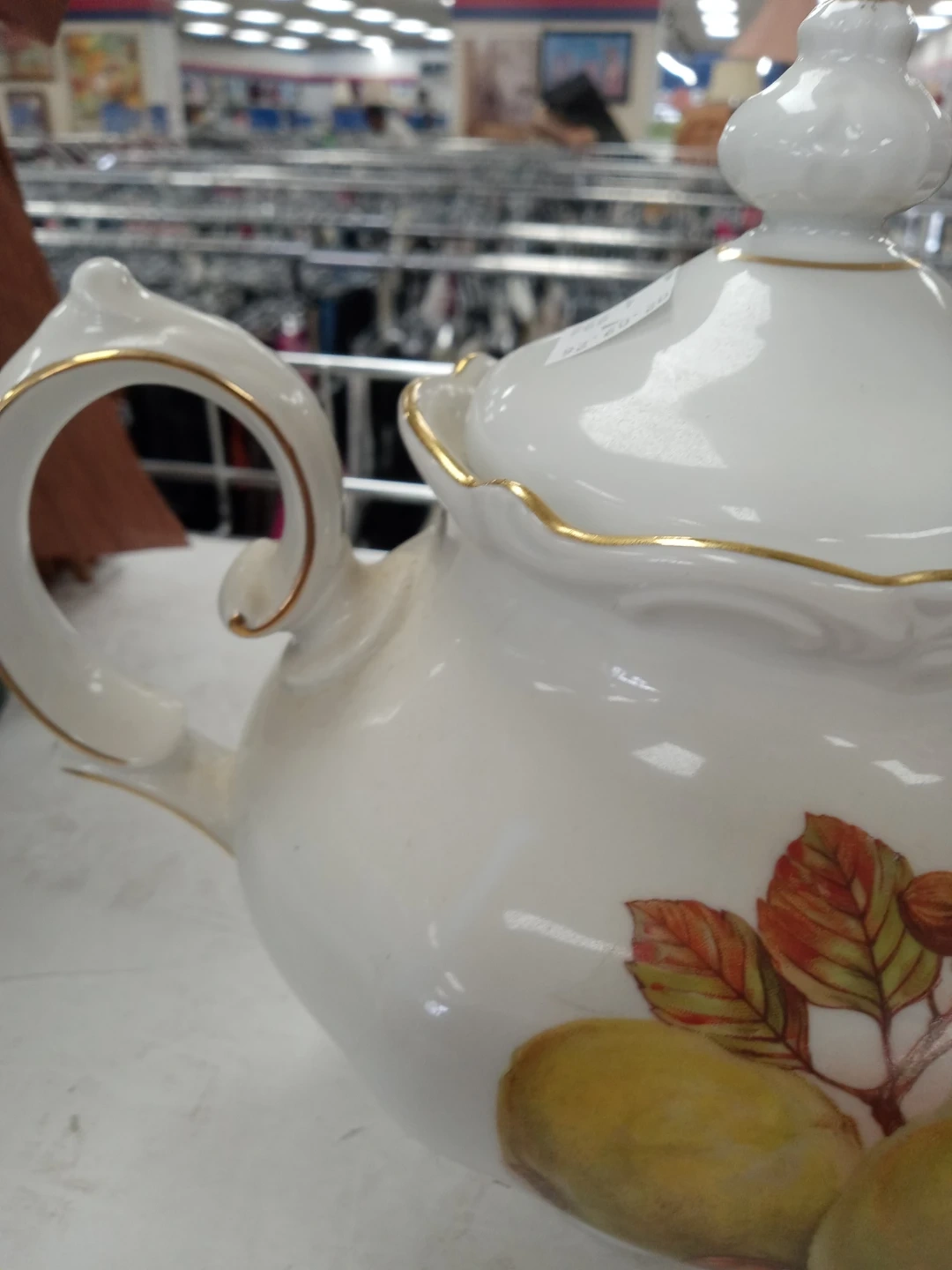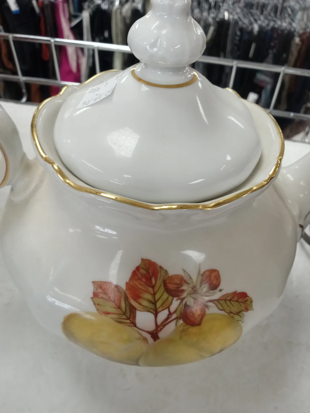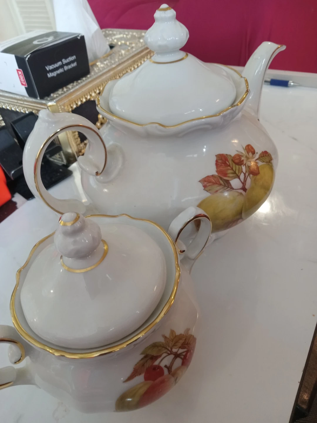 White porcelain teapot with gold trim and a fruit and leaf design. Made in Western Germany by Winterling.