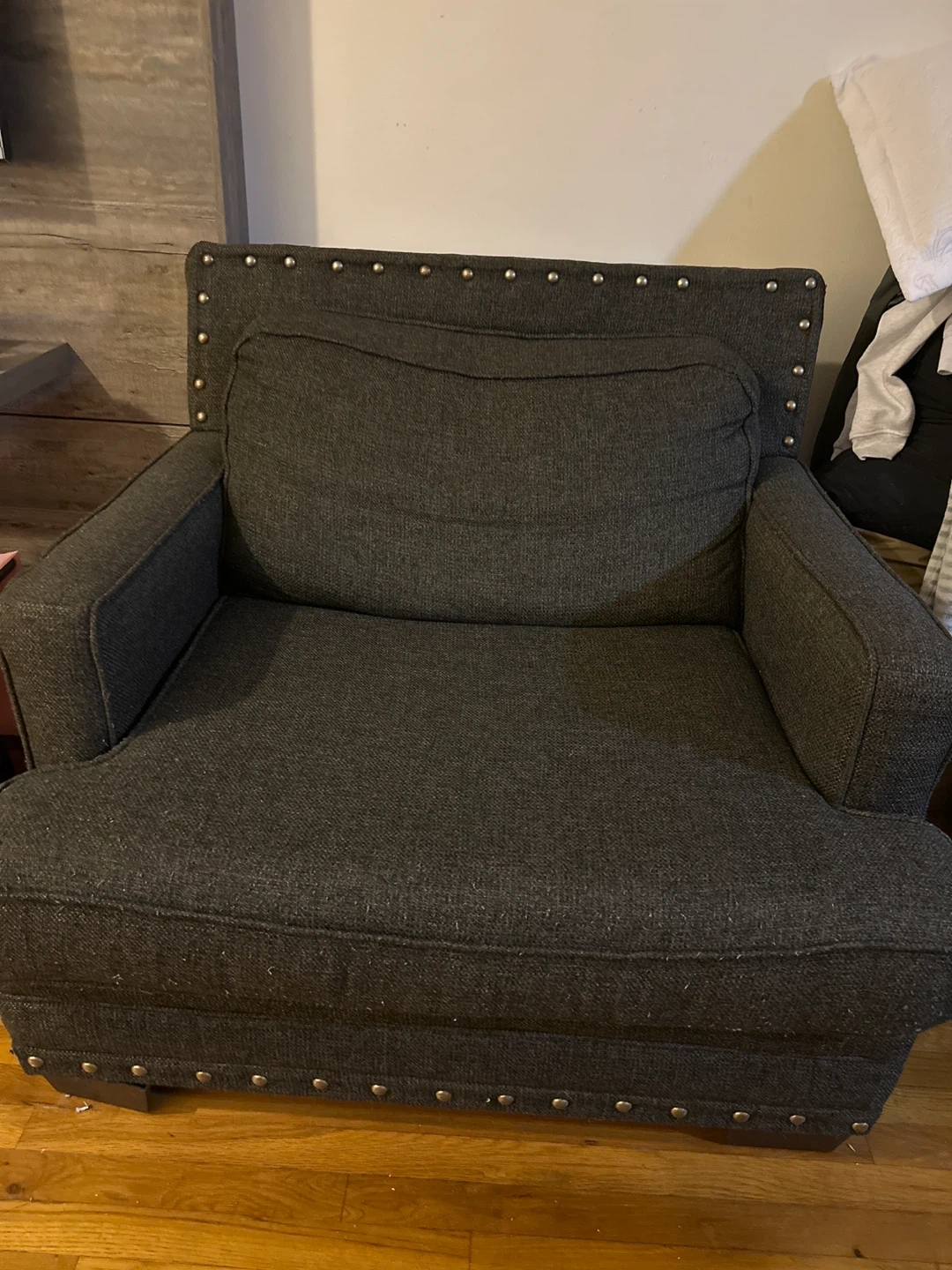 Comfortable gray armchair with a sturdy build. It's in good condition and ready for a new home. Perfect for a reading nook or extra seating in your living room.