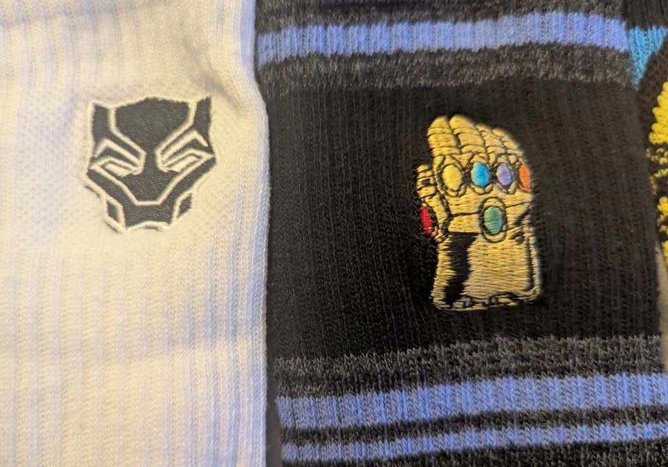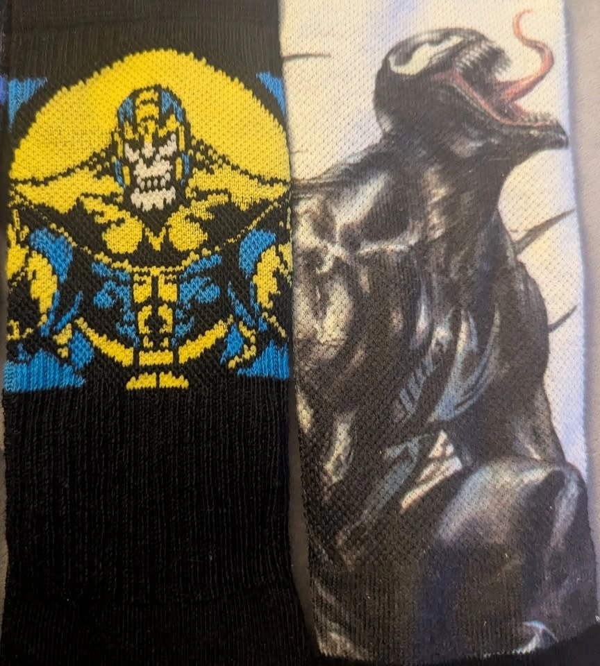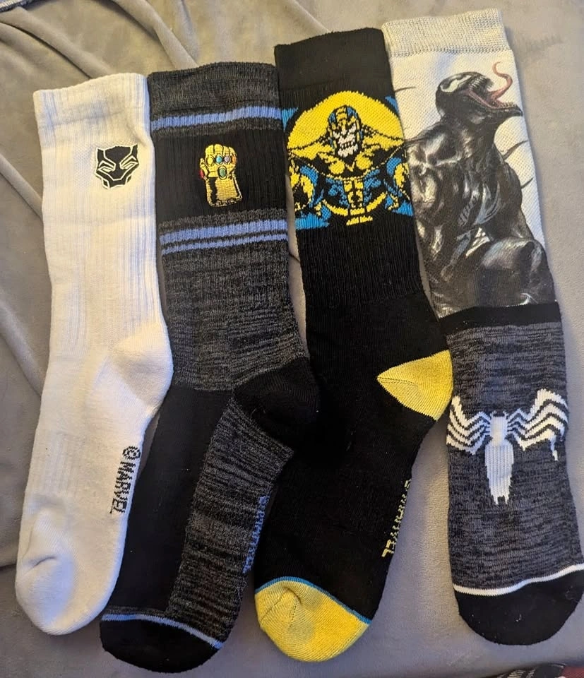 This is a collection of assorted Marvel Super Villain and Superhero socks featuring Black Panther, Venom, Thanos, and the Infinity Gauntlet. Happy to separate or combine with any of the other listings of socks and clothes that I've posted.