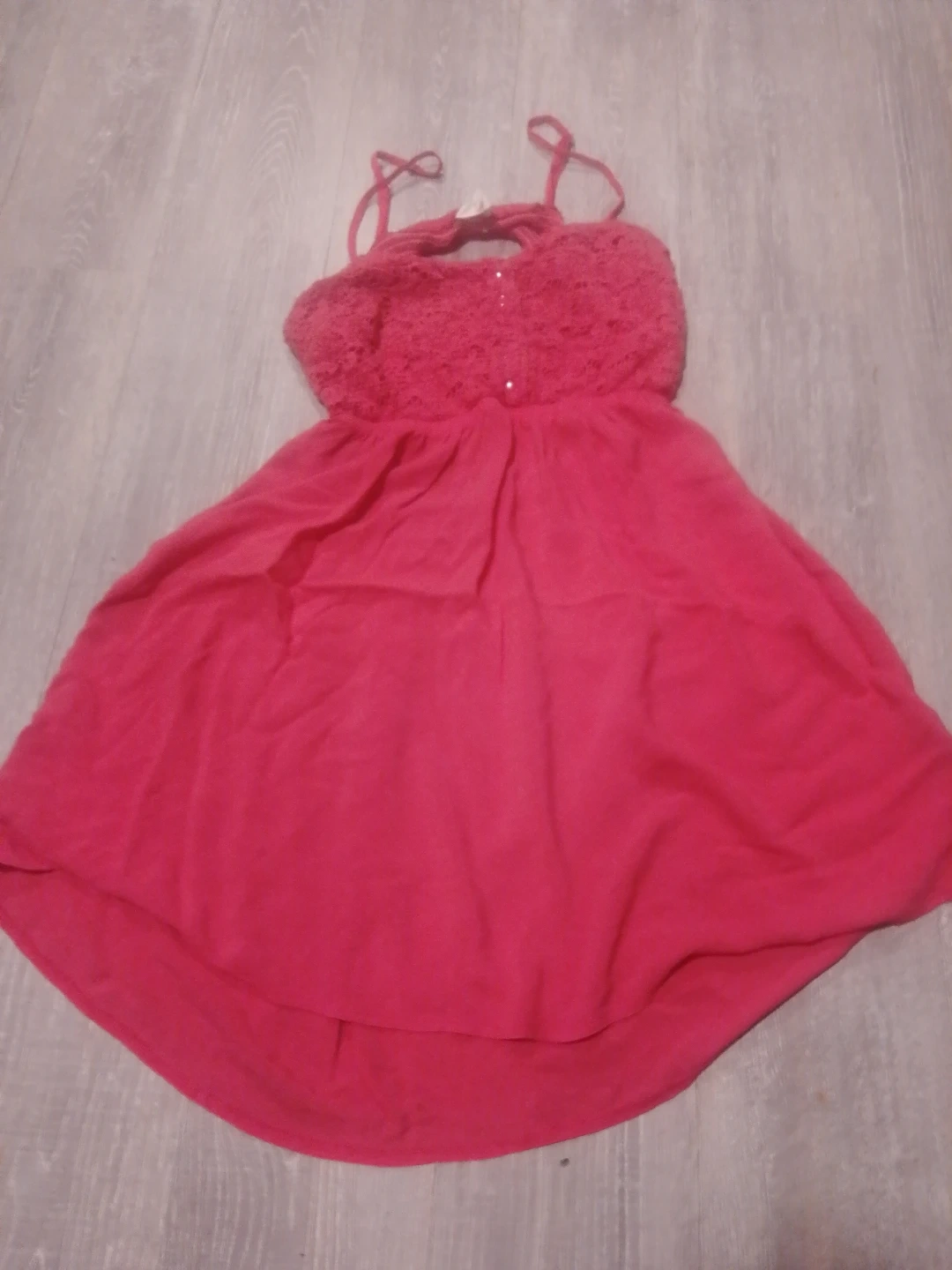 Pretty pink sundress with a lace bodice and a flowy skirt. It has adjustable spaghetti straps and a hi-low hemline. Great for summer days! 250 986 6851