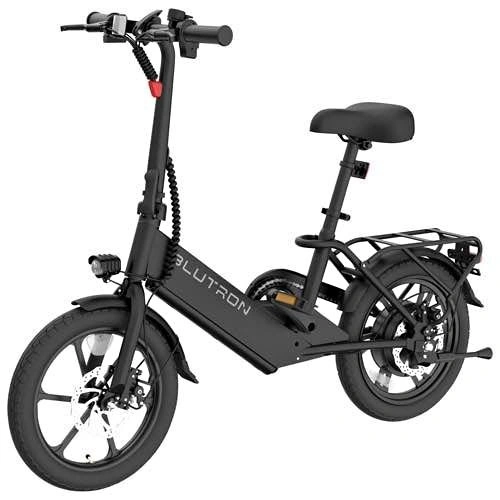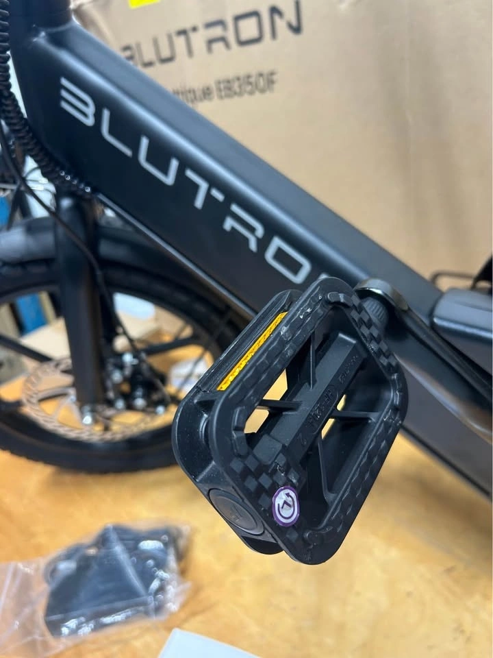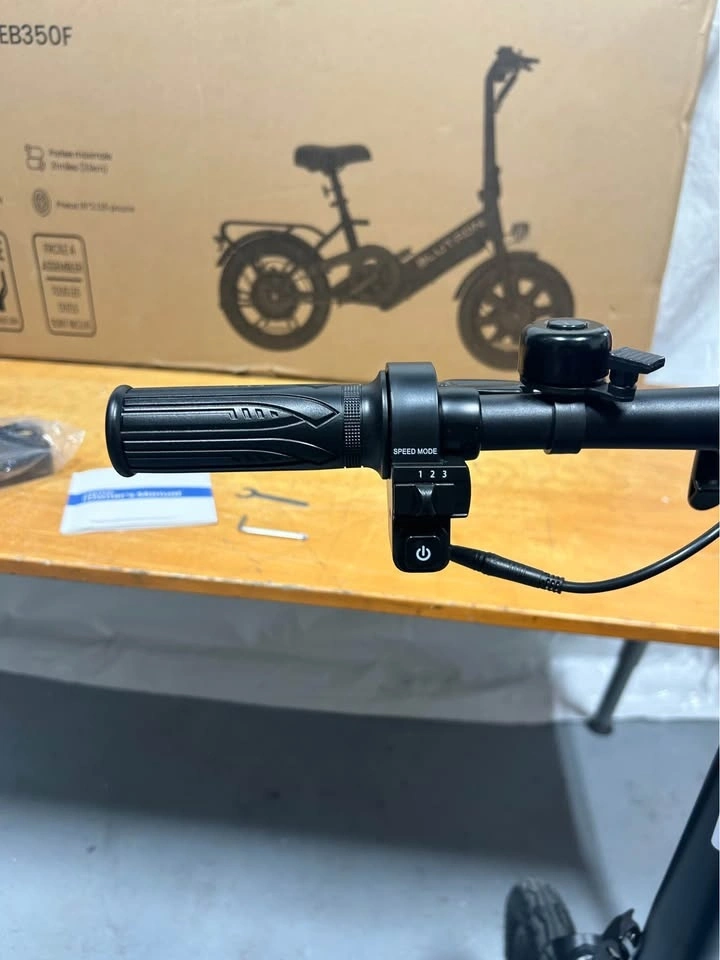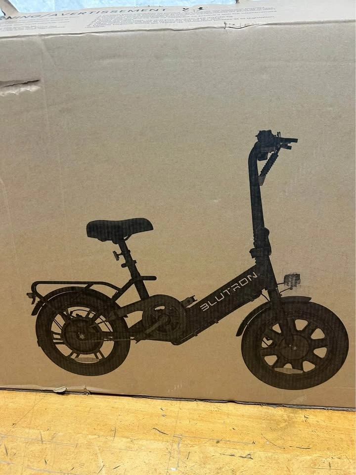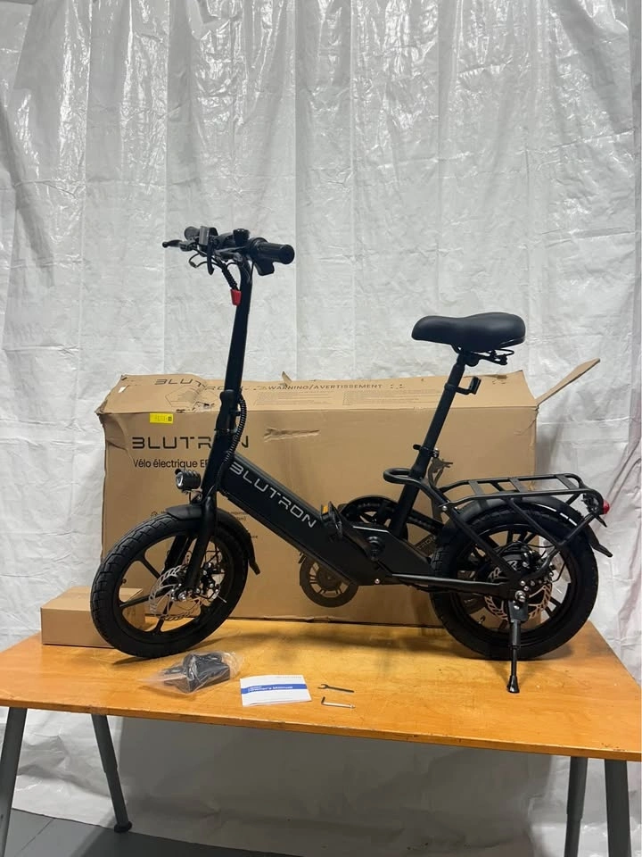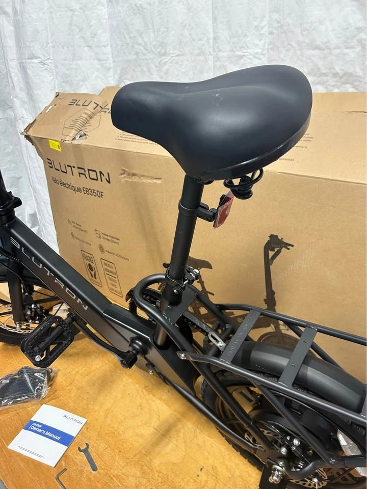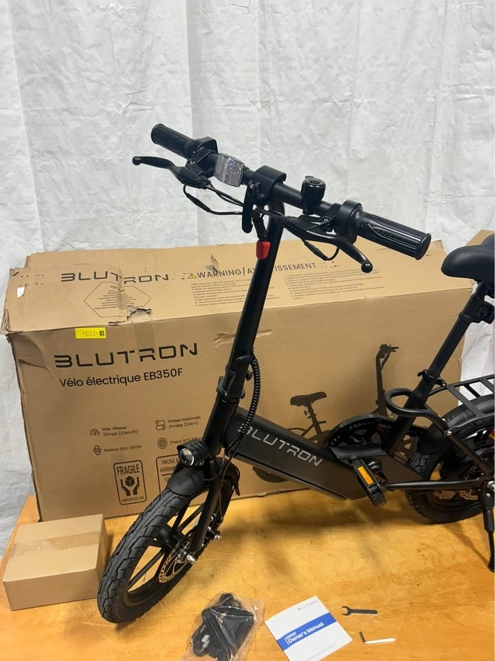 BRAND NEW Blutron EB350F foldable electric bike in black. It's a lightweight steel frame, making it easy to store and carry. Features include pedal assist and 3 throttle speeds, 16-inch tires, and front/rear disc brakes. It also has headlights and taillights. The bike is perfect for inner-city travel or pleasure riding. Includes charger, pedals, tools, and manual.