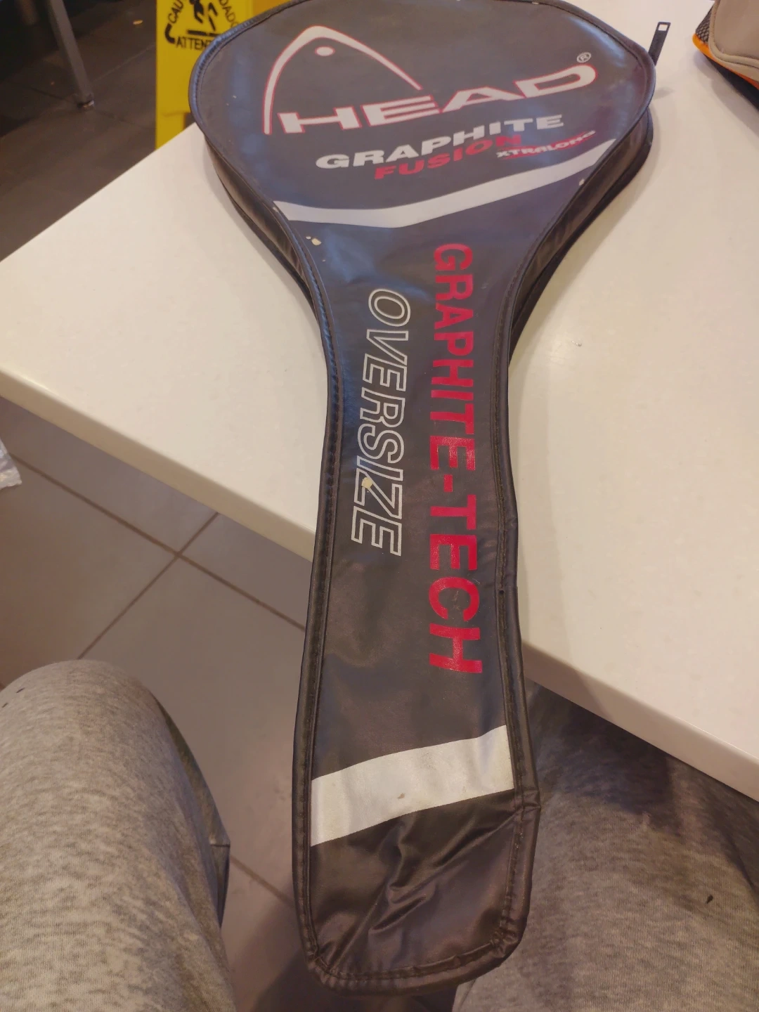 This is a Head Graphite Fusion Oversize tennis racquet cover. It's made of durable graphite-tech material. This cover is designed to protect your tennis racquet.