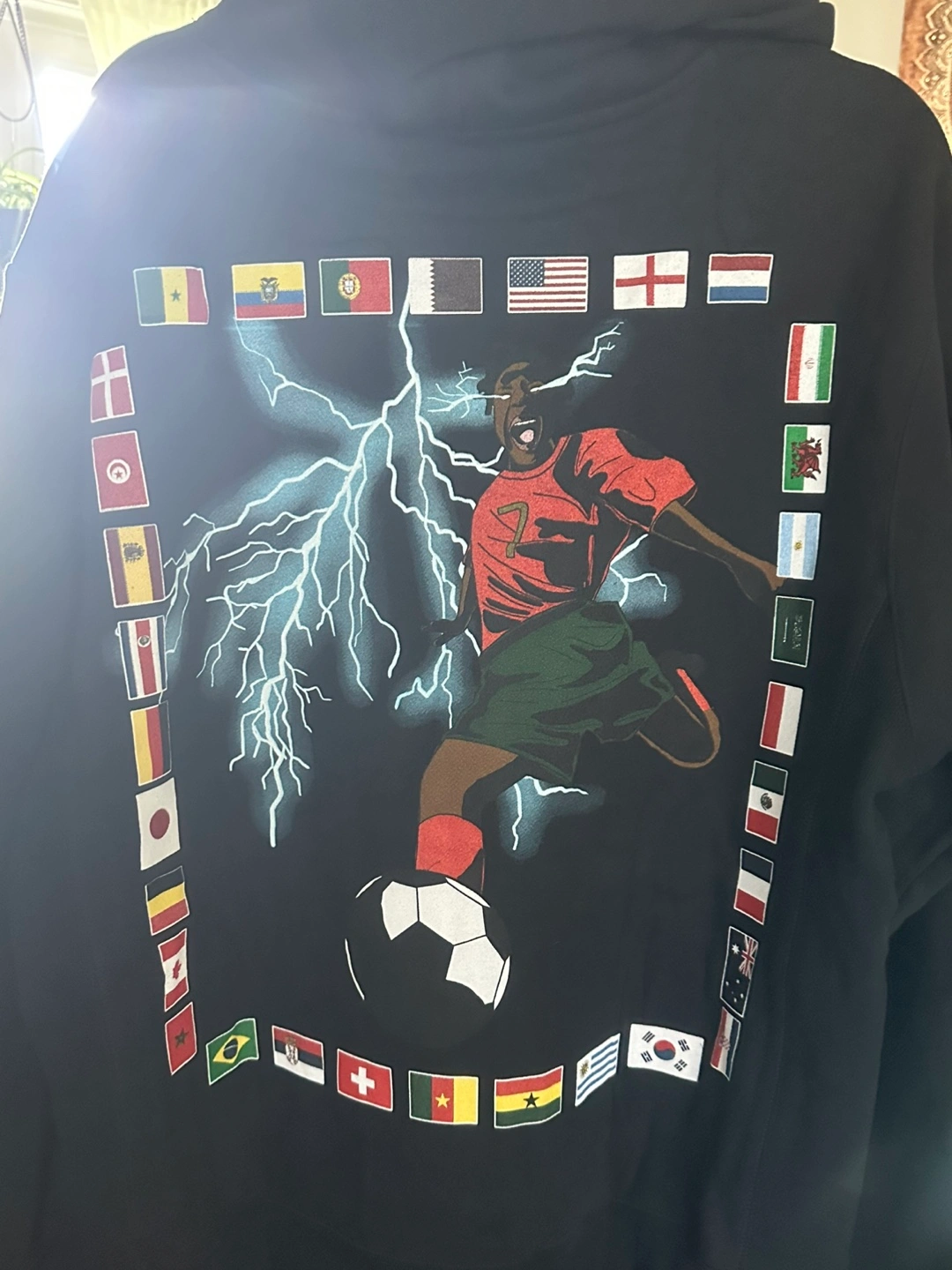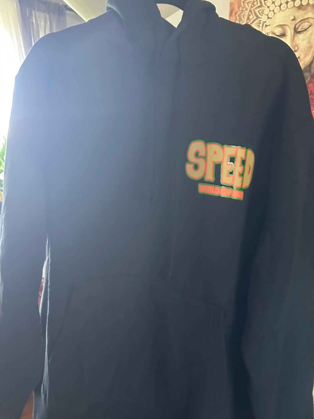 Selling a black SPEED hoodie from the World Cup 2022. It features a unique design with flags and a soccer player. The hoodie is in great condition and perfect for any soccer fan!