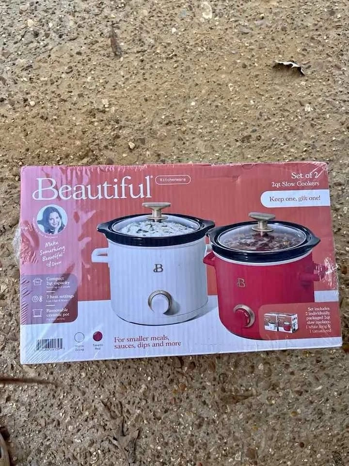 Brand new, sealed, and giftable. Comes with 2 slow cookers, each 2qt, in red and white. Perfect for your kitchen!