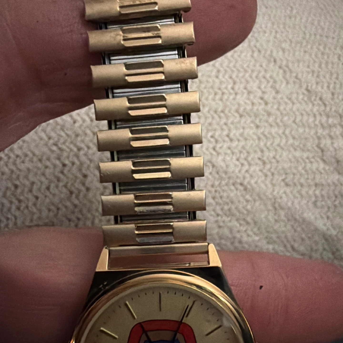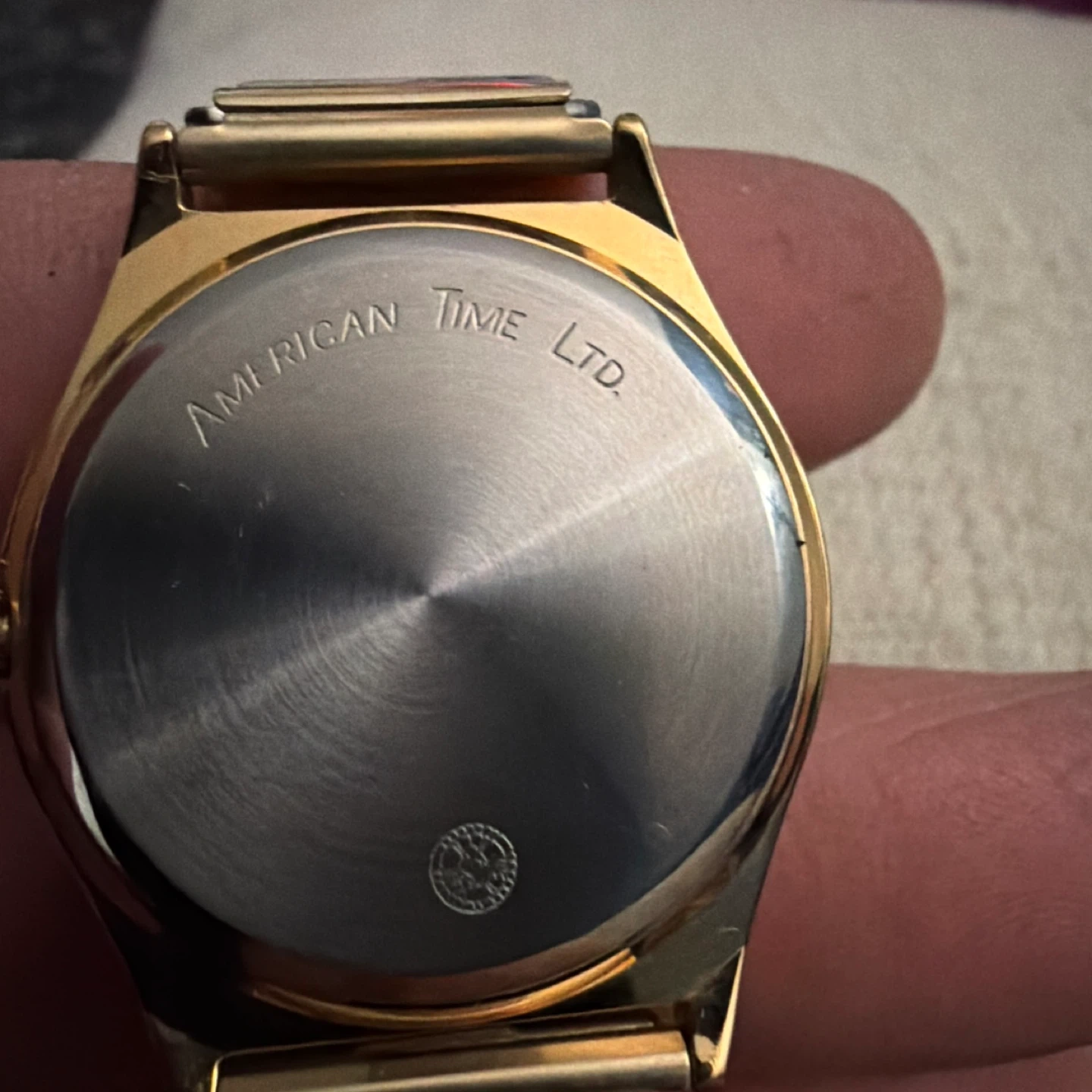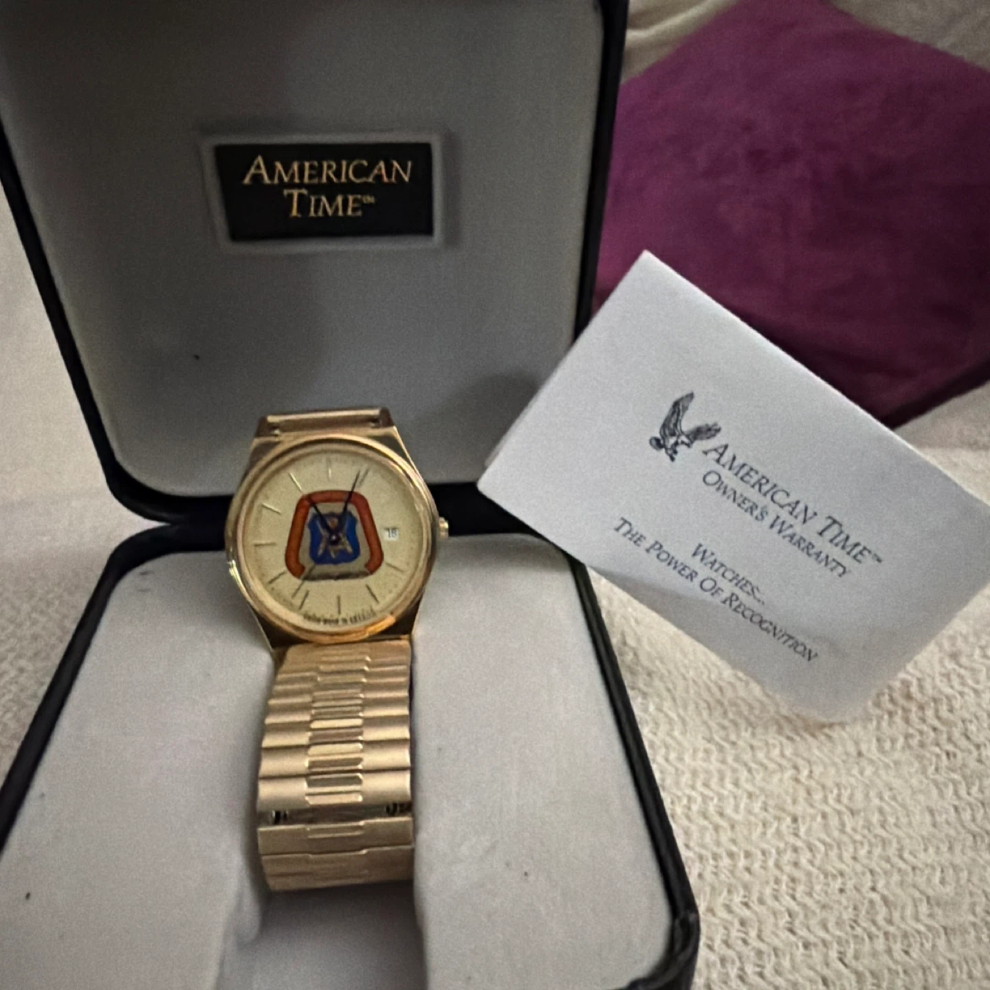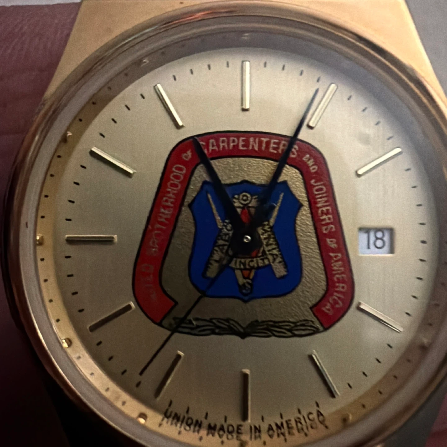 This American Time watch features the logo for the United Brotherhood of Carpenters and Joiners of America. It's gold-toned with a date window. It comes in its original box with owner's warranty information. Union made in America!